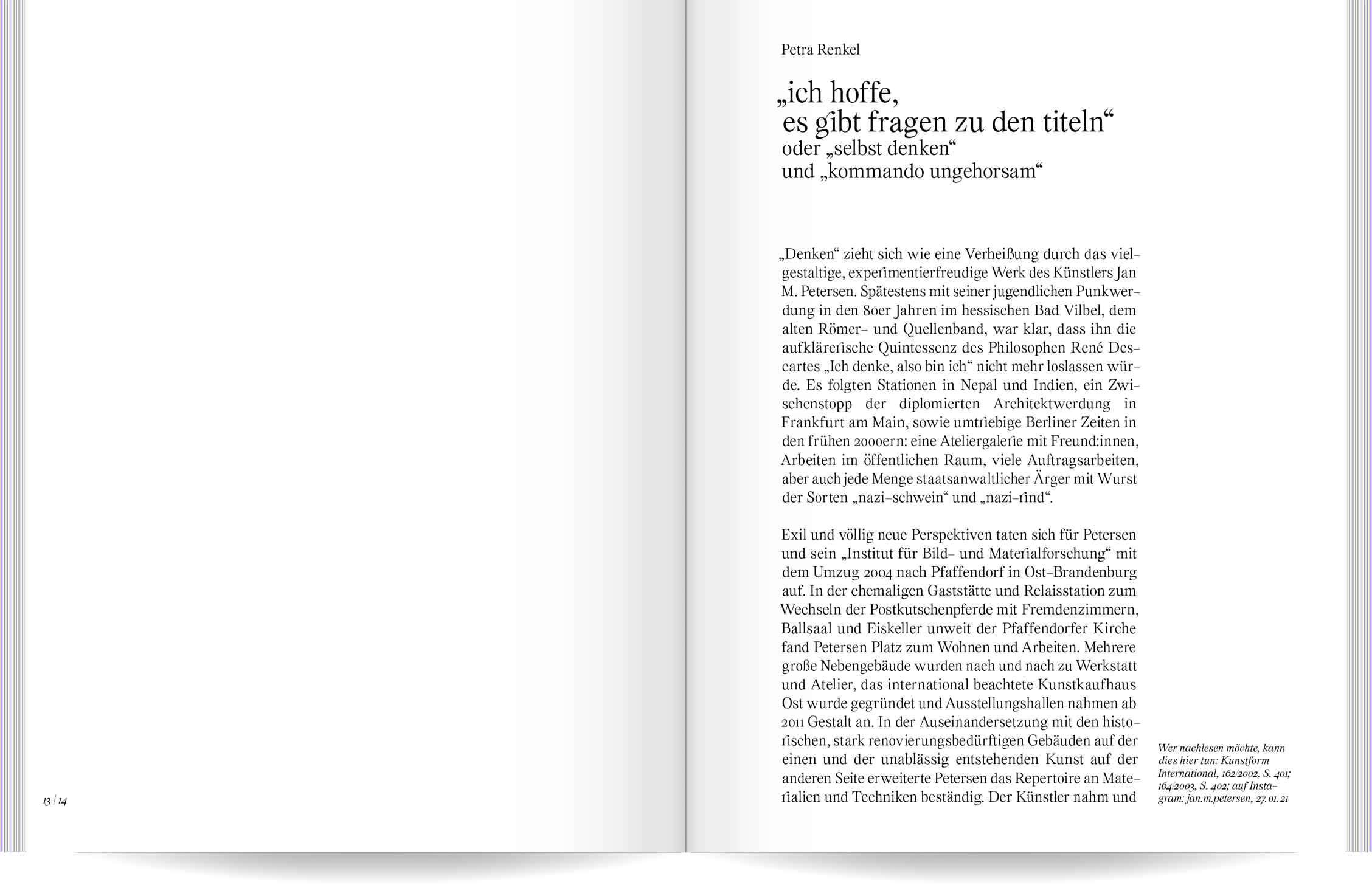 Bereits zum 13. Künstlerjubiläum von Jan M. Petersen haben wir eine Werkschau gestaltet — und entwickeln auch anlässlich seines 25-jährigen Wirkens eine Buchgestaltung für den renommierten Brandenburger Künstler. Herausgekommen ist ein in Format und Umfang doppelt so dickes Werk: Der Wälzer zeigt auf rund 400 Seiten Jans Schaffen der vergangenen zehn Jahre und gibt Einblicke in seine Werk- und Lebensstätte sowie zahlreiche Schauen.
