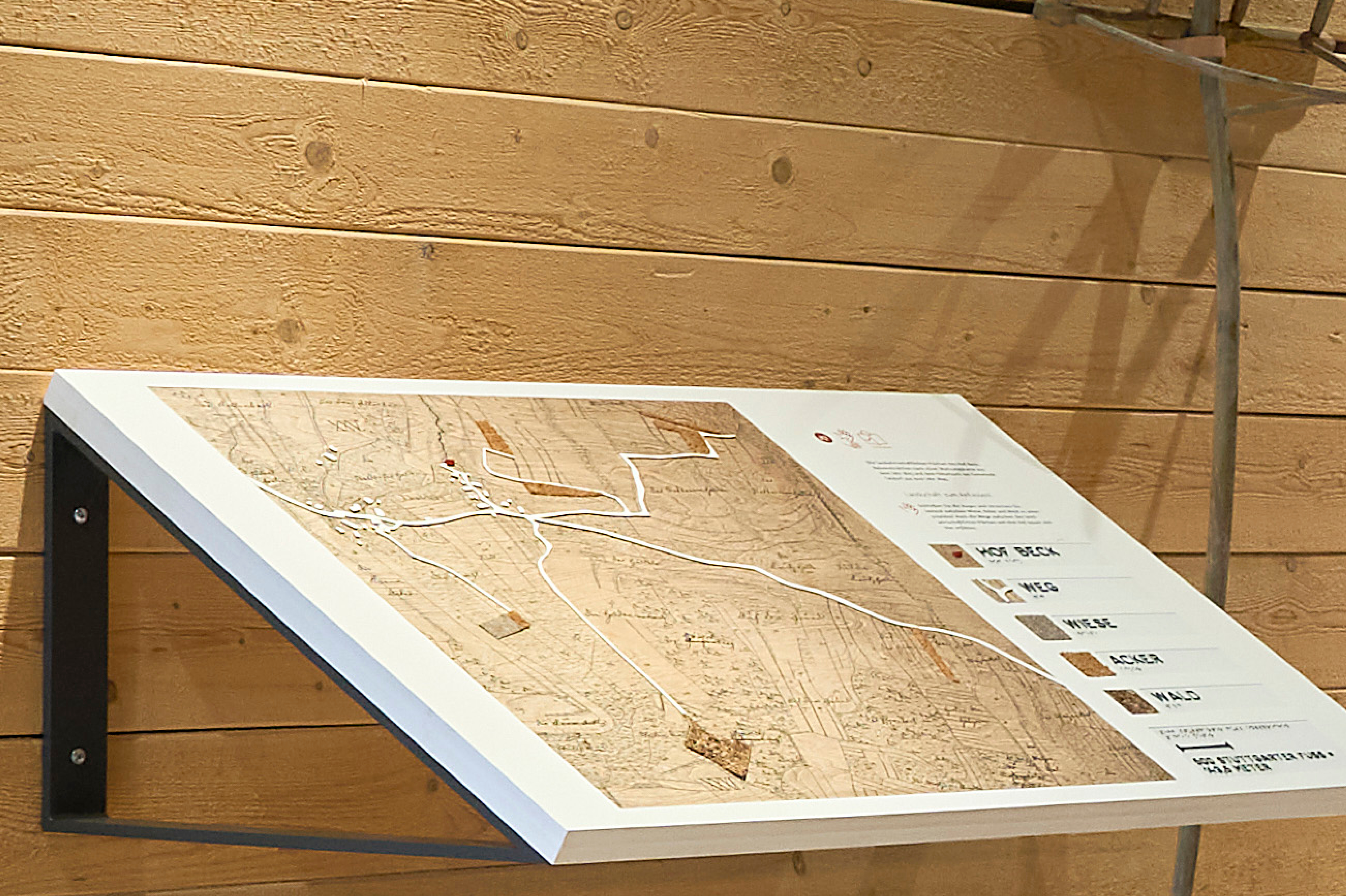 Für blinde Besuchende haben wir ein tastbares Umgebungsmodell entwickelt; es vermittelt einen Eindruck, wie der Hof Beck um 1900 in die Gemeinde Taldorf und Umgebung eingebettet lag. Häuser und Straßen sind erhoben und tastbar, sowie die unterschiedlichen Flurstücke, die von den Becks bewirtschaftet wurden: Waldstücke sind in Kork eingelassen, Wiese in Filz und Ackerflächen sind als Kokosfasern fühlbar. Grundlage ist eine historische Karte, die auf das Holzmodell gelasert wurde.