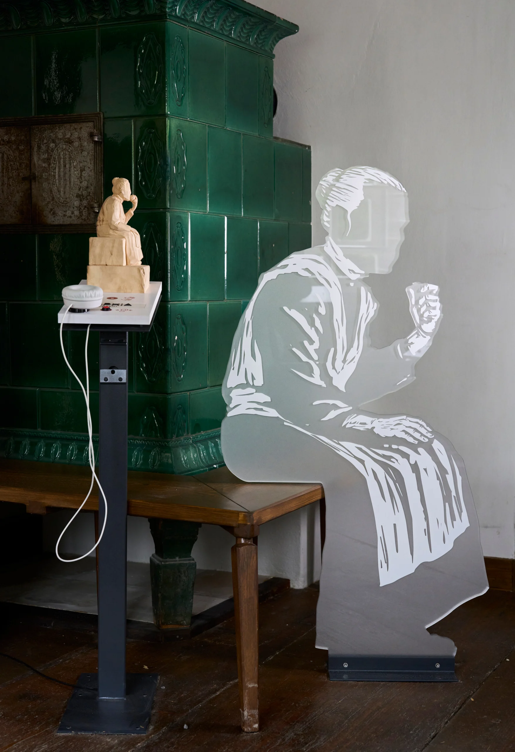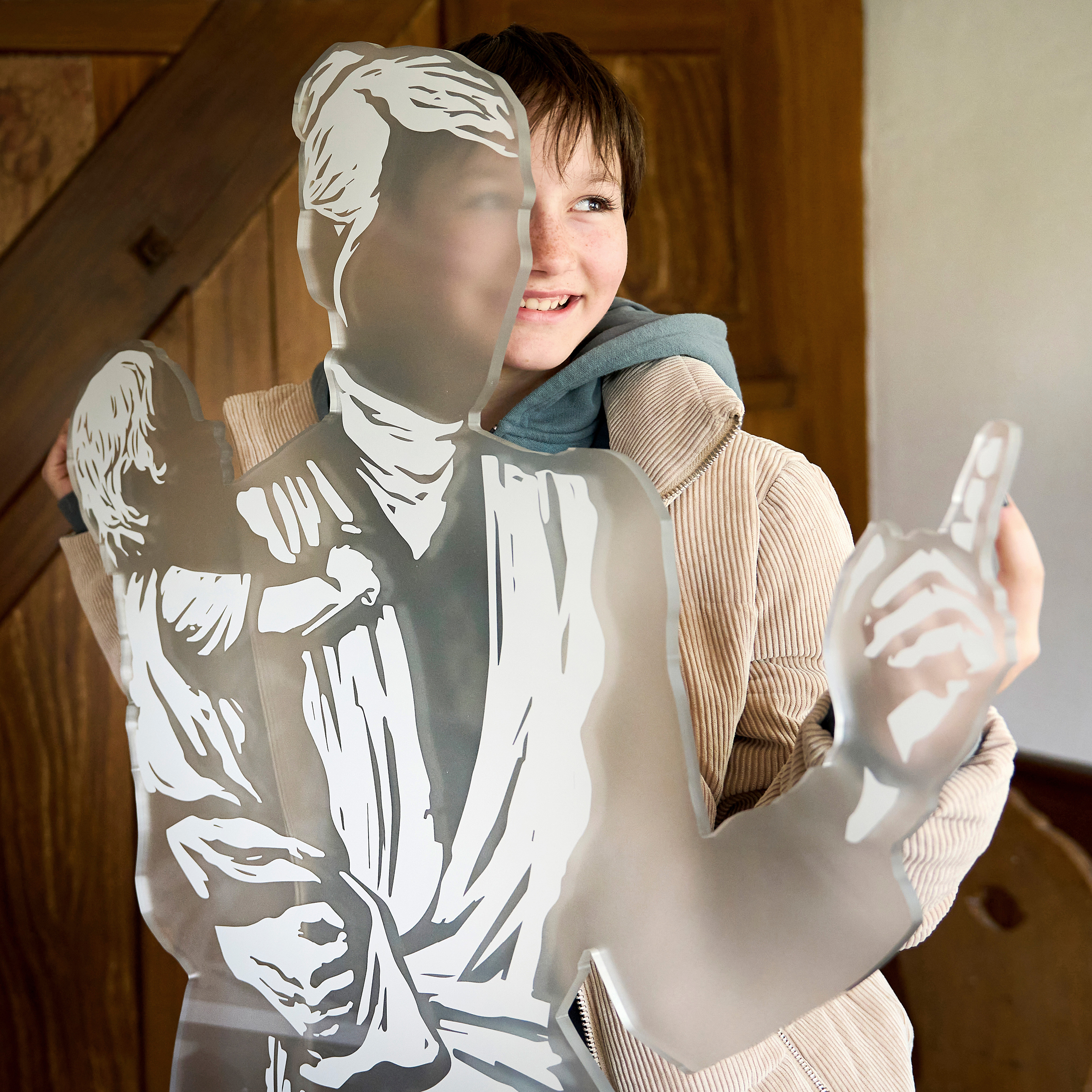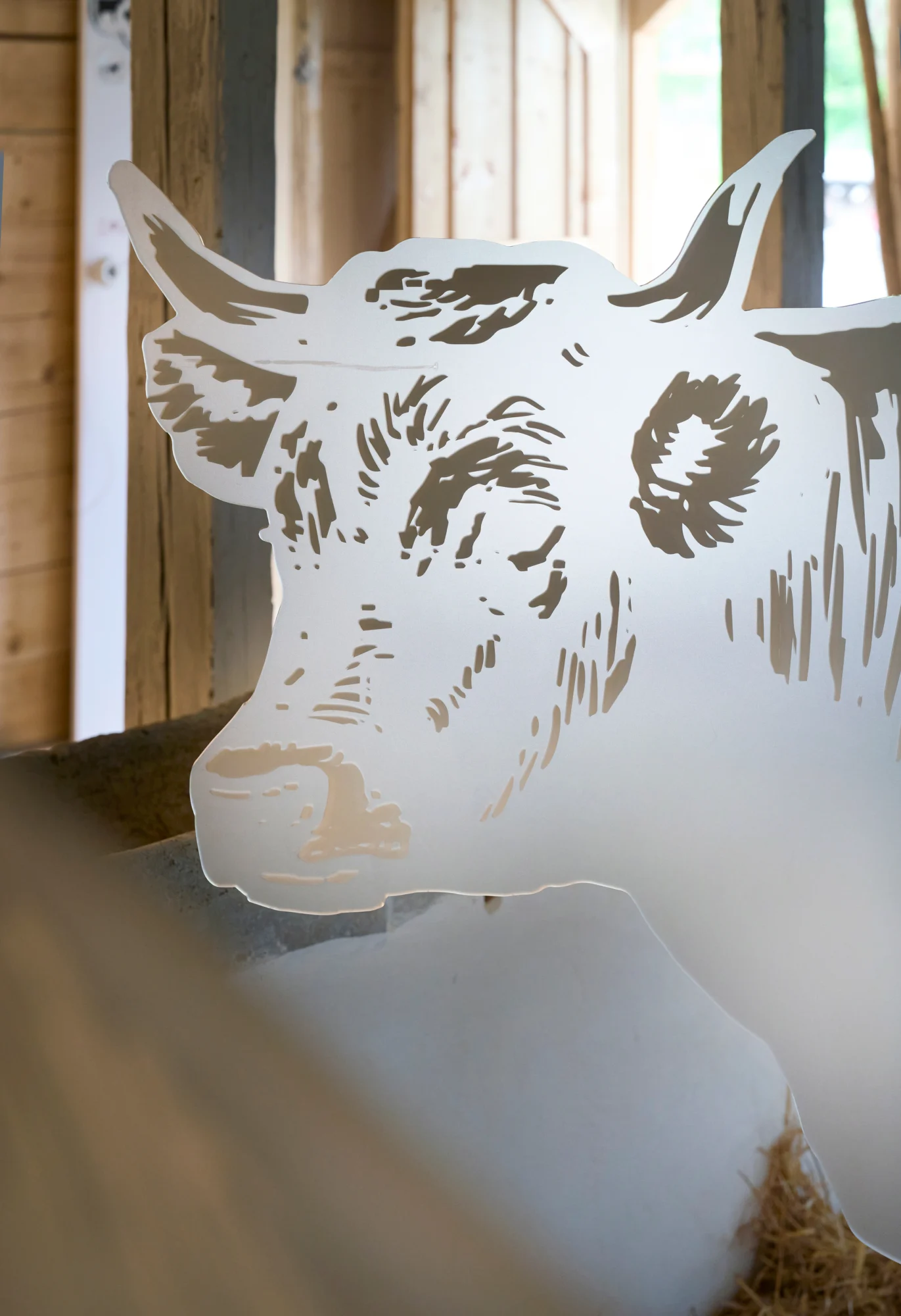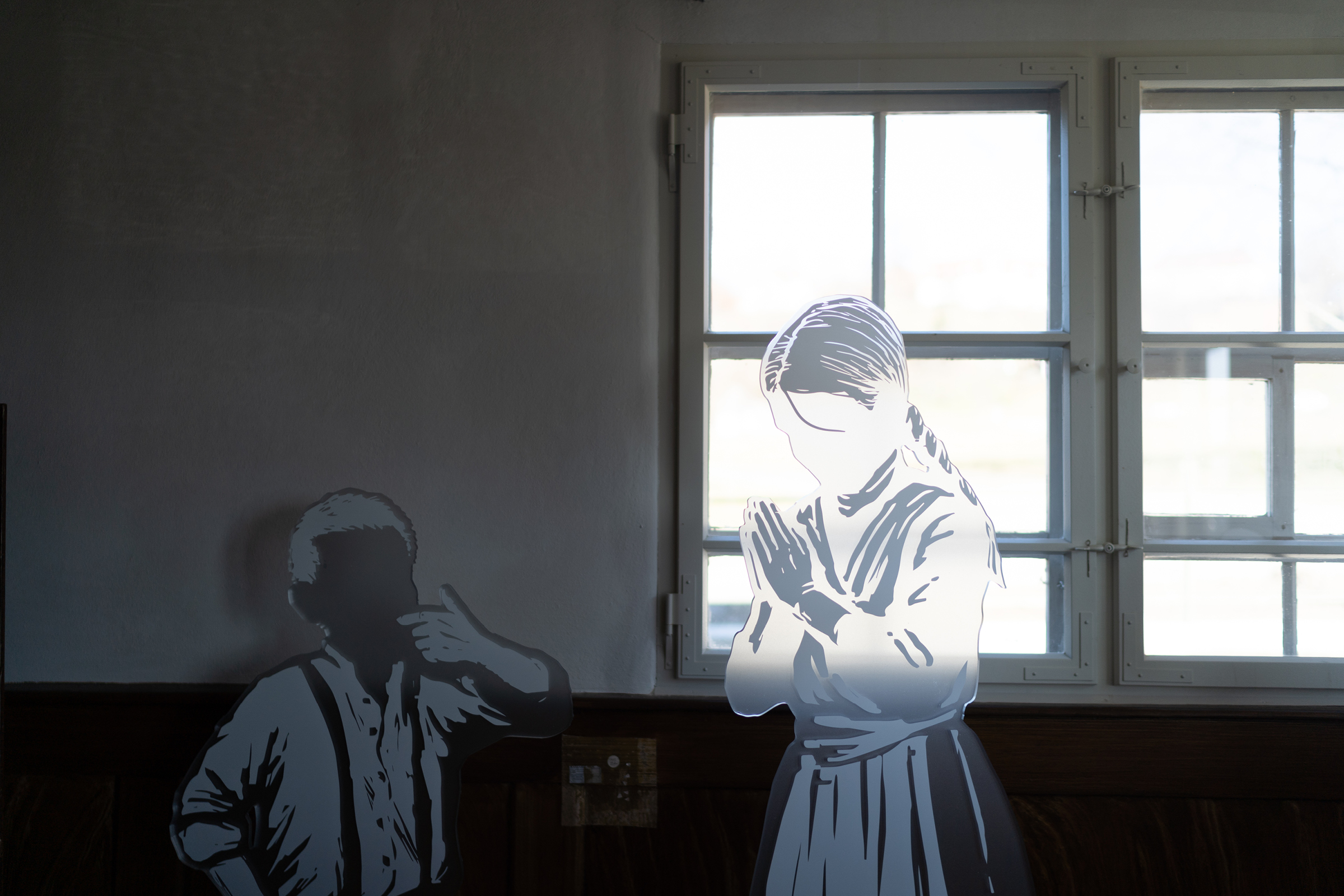 Die Personen-Zeichnungen skalieren wir auf Lebensgröße und drucken sie auf Plexiglas. Damit holen wir sie ins Heute, auf die Vermittlungsebene. Zwölf Pexiglasfiguren und zahlreiche Tiere wie Hühner, Kühe, Schweine, ein Pferd und eine Ziege bevölkern Haus und Ställe.