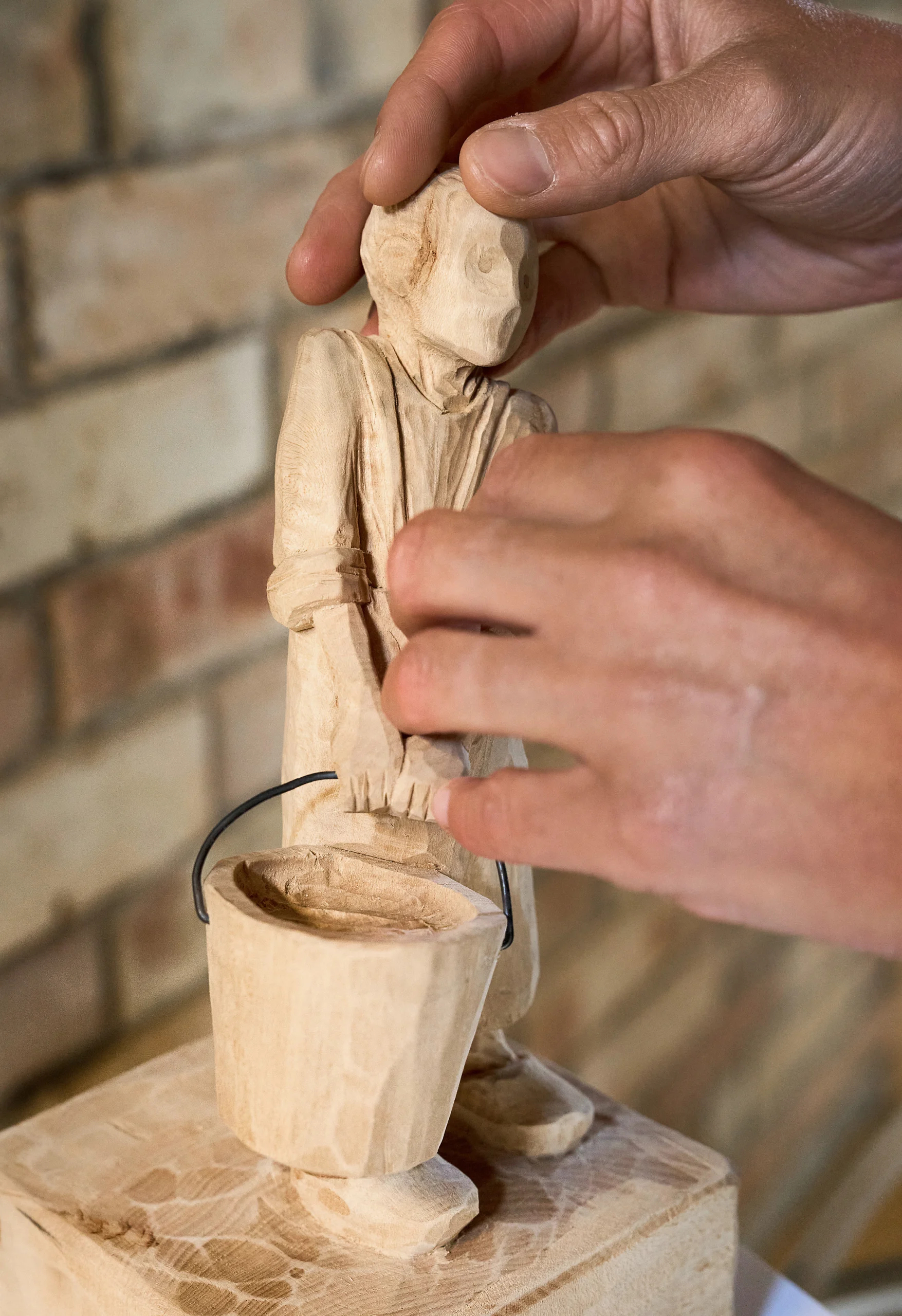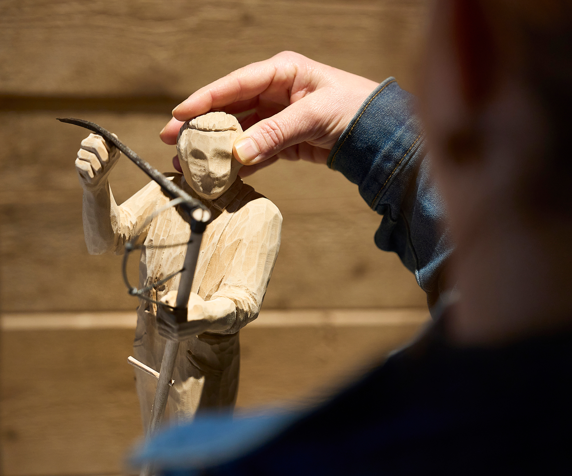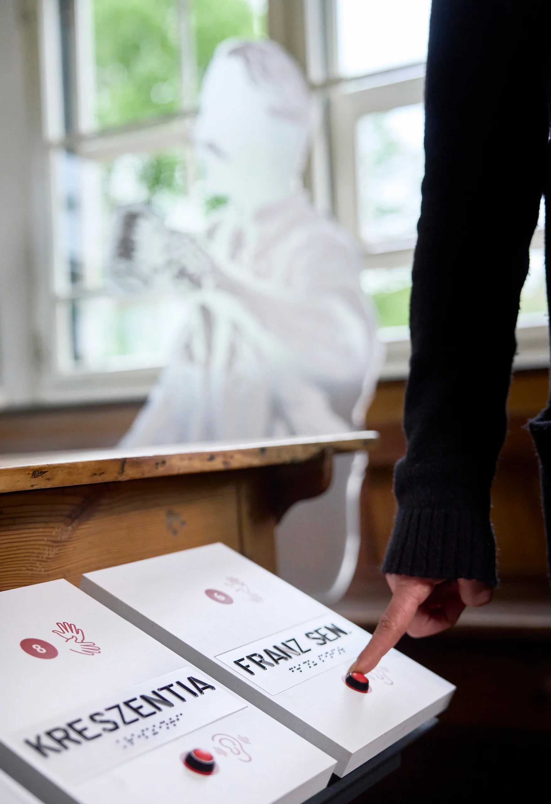 Sowohl die sachlichen Themen-Texte auf den Stelen, als auch die charmant im Dialekt eingesprochenen Wort-Beiträge der Familie Beck gibt es für blinde Besuchende als Audios. Zusätzlich kommen tastbare Braille- und Profilschriften zum Einsatz. Und wir ermöglichen blinden Besuchenden einen figürlichen Eindruck der Protagonist:innen mittels geschnitzter, tastbarer Skulpturen.