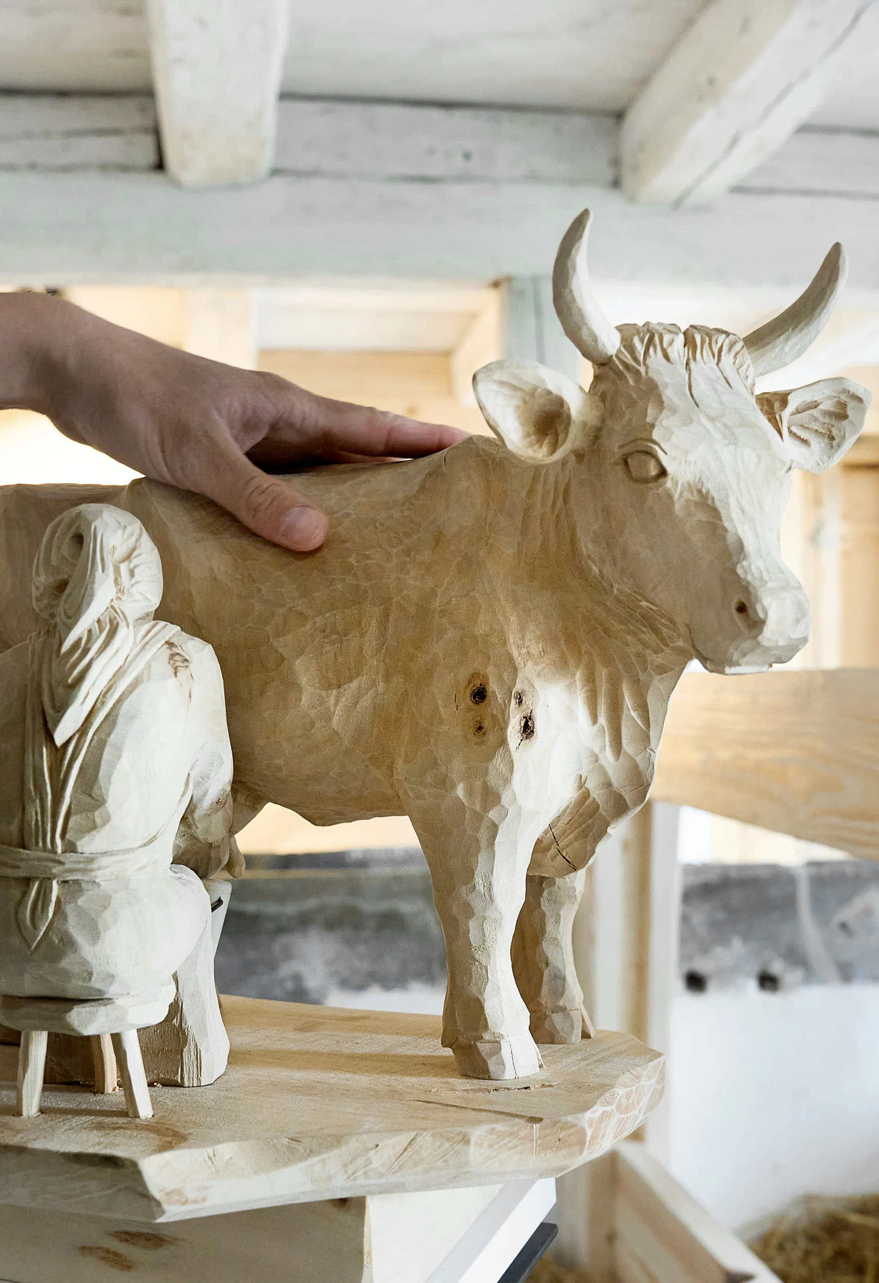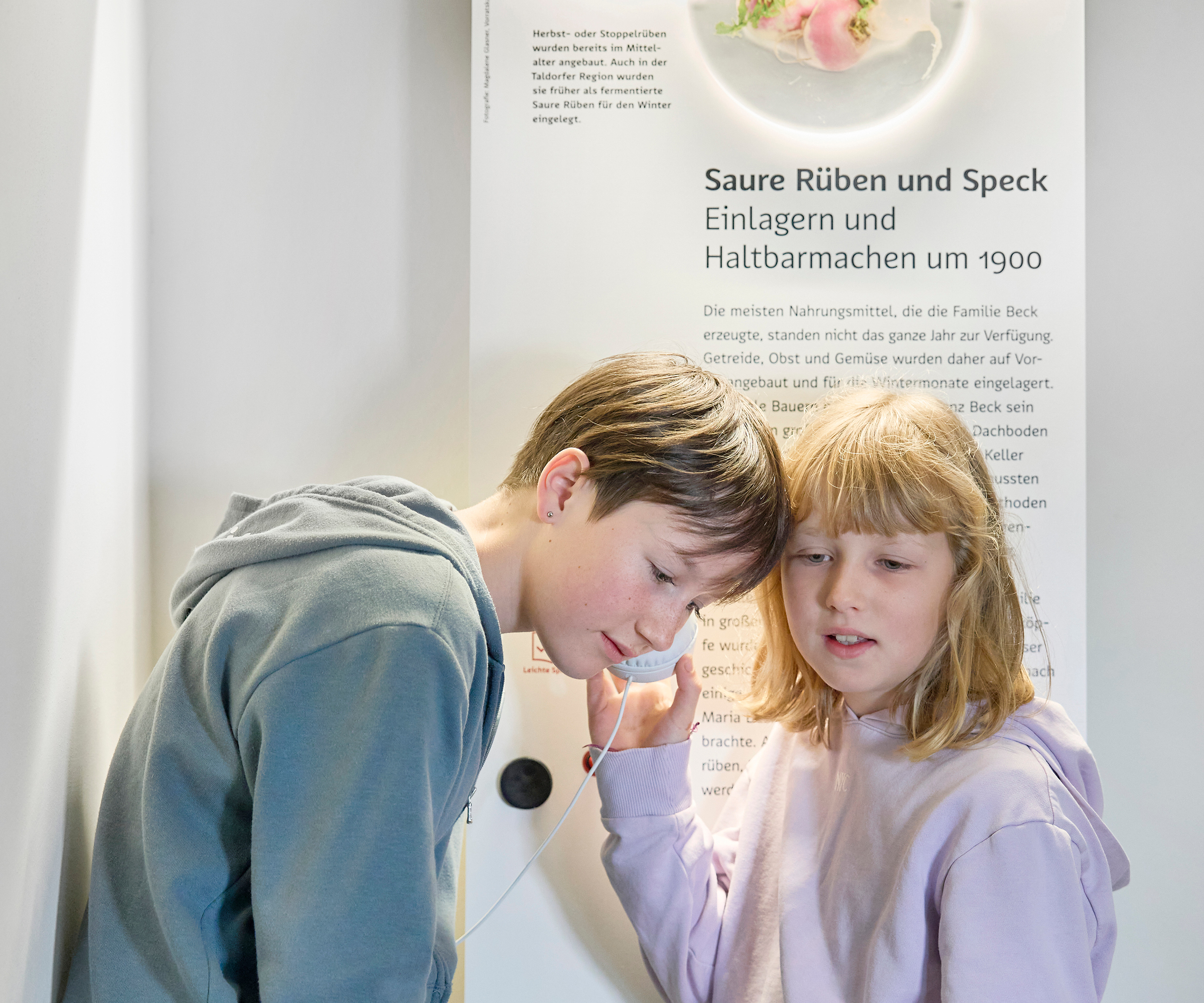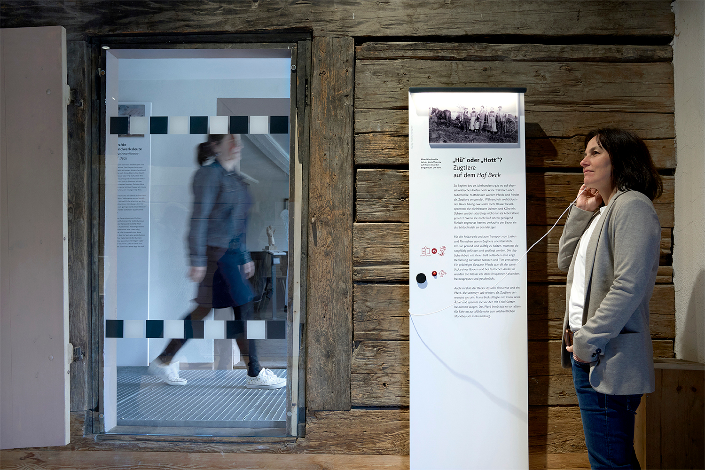 Das Storytelling-Konzept für die Ausstellung haben wir weitgehend inklusiv gedacht: Lebensgroße Figuren der Familie Beck erzählen uns über Audiospuren – emotional auf schwäbisch eingesprochene – Geschichten aus dem bäuerlichen Alltag um 1900. Für blinde Besuchende haben wir jedes Familienmitglied ein Mal aus Holz als tastbare Figur schnitzen lassen und zum Befühlen neben den entsprechenden Aufsteller montiert. Die Audios sind über große Tasten abrufbar und für blinde Besuchende mit Braille- und Profilschrift versehen. Schön ist, dass das feine, haptische Erlebnis gleichermaßen von Blinden und Sehenden genossen wird.