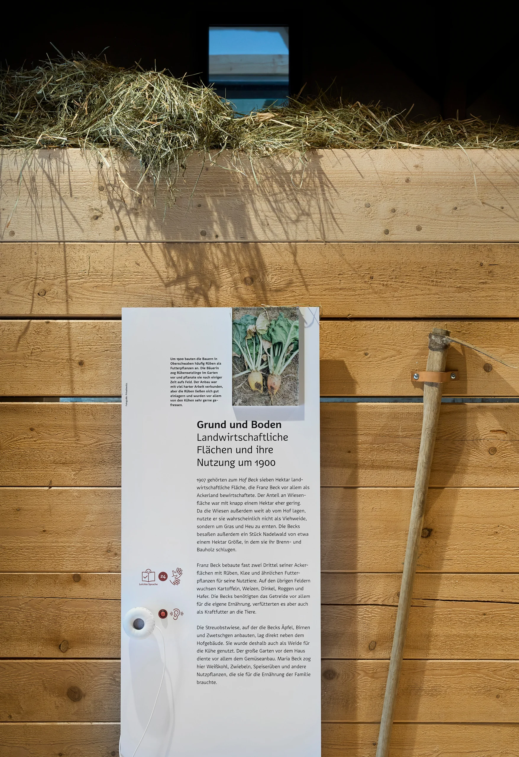 In den historischen Räumen des auf das Gelände translozierten Bauernhofs erzählen wir Geschichten rund um die Familie Beck, die das Anwesen um 1900 bewirtschaftet hat. In Wohnhaus, Ställen und auf dem umliegenden Gelände berichten wir von den Herausforderungen einer kleinbäuerlichen Landwirtschaft und geben individuelle Einblicke in den Alltag der Eheleute Maria und Franz Beck und ihrer drei Kinder. Die Dauerausstellung haben wir so weit wie möglich inklusive gestaltet — ein Großteil der Inhalte lässt sich über mehrere Sinne erfassen.