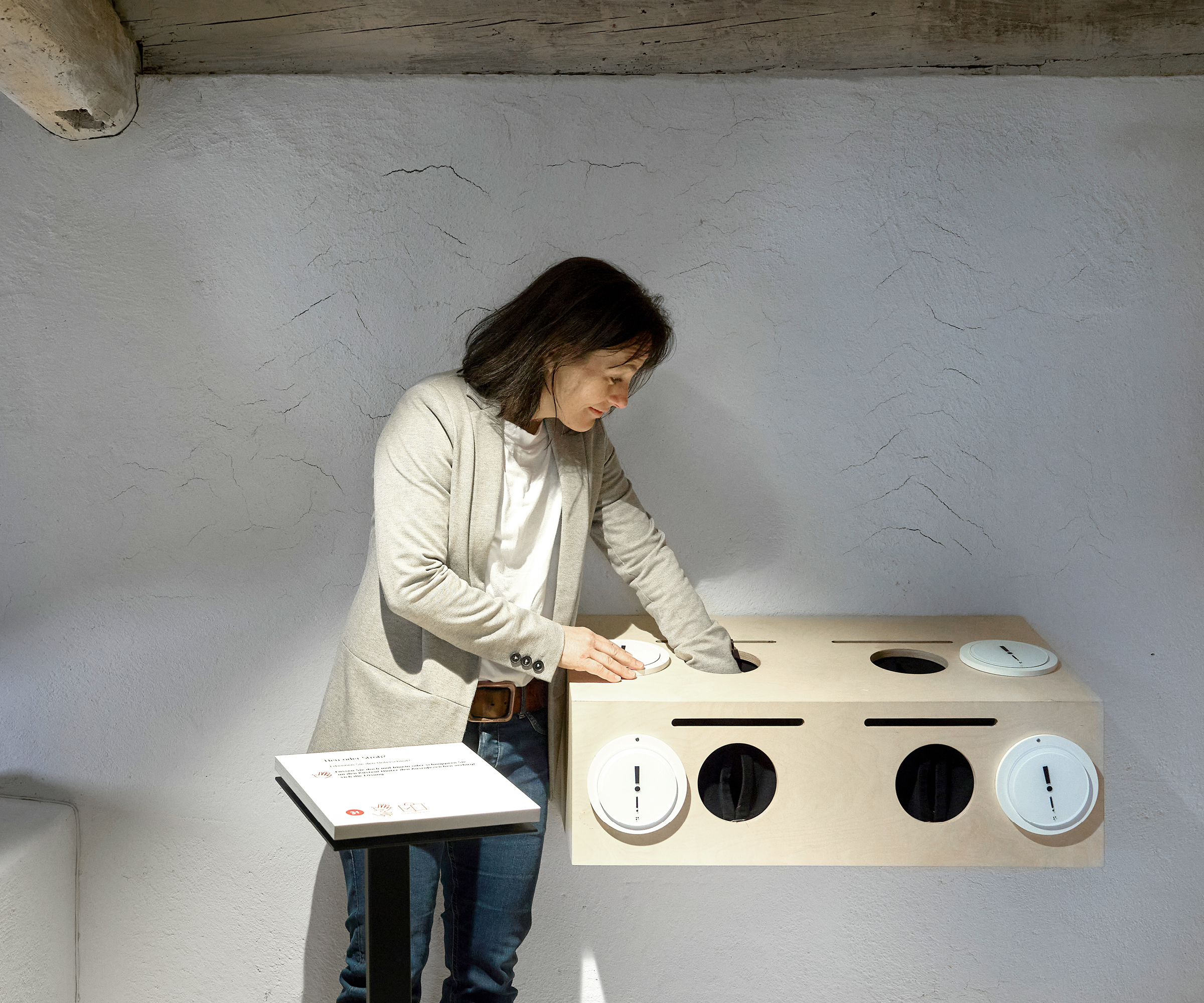 Für mobil eingeschränkte Menschen, die die enge, steile Treppe ins Obergeschoss nicht bezwingen können, machen wir die oberen Räume im Erdgeschoss zugänglich: Wir haben ein höhenverstellbares, unterrollbares Modell des Wohnhauses gebaut, bei dem man durch die Fenster in die Schlafzimmer der Becks spickeln kann. Der Blick in die „Guckis“ macht die oberen Räume detailliert und sogar dreidimensional erfahrbar. Hier haben wir Stereofotografie eingesetzt — eine Technik, mit der bereits um 1850 die räumliche Wahrnehmung von Bildern erzeugt wurde. Zu den Räumen gibts die entsprechenden Ausstellungstexte und Familien-Geschichten zum Anhören über Hörmuscheln. Die „analoge VR“ entstand in Zusammenarbeit mit Markus Bader-Rampas, der auch Detailplanung und Stereofotografie übernommen hat.