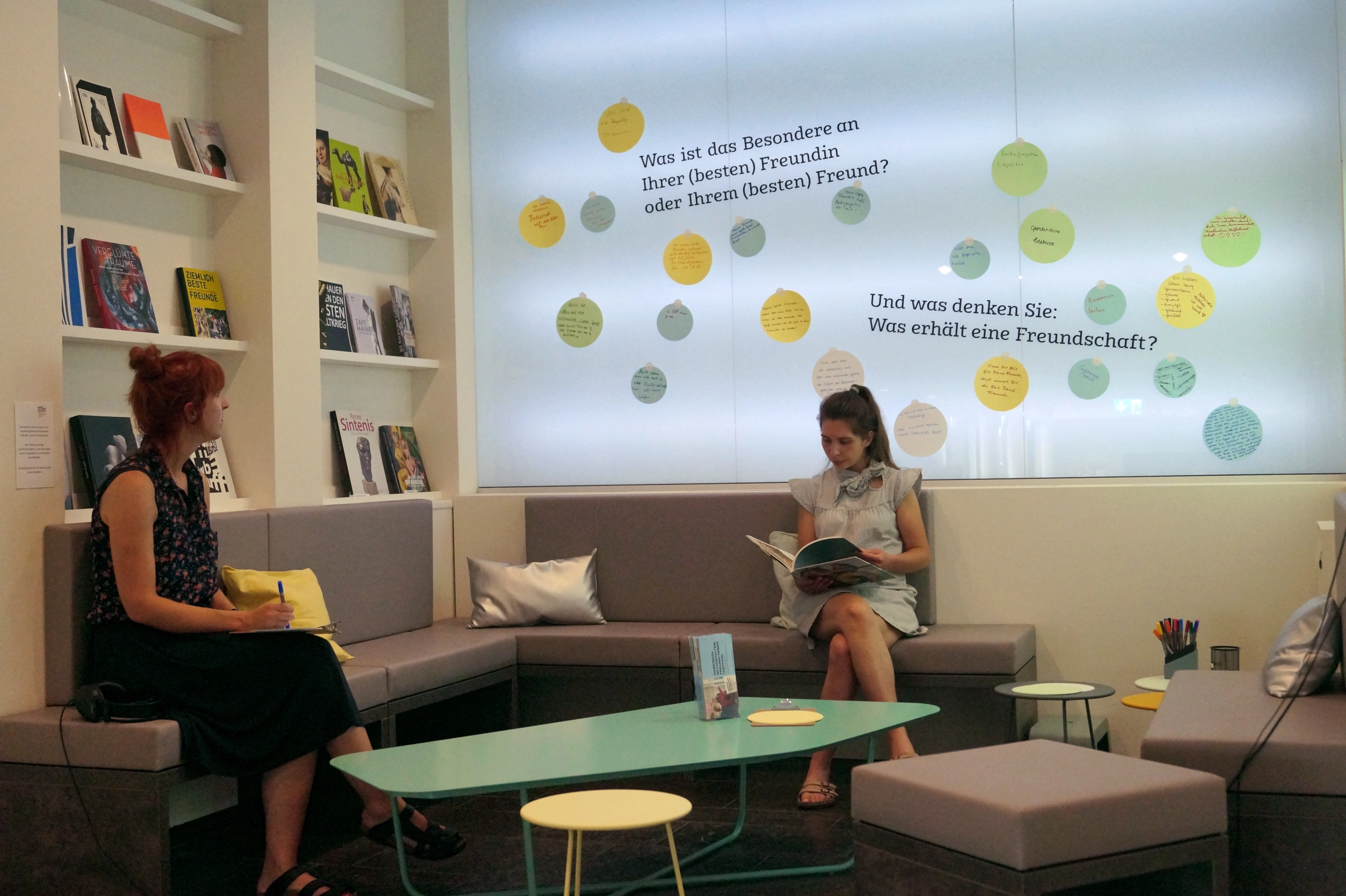 Gezaubert haben wir eine Lese-, Lausch- und Feedback-Lounge, die mittlerweile liebevoll „kleiner Salon“ genannt wird: Ein Bücherregal bietet eine Auswahl im Shop erhältlicher Publikationen zum Schmökern. Auf einem Screen können Begleit-Videos zur Sonderausstellung angesehen werden. Und eine indirekt beleuchtete Feedbackwand lädt Besucher:innen ein, die eigenen Gedanken zur laufenden Schau kundzutun.