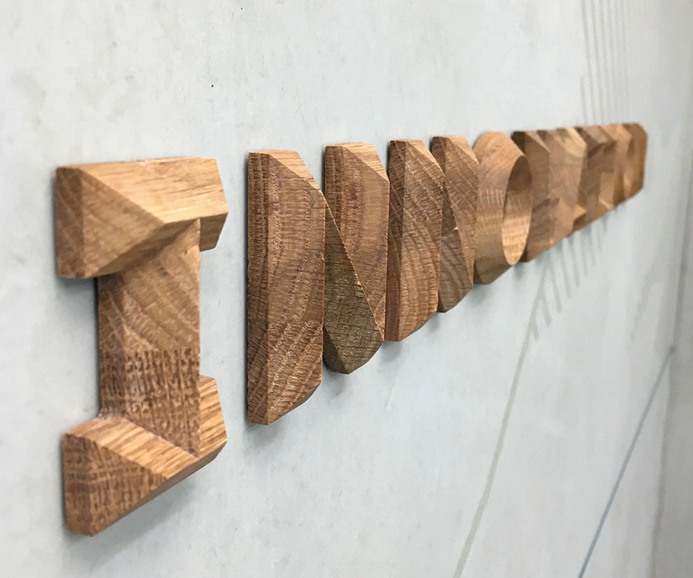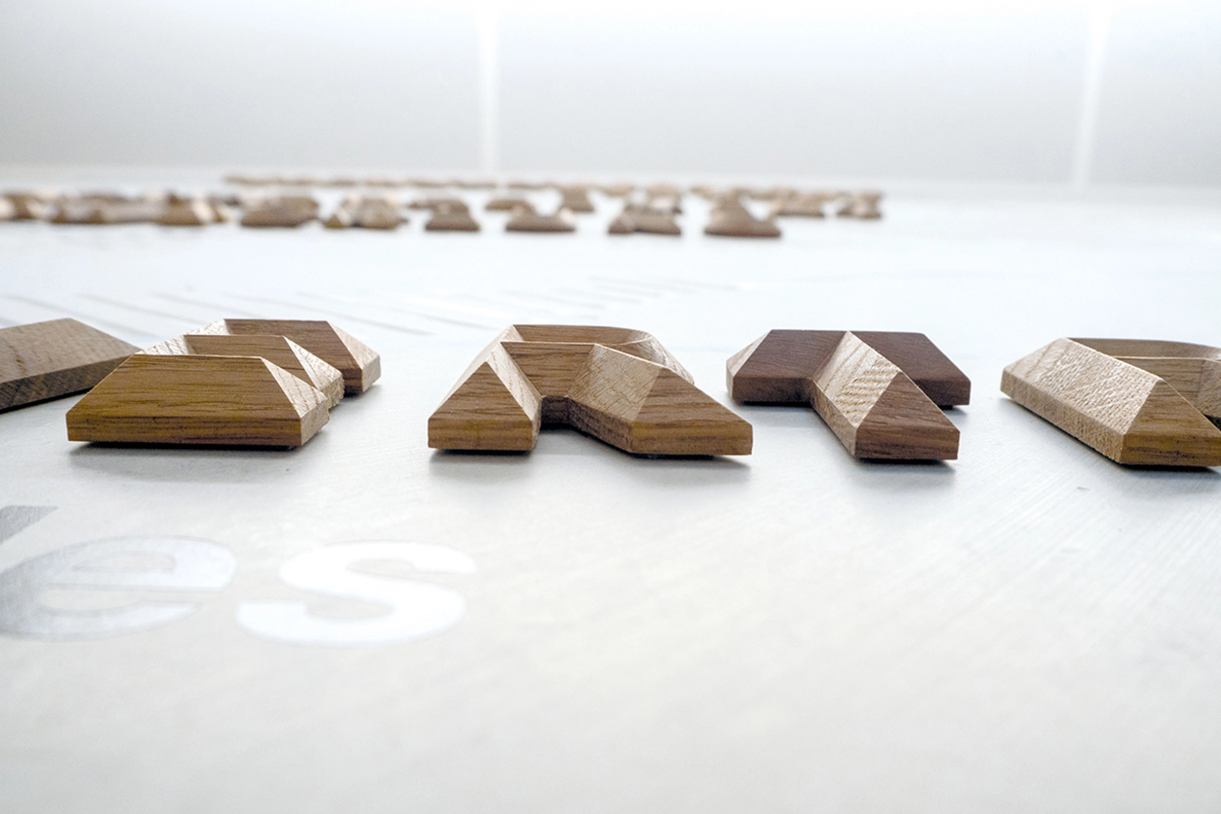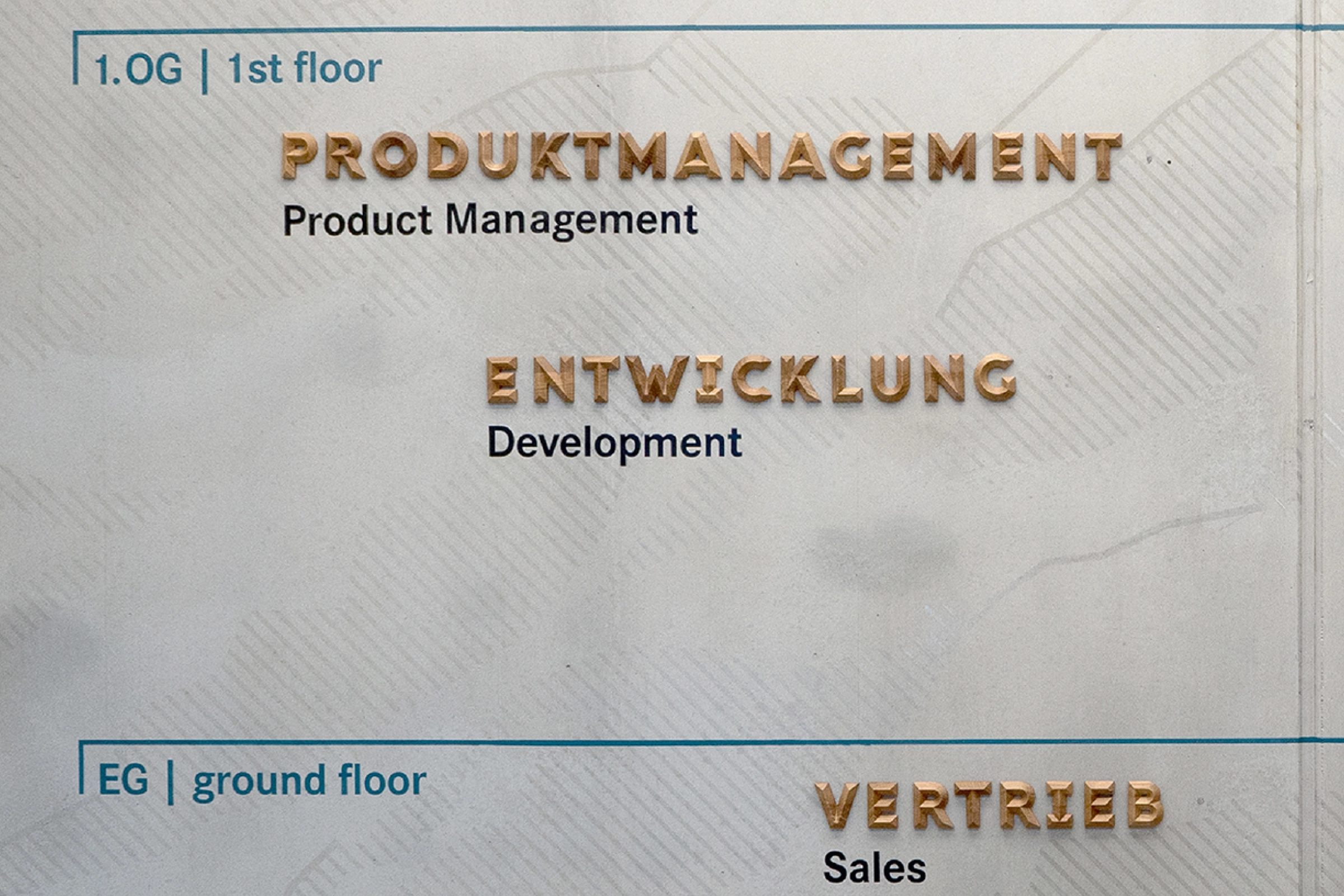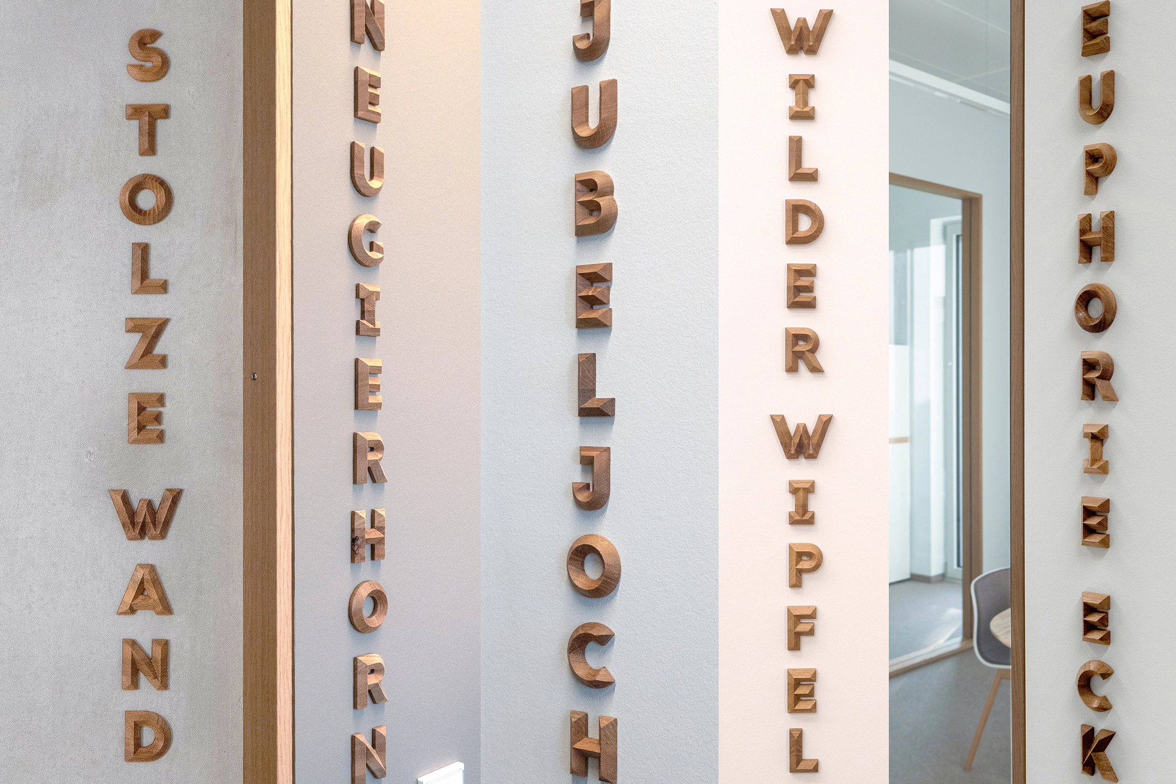 Konferenzräume haben wir mit poetisch klingenden, auf Gebirge verweisende Phantasie-Namen bezeichnet. Meetings finden beispielsweise auf dem „Jubeljoch“, der „Stillen Kuppe“, auf dem „Euphorie Eck“ oder dem „Kreativgipfel“ statt. Vertikal gesetzt nehmen die Holzbuchstaben die Bewegungsrichtung des Kletterns auf.