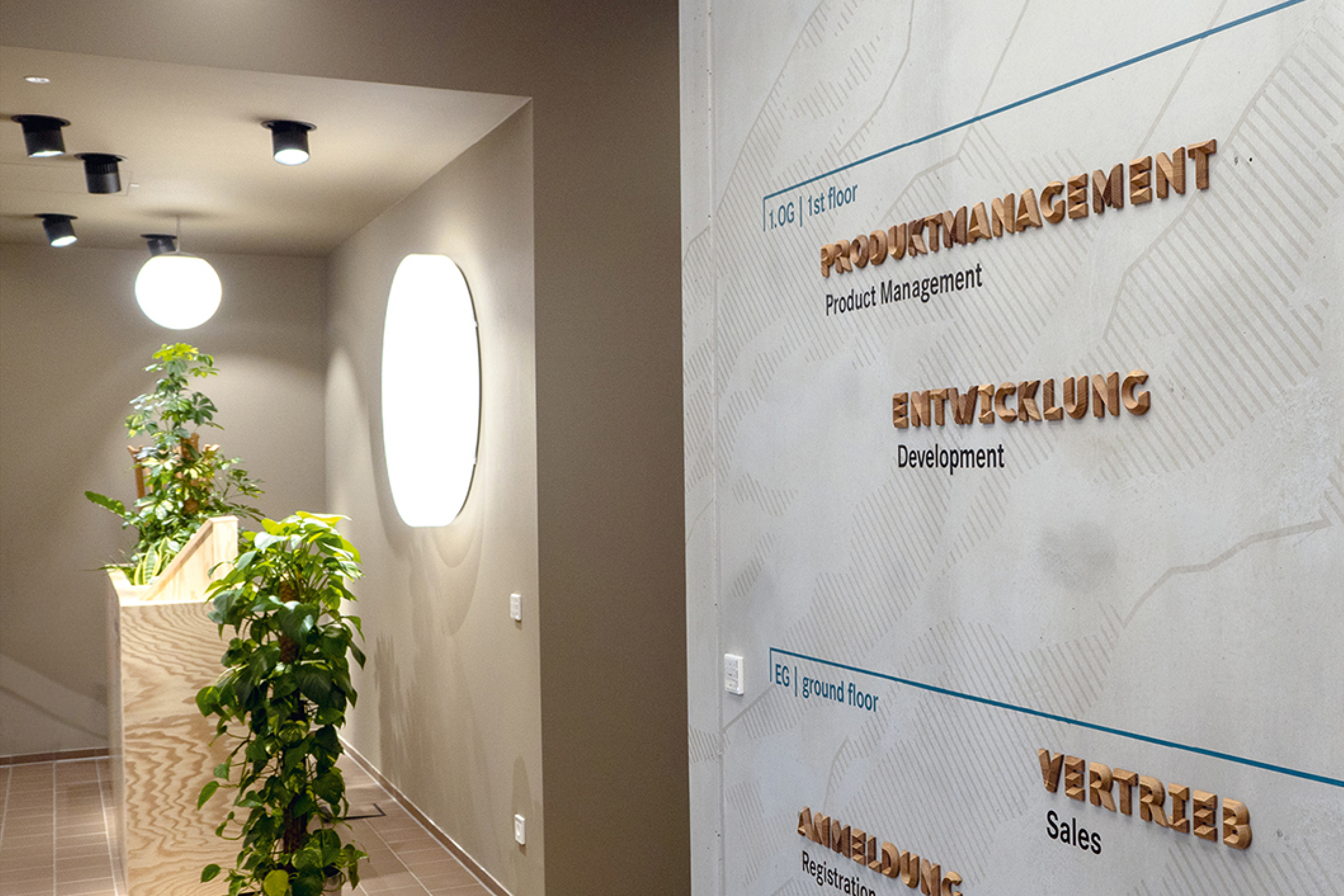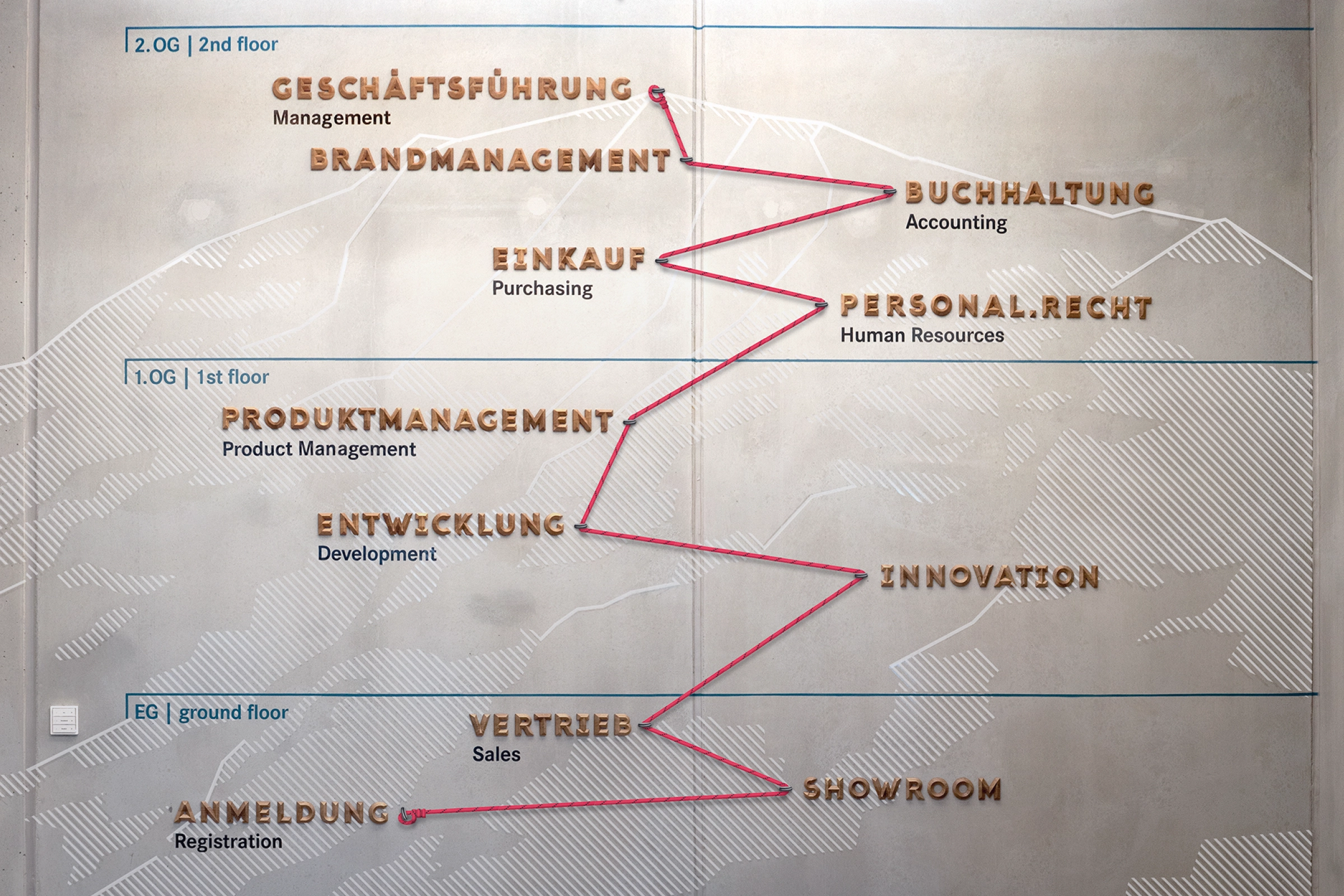 In plakativen Stockwerkübersichten kommt die Sektor E zum Einsatz: Über Betonwände in Foyer und Treppenhaus ziehen wir eine grafische Abbildung des Hochgrats — dem Lieblingsberg vieler Isnyer:innen. Ein aufmontiertes Kletterseil markiert entlang diverser Stationen die Route vom Tal zum Gipfel — ergo von der Anmeldung im Erdgeschoss bis zur Geschäftsführung im zweiten Stock.