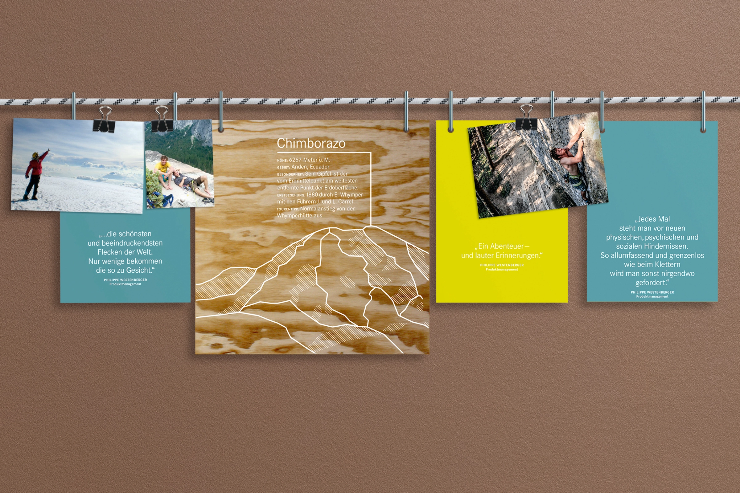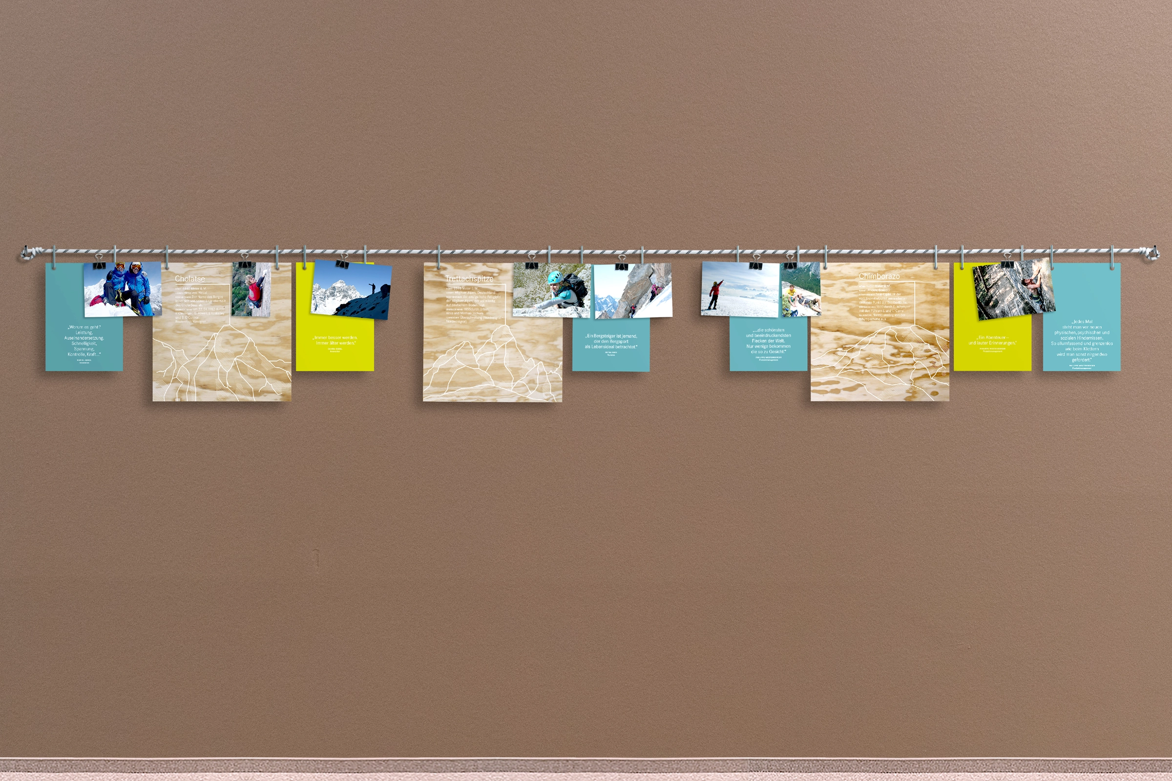 Um die kletterbegeisterten Mitarbeitenden aktiv einzubinden, bieten wir auf den Wänden in den Aufenthaltsbereichen eine Bühne für persönliche Kletter-Geschichten — in Form eines flexiblen, erweiterbaren Hänge-Systems. Um die Geschichte ins Rollen zu bringen, erfragten wir im Team zunächst bevorzugte Klettergebiete, Klettererfahrungen, sowie private Fotoaufnahmen. Und illustrierten dazu 13 Lieblingsberge. Diesen Input verarbeiteten wir zu Storys, die wir mit Kletterseilen und -haken auf die Wände bringen. Ergänzen, Kommentieren und Zweckentfremden ausdrücklich erwünscht!
