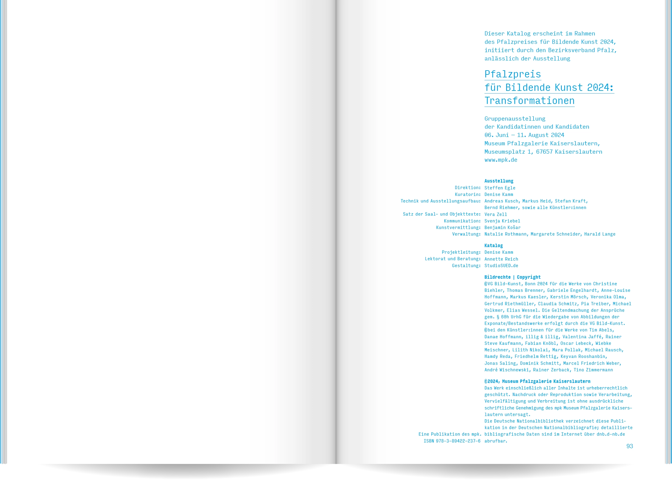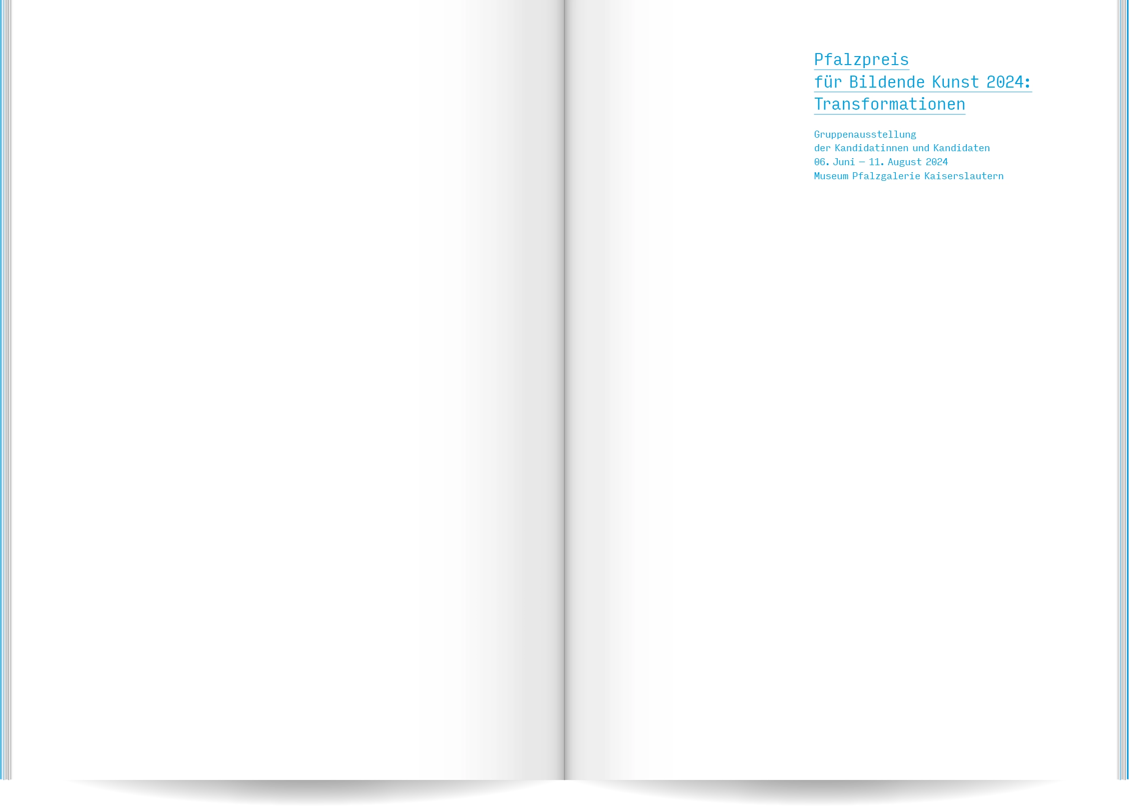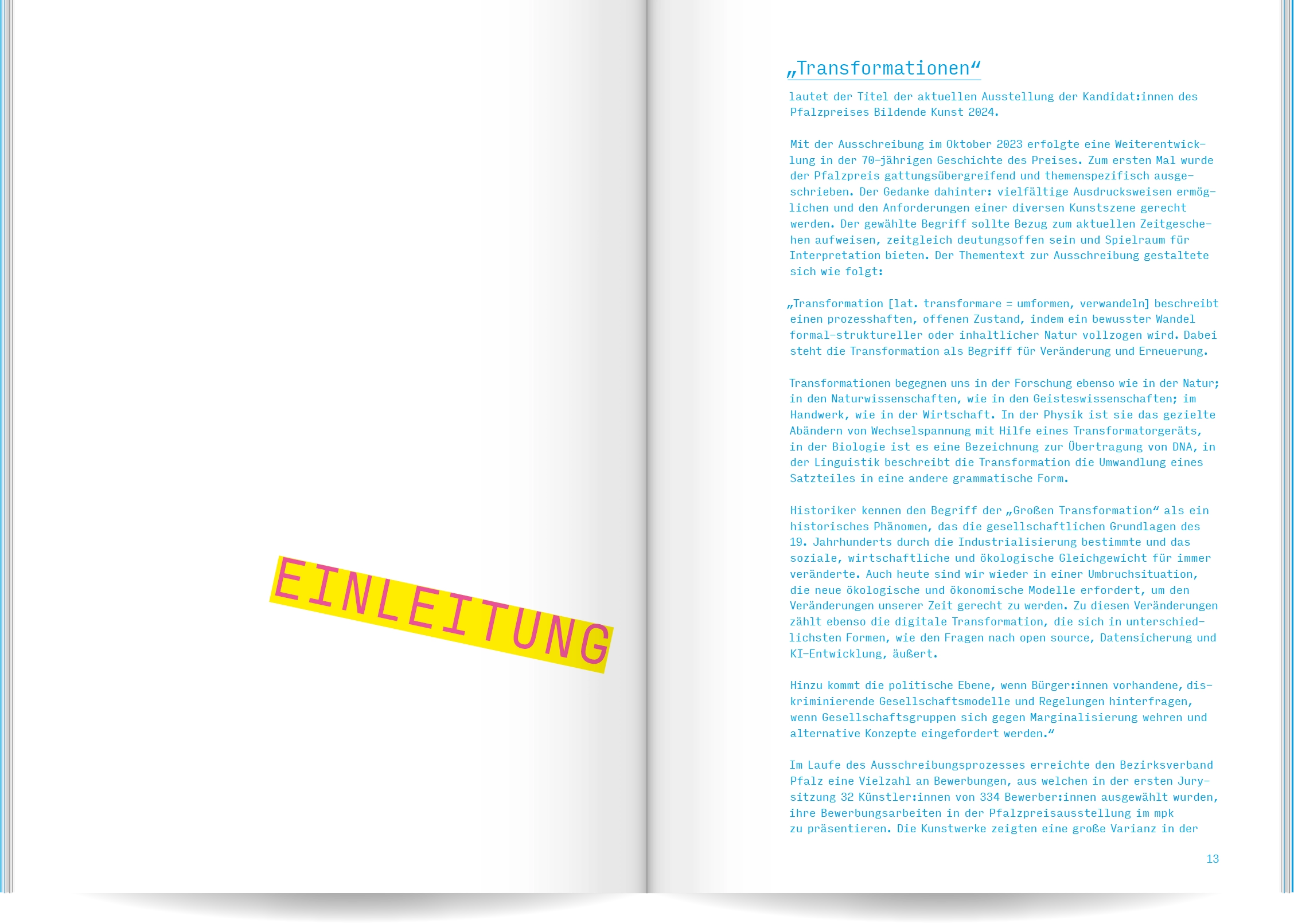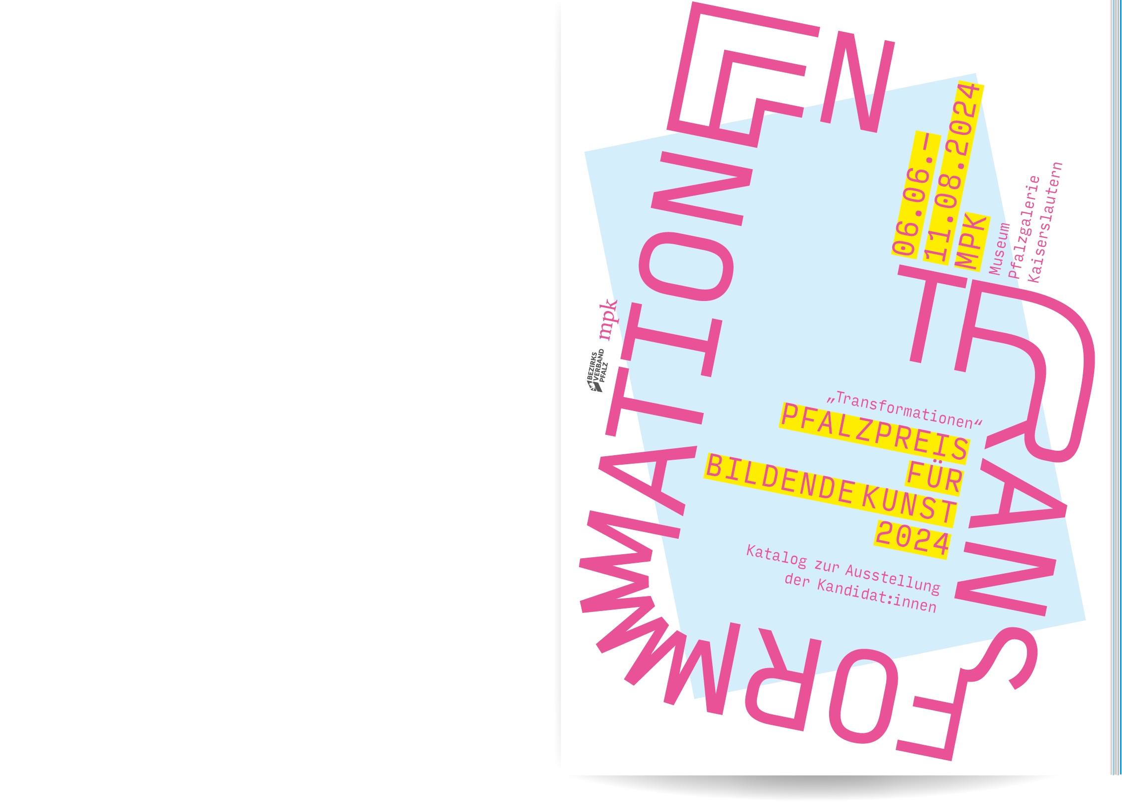 „Transformationen“ lautete das Motto des Pfalzpreises für Bildende Kunst 2024, ausgeschrieben vom Bezirksverband Pfalz. Wir durften den renommierten Preis visuell ausstatten und den umfangreichen Katalog zur Ausstellung gestalten. Auf 96 Seiten werden in vier Themengruppen die Werke der Preisträger:innen vorgestellt — in Wort und Bild, ergänzt durch eine kurze Vita. Hinzu kommen kleine Essays und Jurybegründungen.