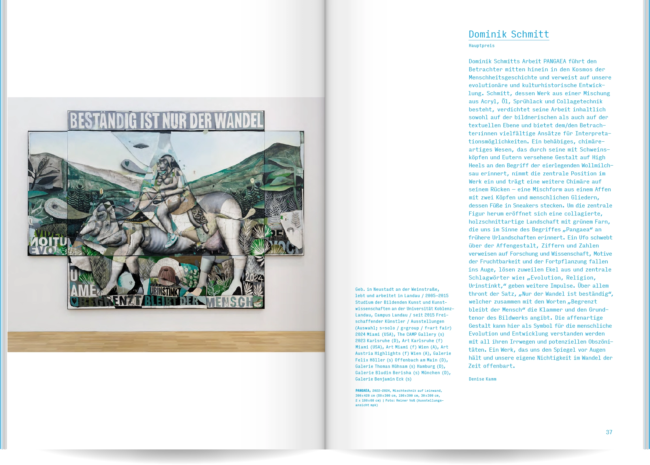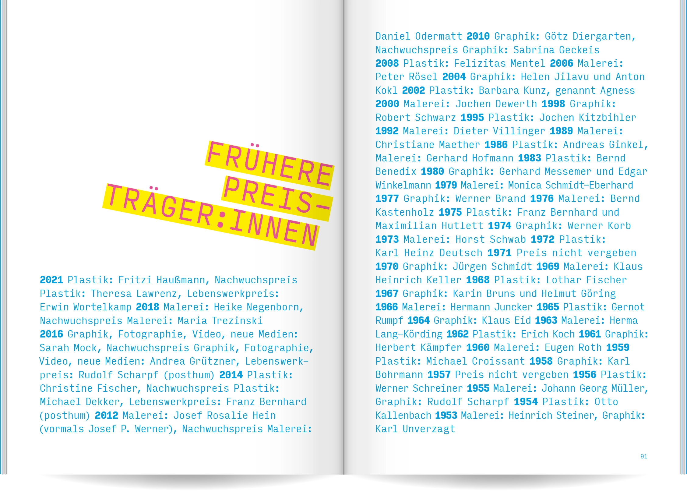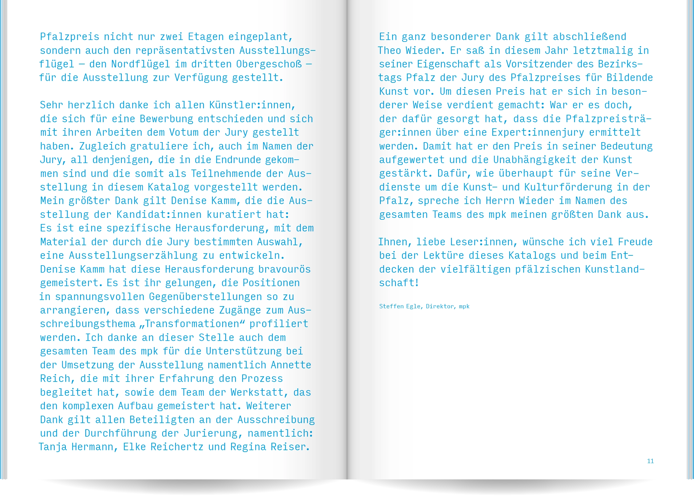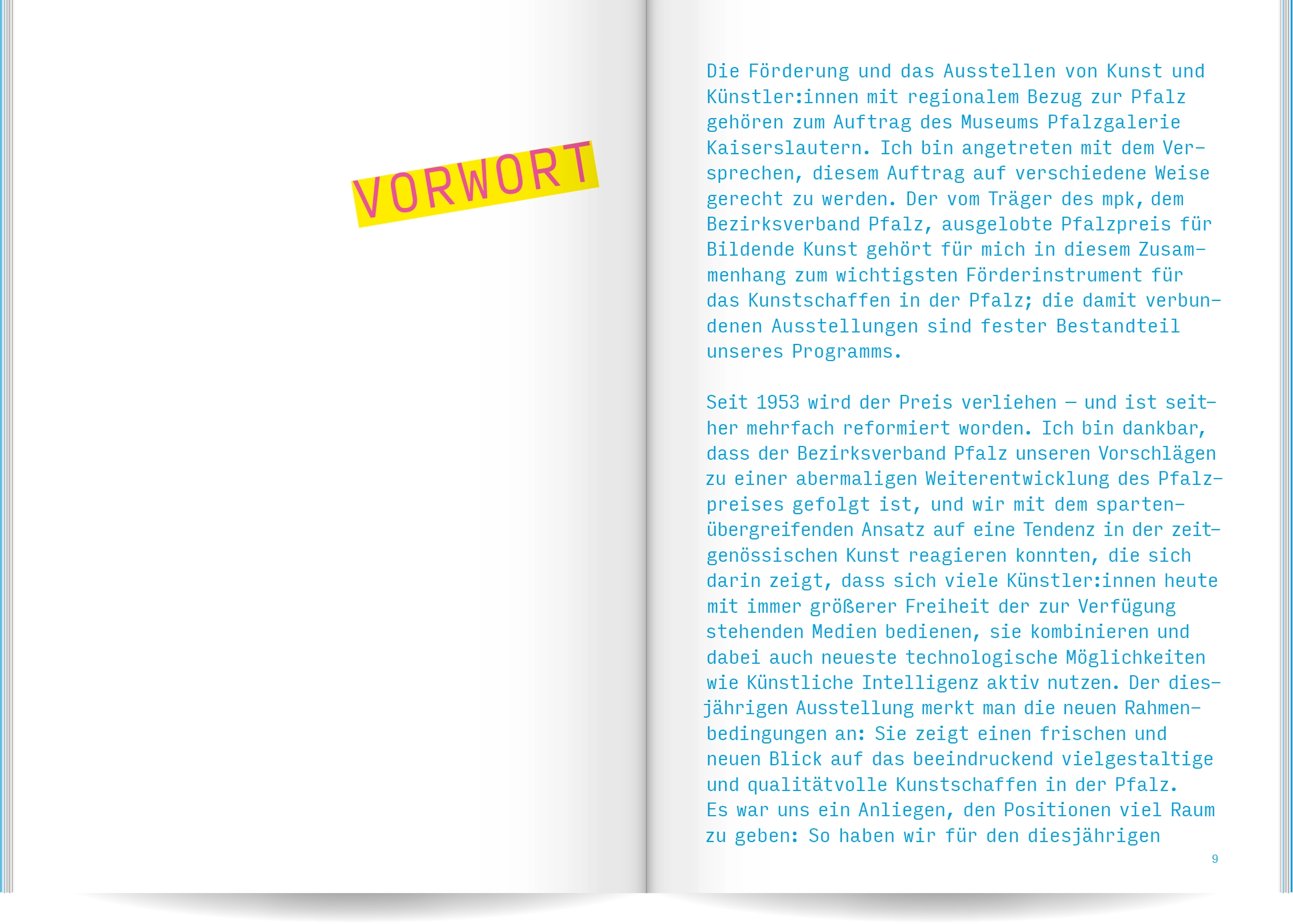 „Transformationen“ lautete das Motto des Pfalzpreises für Bildende Kunst 2024, ausgeschrieben vom Bezirksverband Pfalz. Wir durften den renommierten Preis visuell ausstatten und den umfangreichen Katalog zur Ausstellung gestalten. Auf 96 Seiten werden in vier Themengruppen die Werke der Preisträger:innen vorgestellt — in Wort und Bild, ergänzt durch eine kurze Vita. Hinzu kommen kleine Essays und Jurybegründungen.