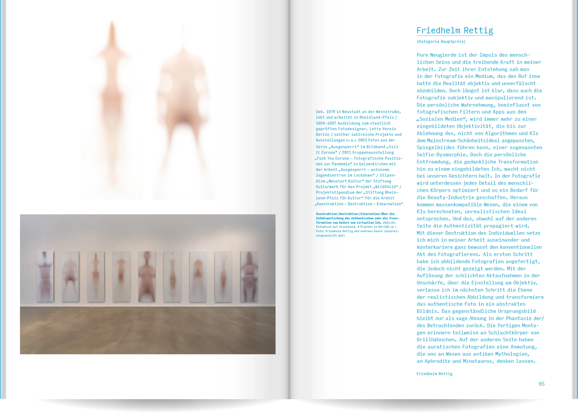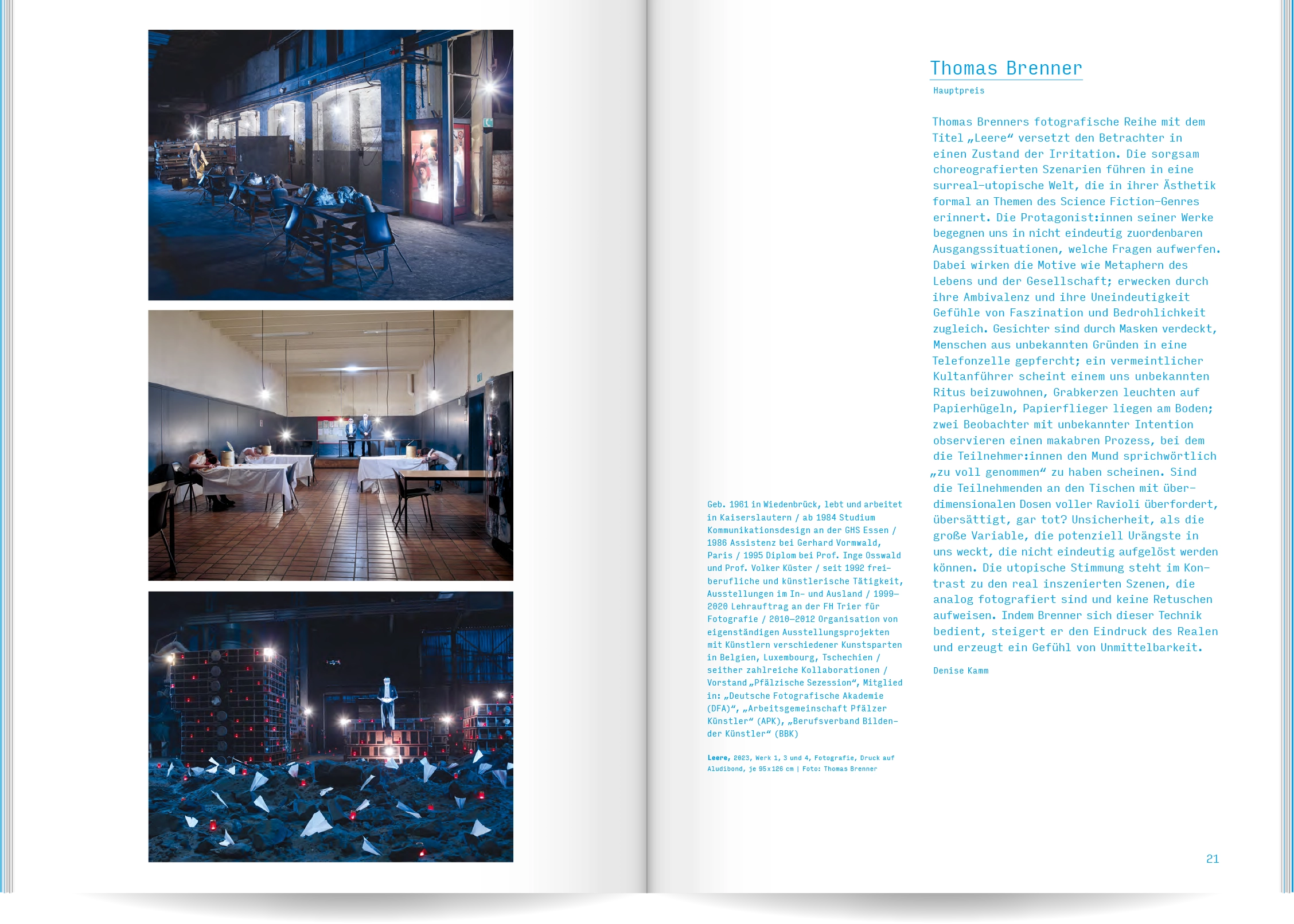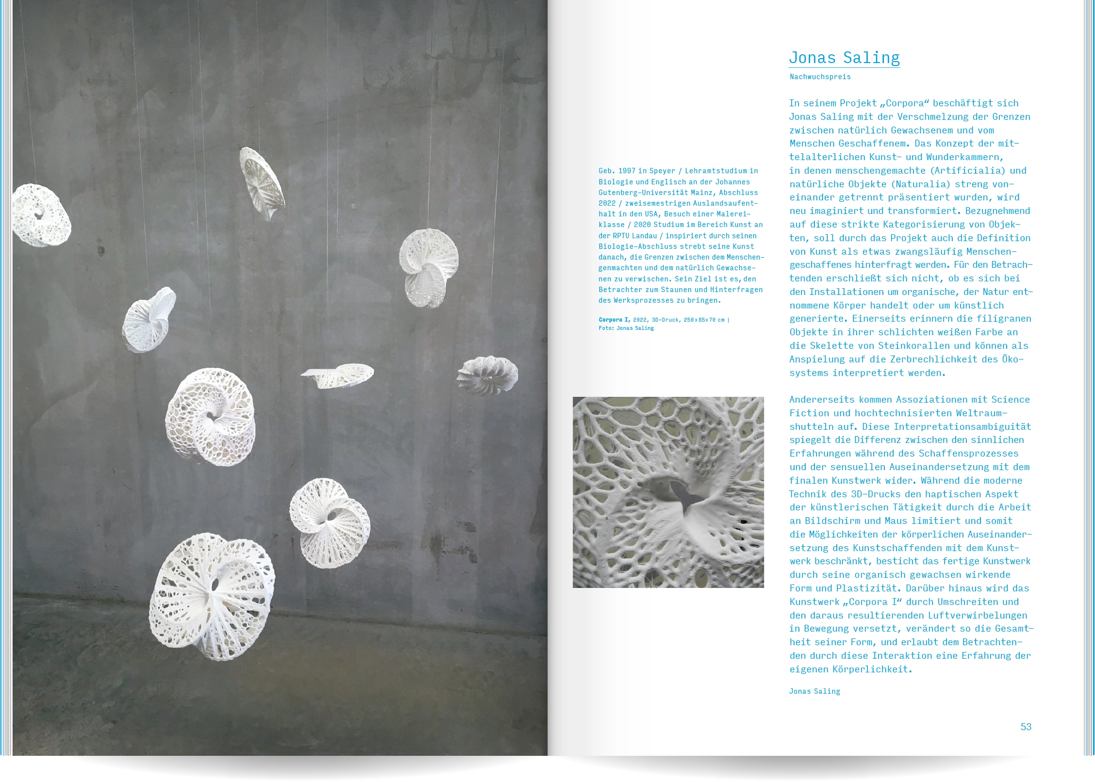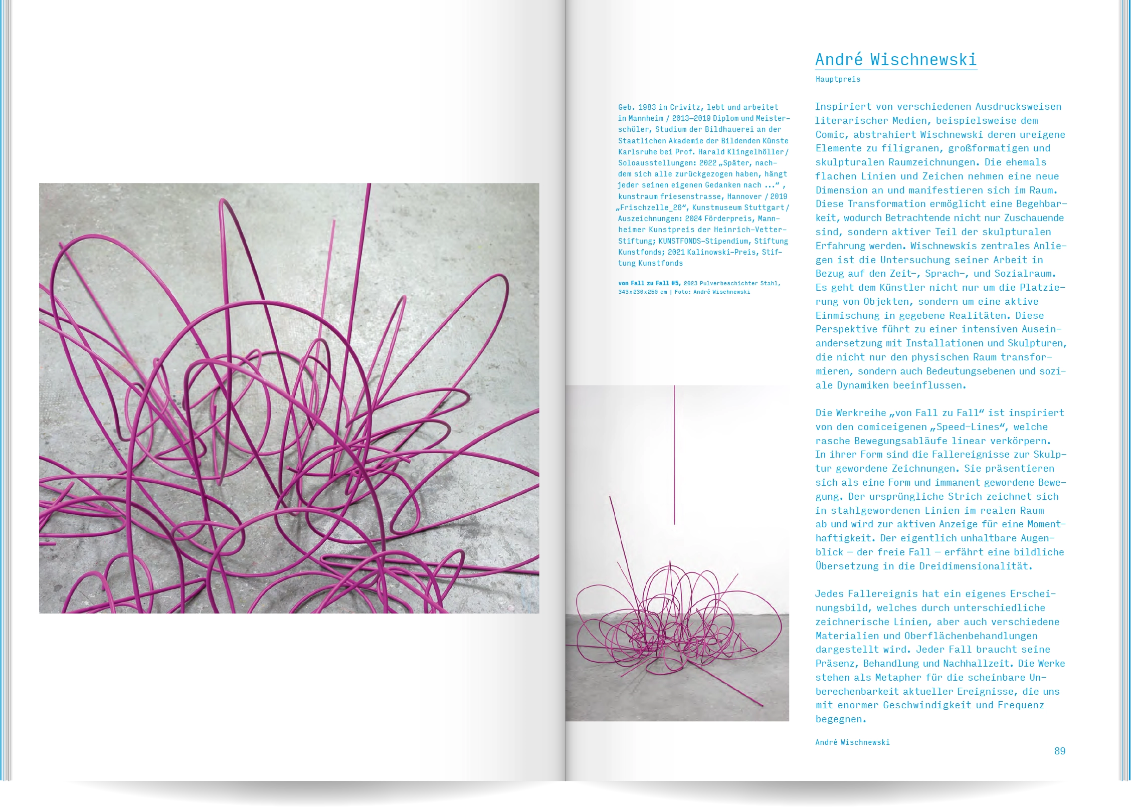 „Transformationen“ lautete das Motto des Pfalzpreises für Bildende Kunst 2024, ausgeschrieben vom Bezirksverband Pfalz. Wir durften den renommierten Preis visuell ausstatten und den umfangreichen Katalog zur Ausstellung gestalten. Auf 96 Seiten werden in vier Themengruppen die Werke der Preisträger:innen vorgestellt — in Wort und Bild, ergänzt durch eine kurze Vita. Hinzu kommen kleine Essays und Jurybegründungen.