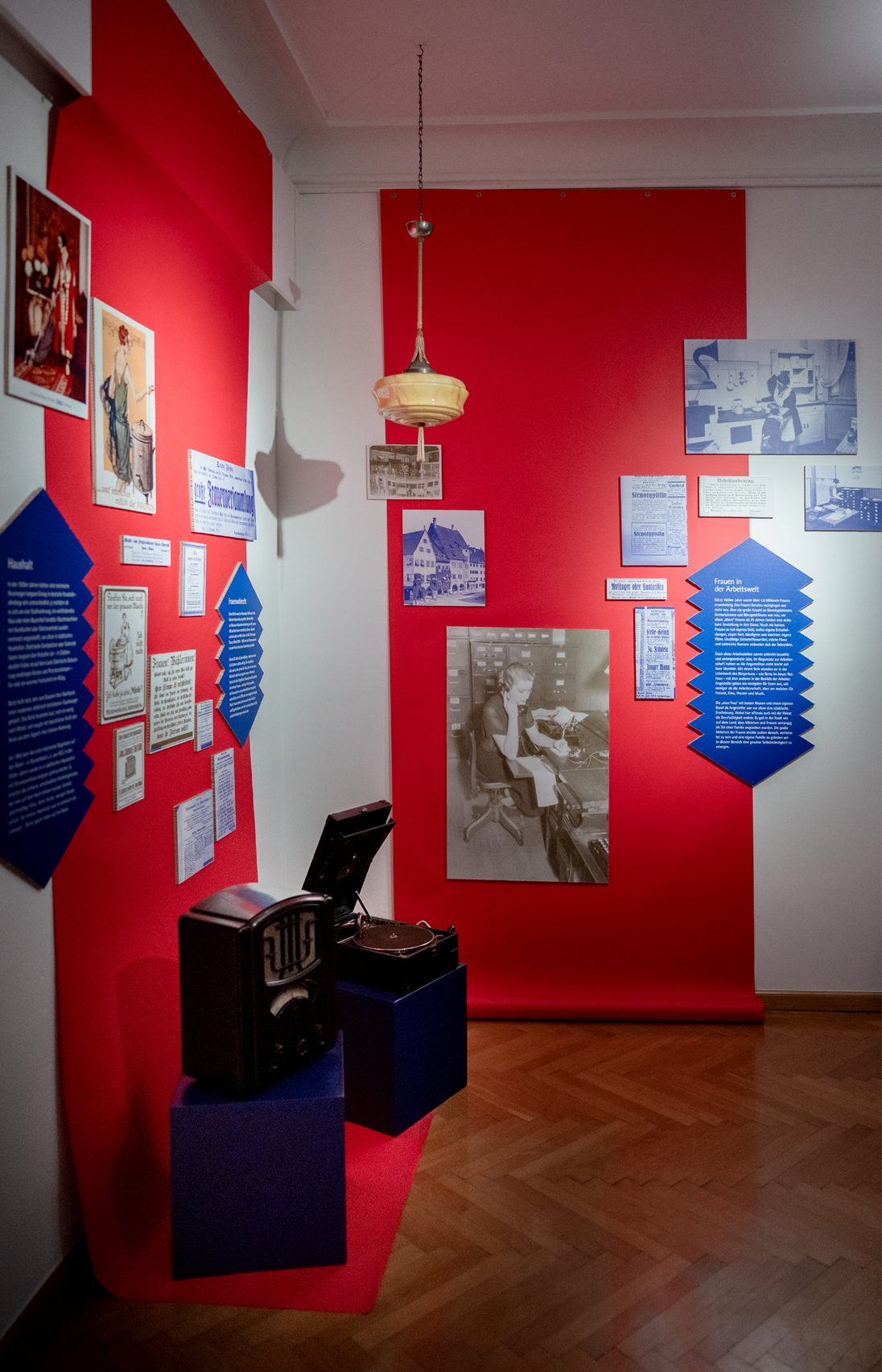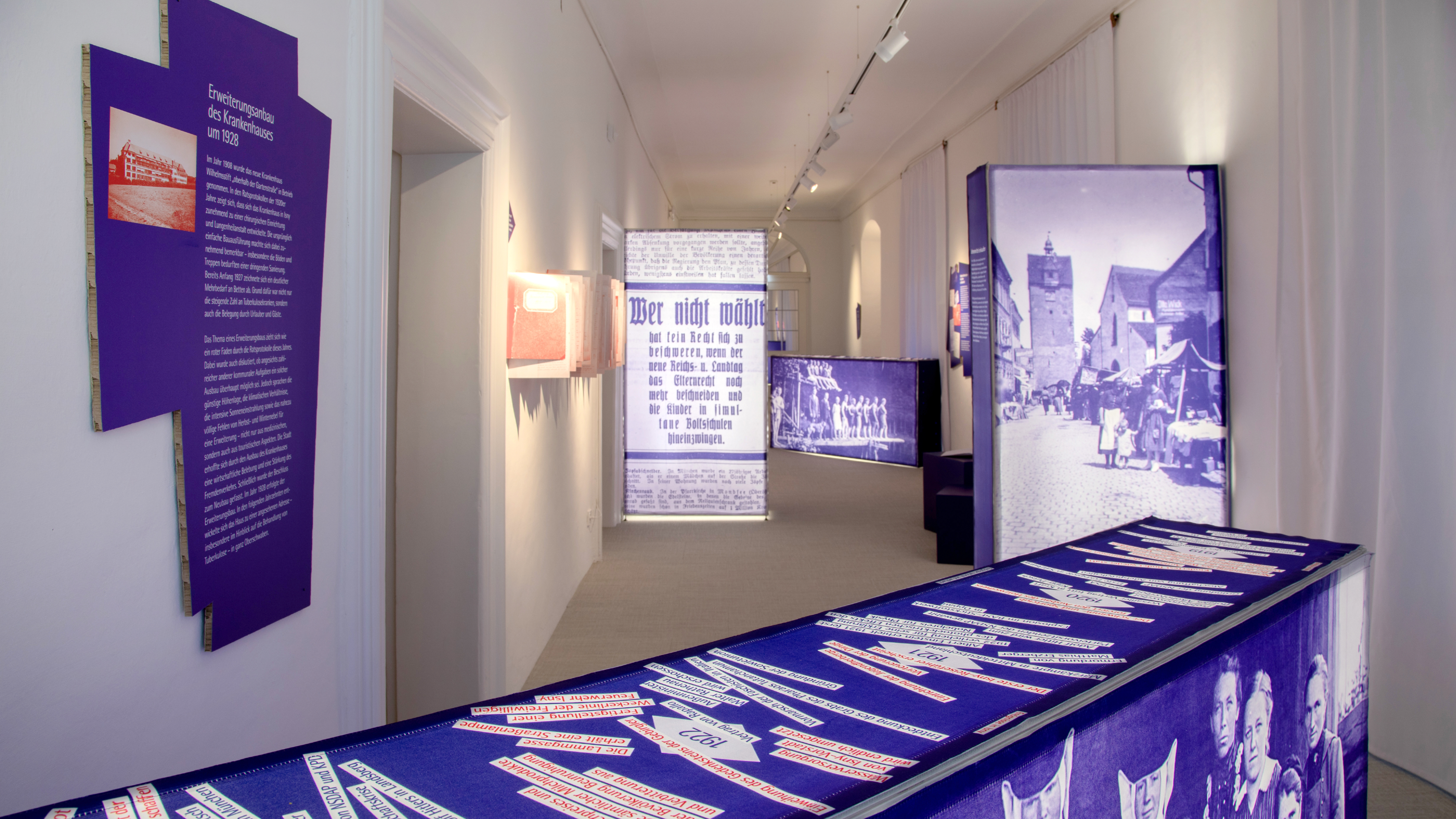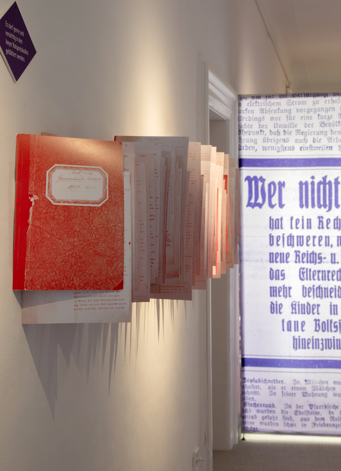 Wir haben die historischen Themen in ein atmosphärisches Ausstellungserlebnis übersetzt — und verbinden einen orientierenden Wissensbereich mit drei immersiven Biografieräumen: Der erste Bereich vermittelt in collagierten Themeninseln wesentliche Ereignisse zwischen 1919 und 1929: Hier collagieren wir großformatige Bilder und zeitgeschichtliche Dokumente. Rund 300 Stadtratsprotokolle bringen wir zum Blättern auf die Wand und laden damit zum Nachvollziehen lokalpolitischer Entwicklungen ein.