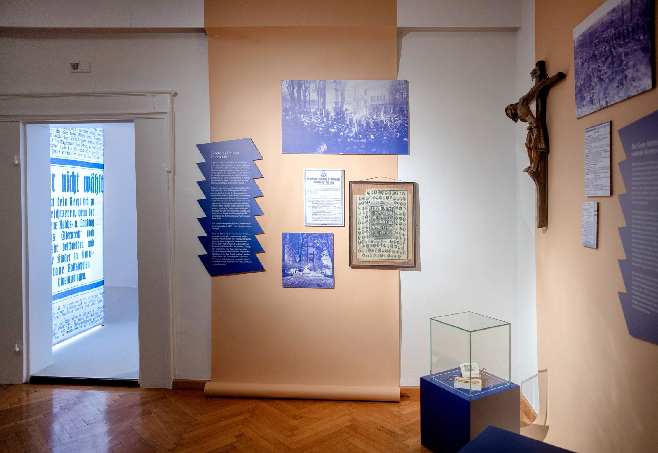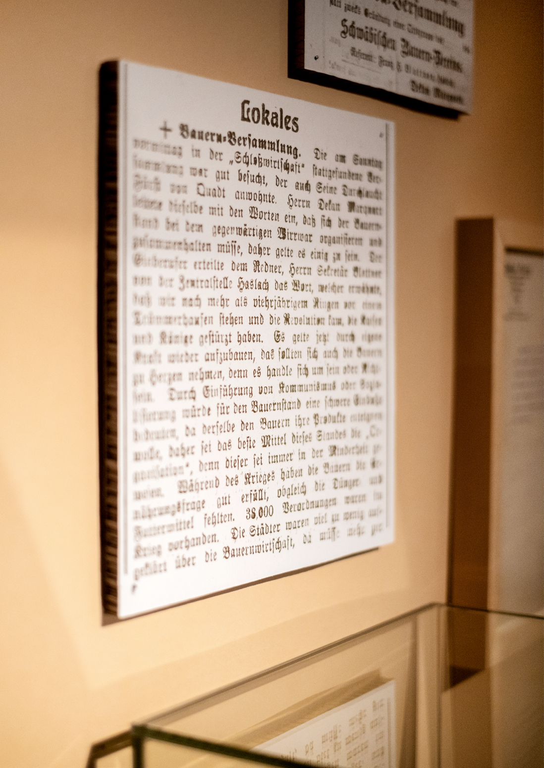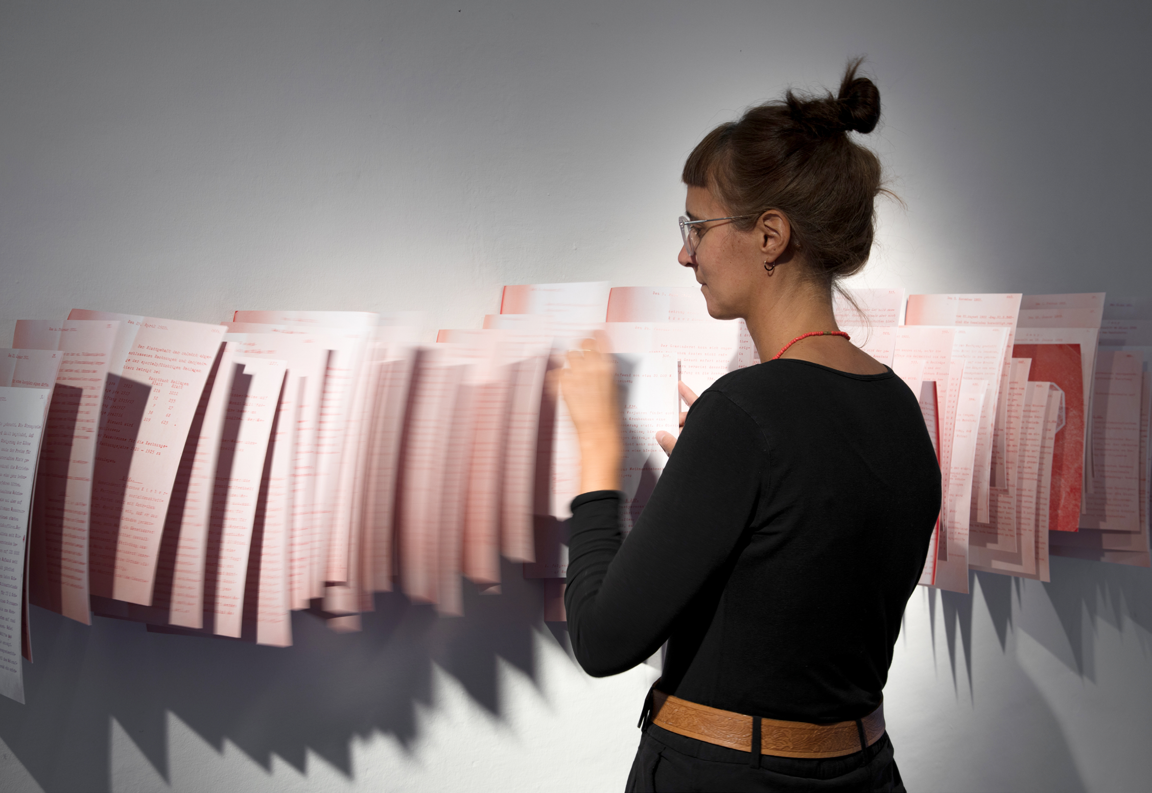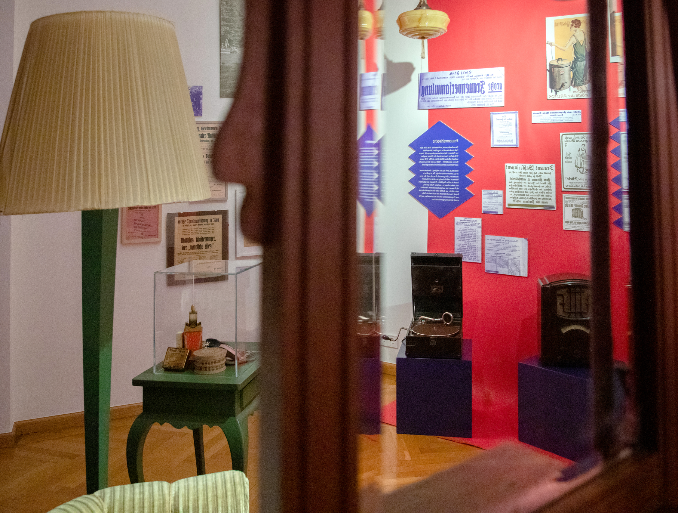 Wir haben die historischen Themen in ein atmosphärisches Ausstellungserlebnis übersetzt — und verbinden einen orientierenden Wissensbereich mit drei immersiven Biografieräumen: Der erste Bereich vermittelt in collagierten Themeninseln wesentliche Ereignisse zwischen 1919 und 1929: Hier collagieren wir großformatige Bilder und zeitgeschichtliche Dokumente. Rund 300 Stadtratsprotokolle bringen wir zum Blättern auf die Wand und laden damit zum Nachvollziehen lokalpolitischer Entwicklungen ein.