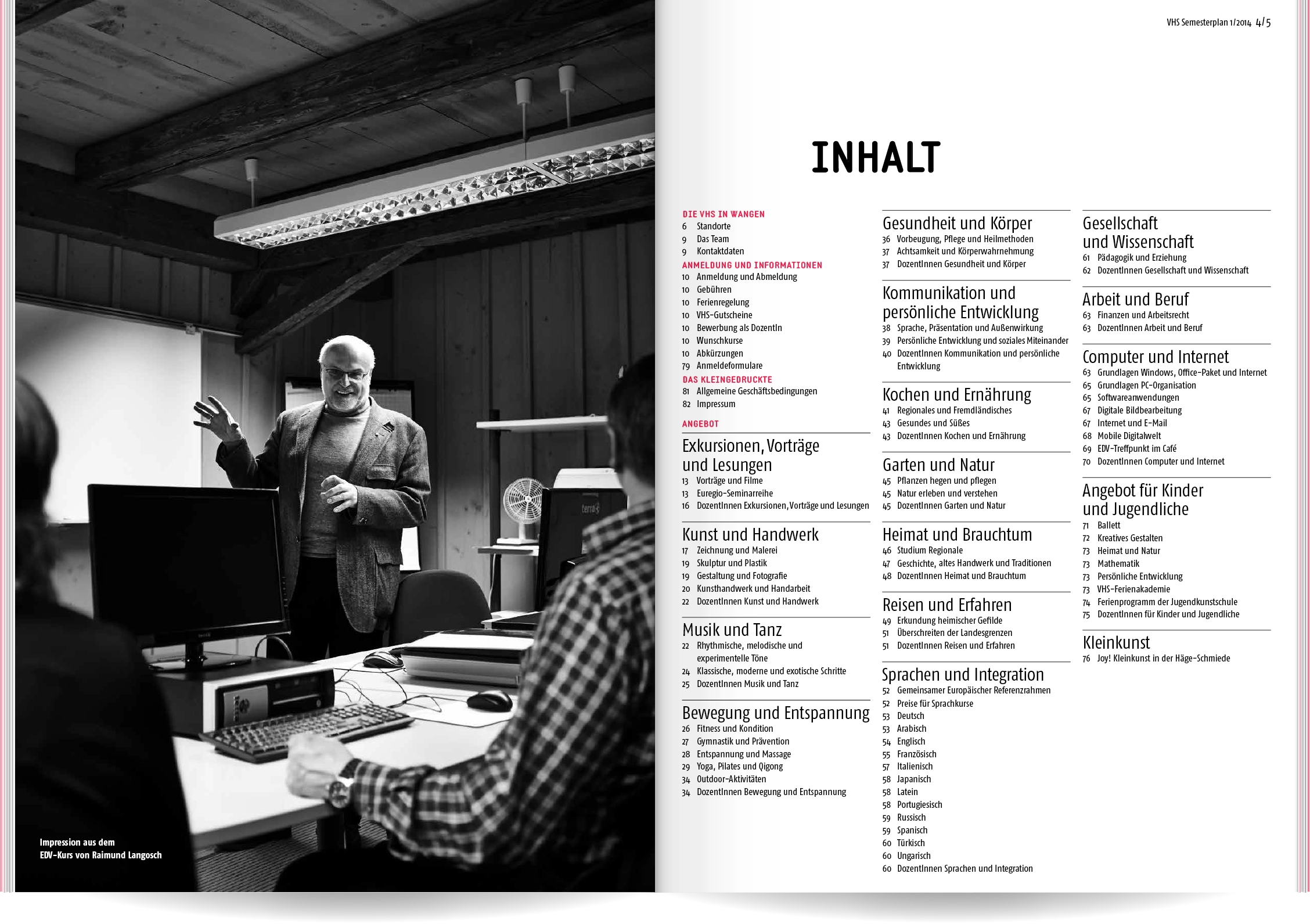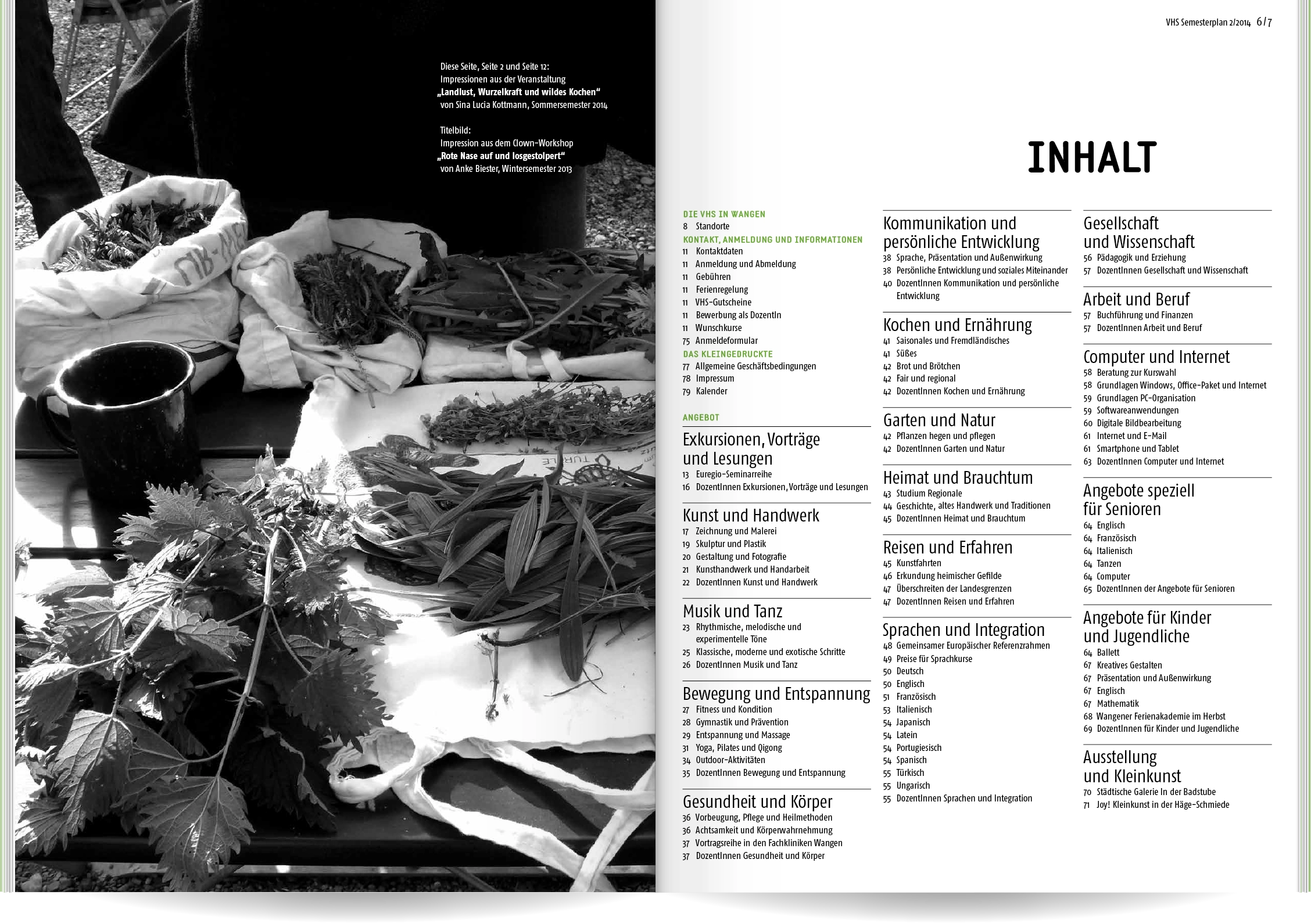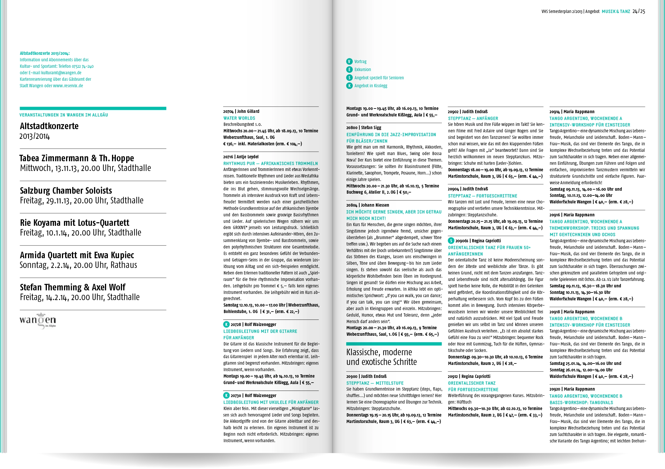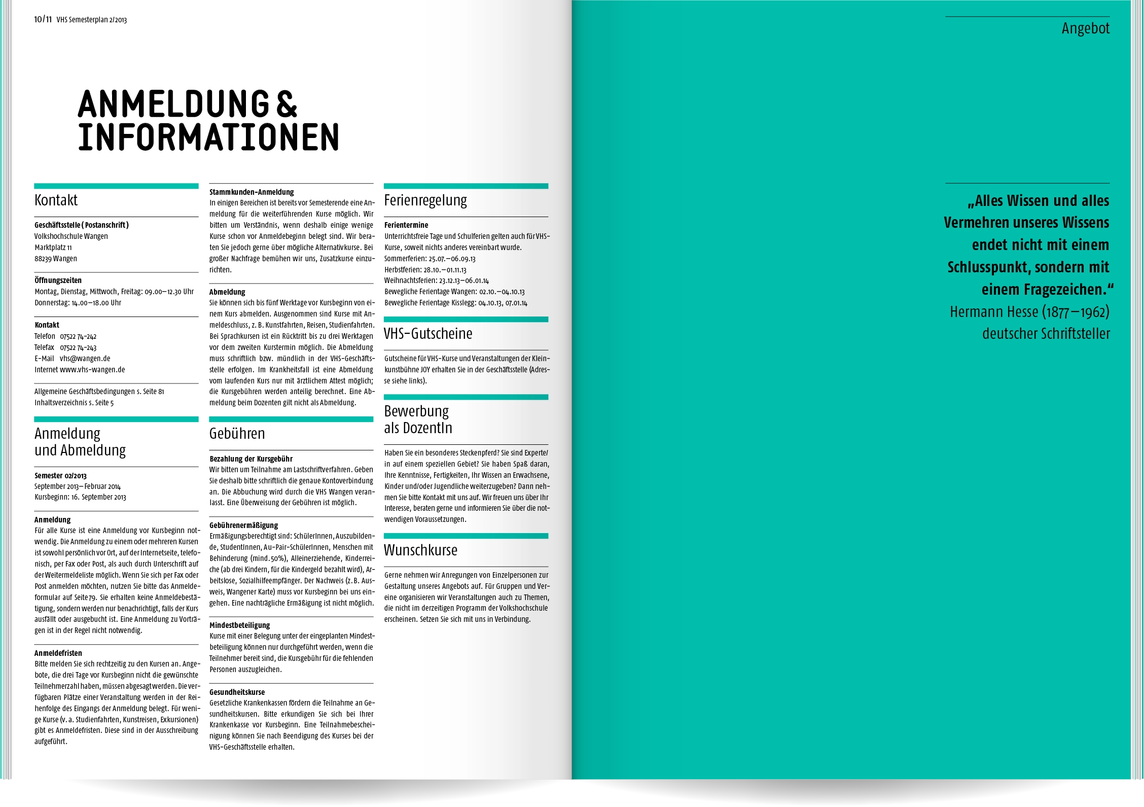 Bei Neukonzeption und Gestaltung des Semesterplans der Volkshochschule Wangen im Allgäu ging es uns um Übersichtlichkeit und eine schnelle, sinnvolle Benutzerführung: Wir entwickelten eine Struktur mit 16 Themen- und Unterkategorien, denen wir die rund 400 Veranstaltungen zuordneten. Ein detailliertes Inhaltsverzeichnis und lebende Kolumnentitel ermöglichen die gezielte Suche. Informationen zur VHS, die Vorstellung der Veranstaltungsorte und große atmosphärische Bildern lockern die enorme Textmenge auf.