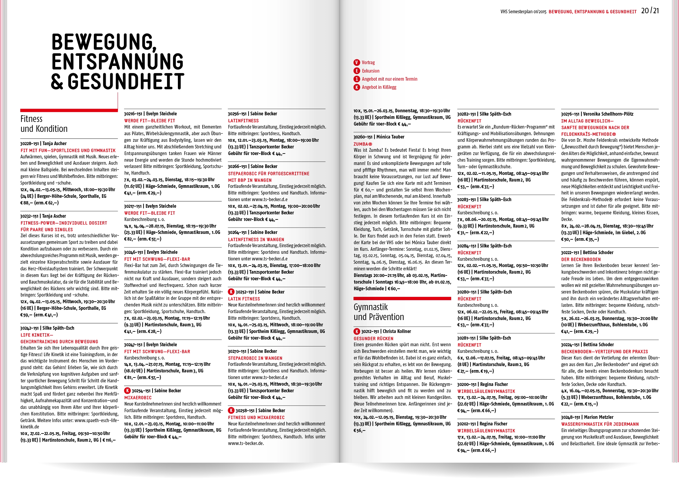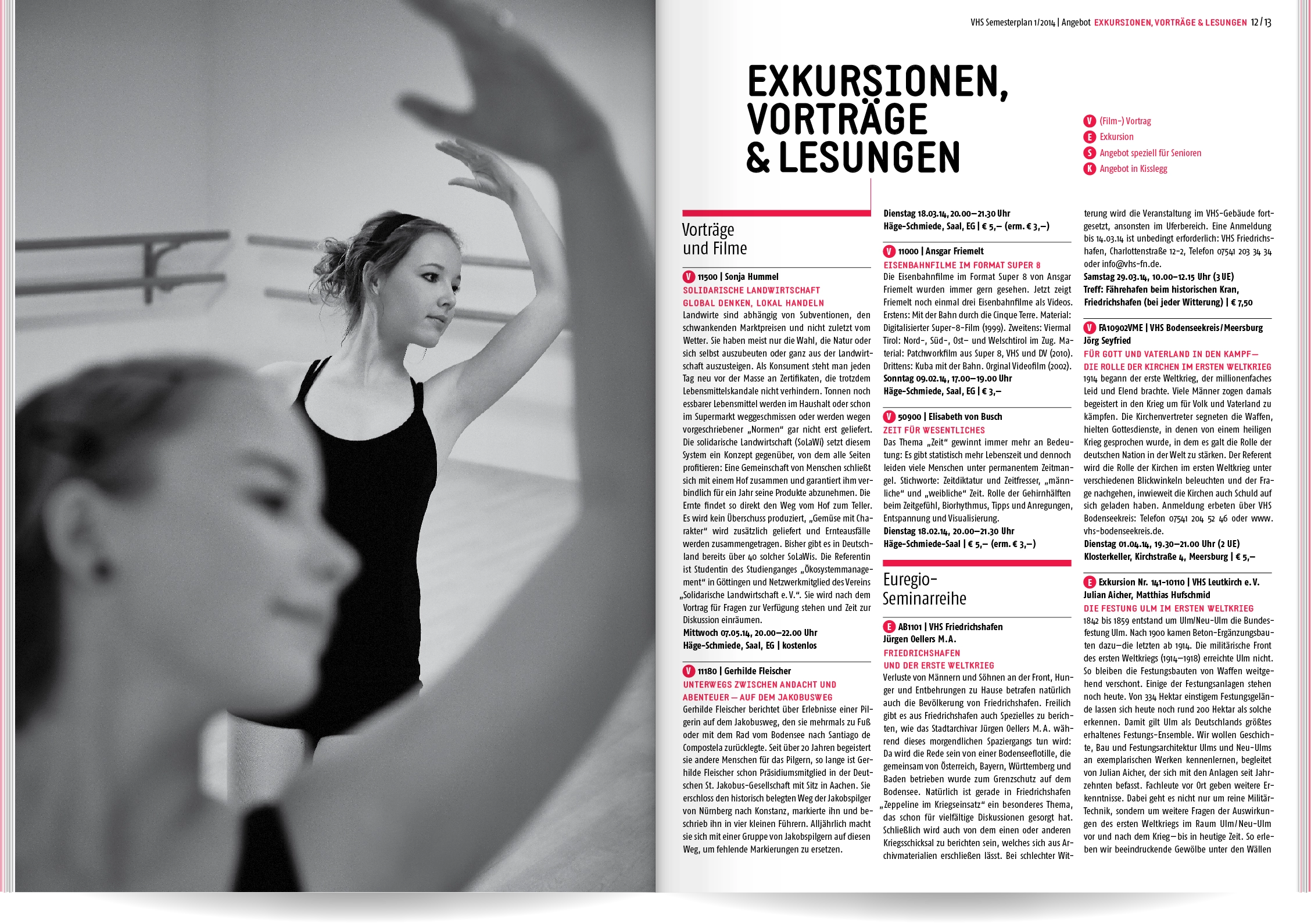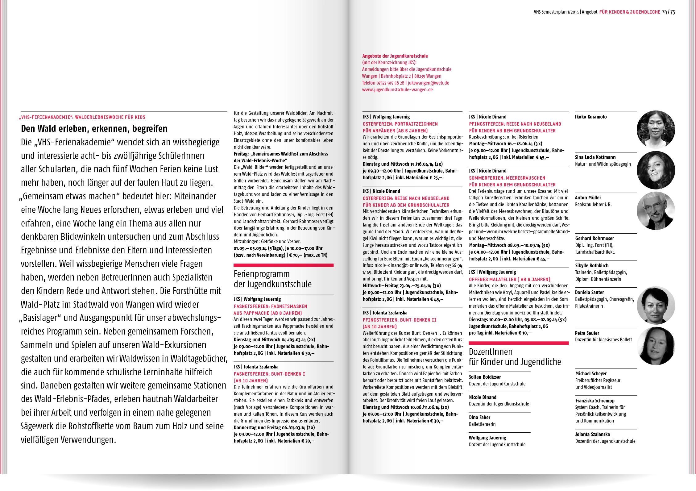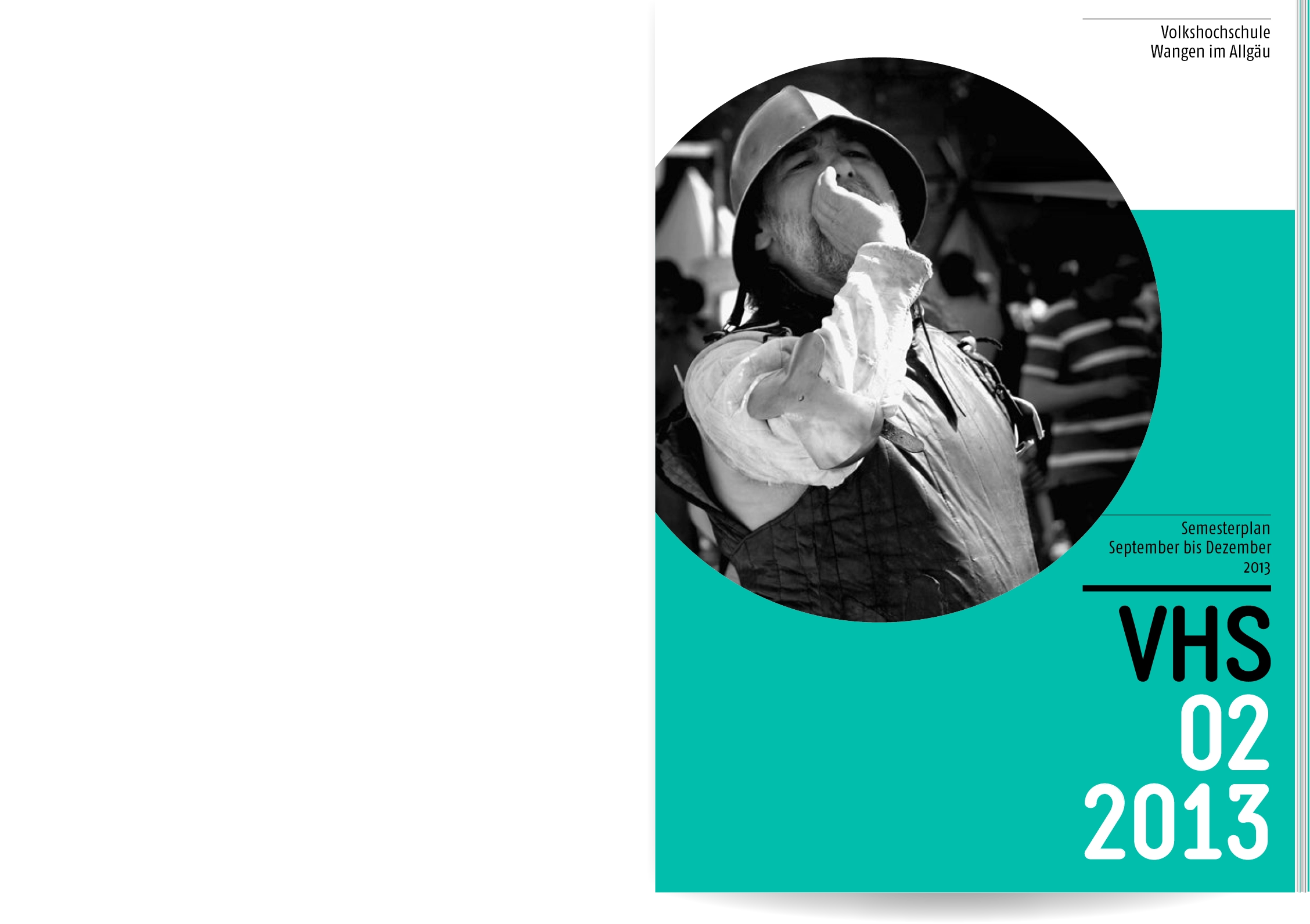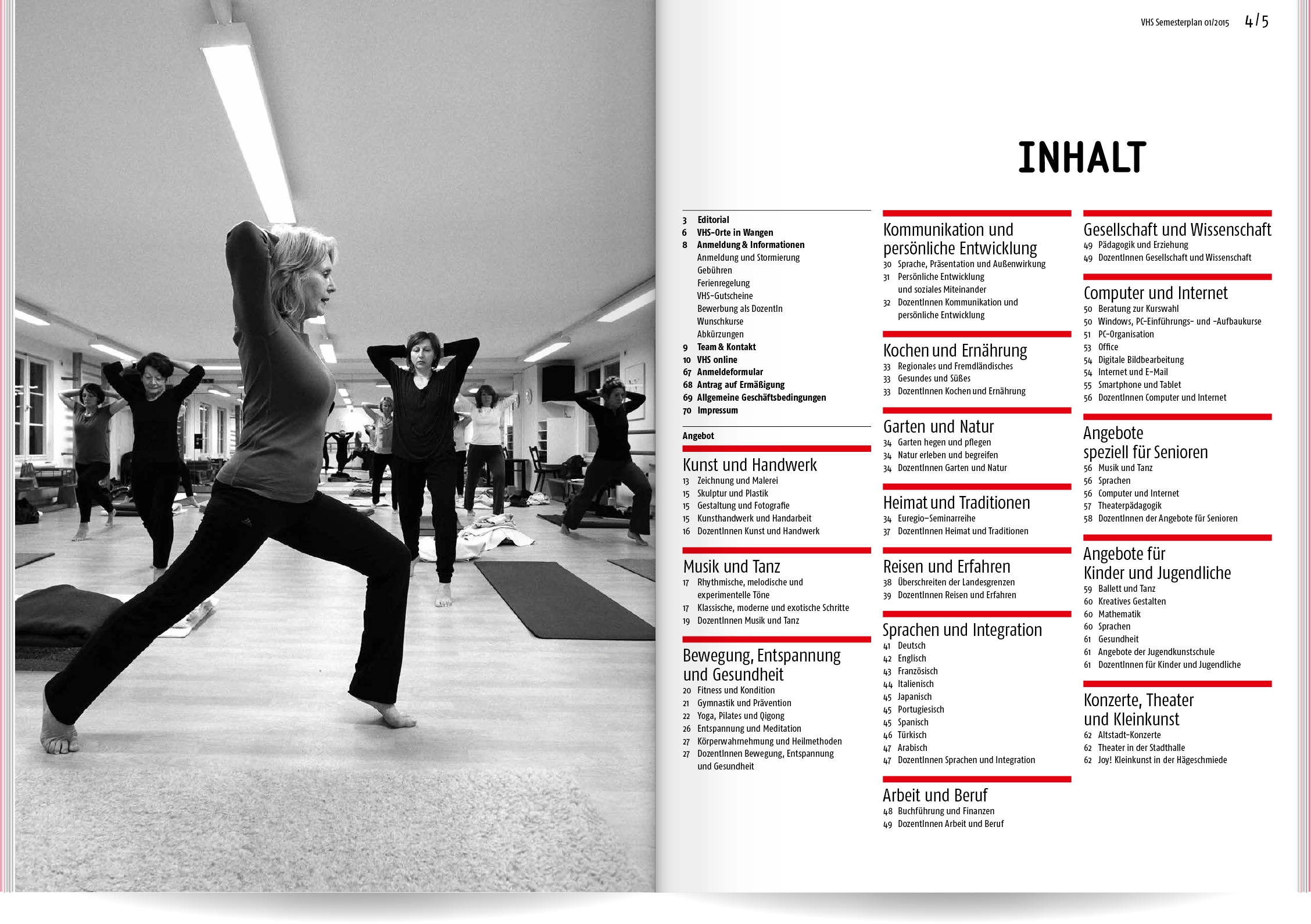 Bei Neukonzeption und Gestaltung des Semesterplans der Volkshochschule Wangen im Allgäu ging es uns um Übersichtlichkeit und eine schnelle, sinnvolle Benutzerführung: Wir entwickelten eine Struktur mit 16 Themen- und Unterkategorien, denen wir die rund 400 Veranstaltungen zuordneten. Ein detailliertes Inhaltsverzeichnis und lebende Kolumnentitel ermöglichen die gezielte Suche. Informationen zur VHS, die Vorstellung der Veranstaltungsorte und große atmosphärische Bildern lockern die enorme Textmenge auf.