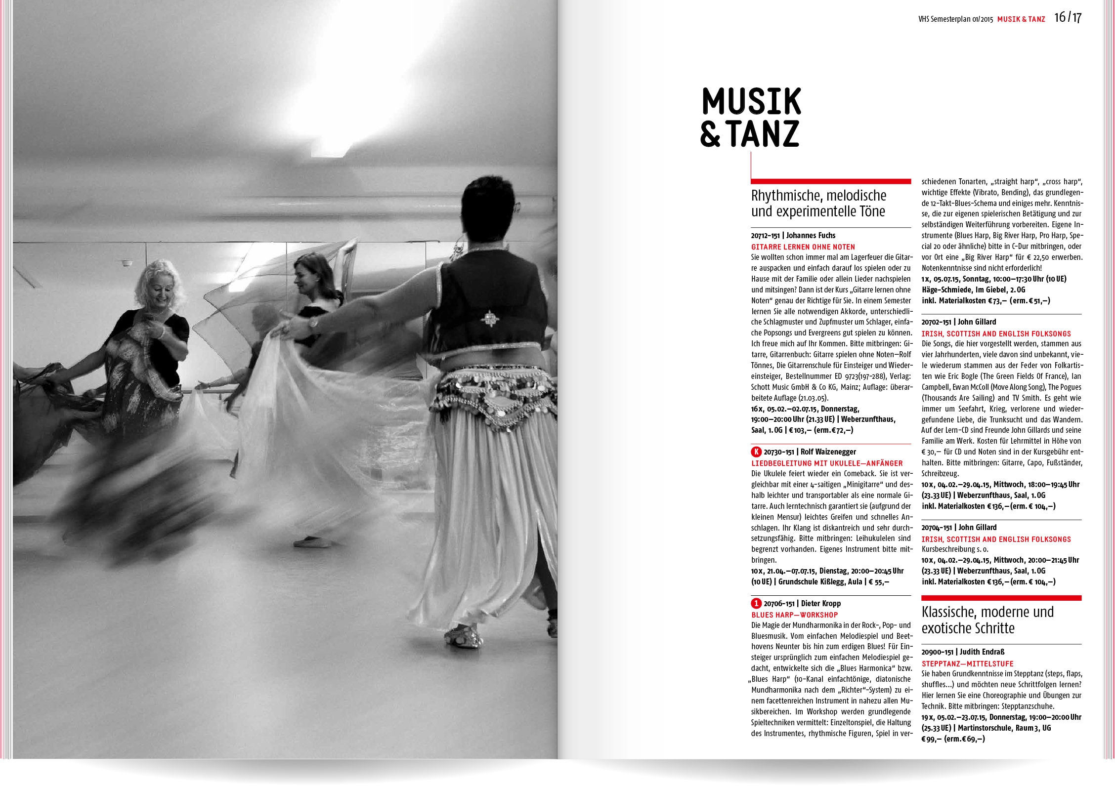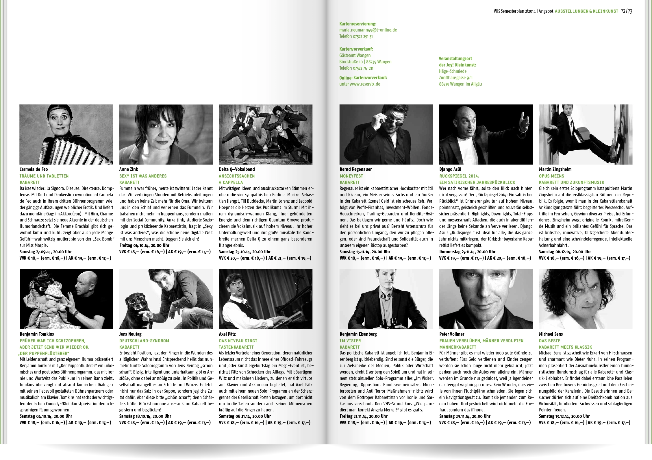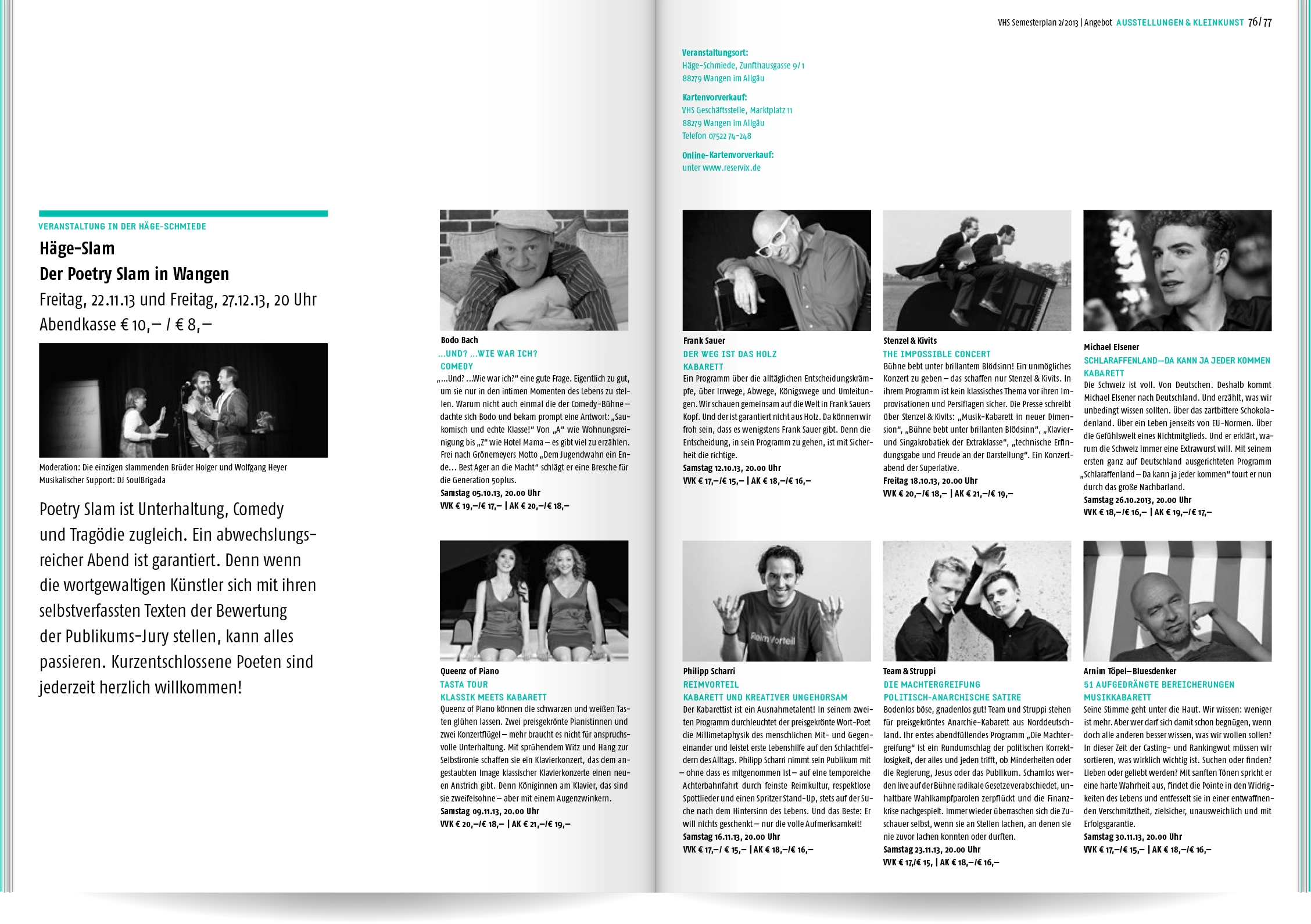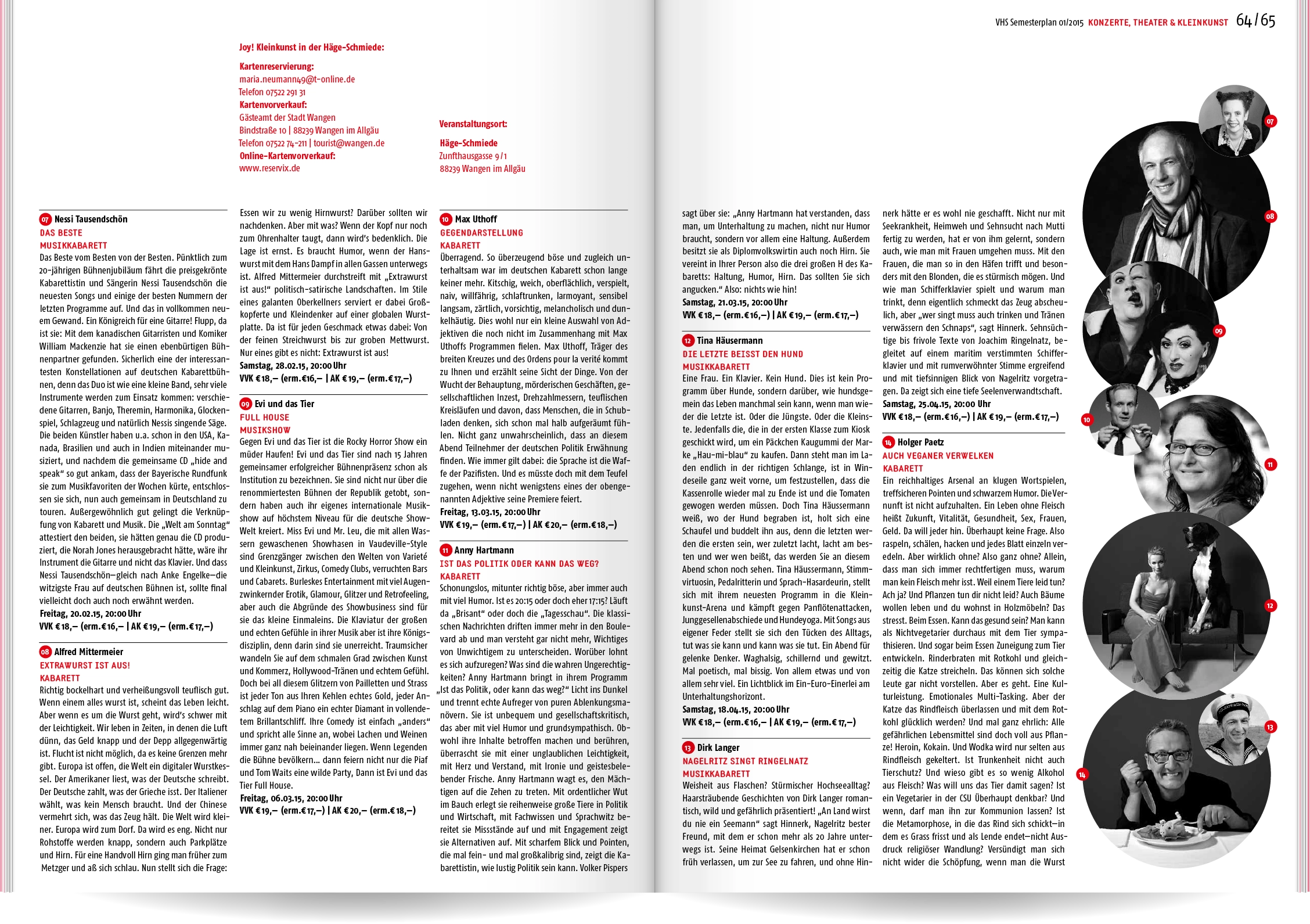 Bei Neukonzeption und Gestaltung des Semesterplans der Volkshochschule Wangen im Allgäu ging es uns um Übersichtlichkeit und eine schnelle, sinnvolle Benutzerführung: Wir entwickelten eine Struktur mit 16 Themen- und Unterkategorien, denen wir die rund 400 Veranstaltungen zuordneten. Ein detailliertes Inhaltsverzeichnis und lebende Kolumnentitel ermöglichen die gezielte Suche. Informationen zur VHS, die Vorstellung der Veranstaltungsorte und große atmosphärische Bildern lockern die enorme Textmenge auf.