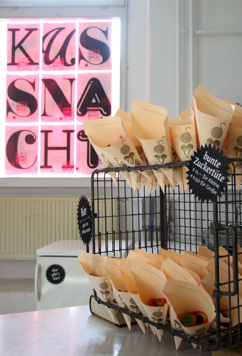 „Typografie kann unter Umständen Kunst sein“ sagt Kurt Schwitters. Das finden wir auch und steuern der Kunstnacht 2015 typografische Werke bei: In unserem Kunstkiosk bieten wir süße Tüten und holzige Typen — das sind aus hauchdünnem Furnier gelaserte Buchstaben, die schwebend in Rahmen montiert sind. Es gibt die Buchstaben des Wortes „wunderfitzig“ in Ahorn, Kirsche, Nussbaum und Zeder.