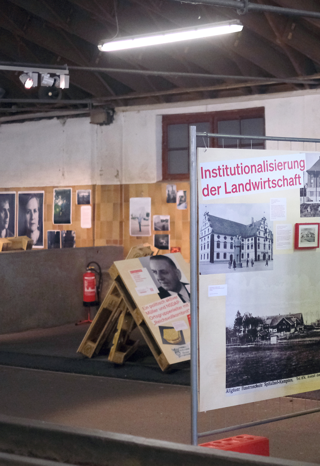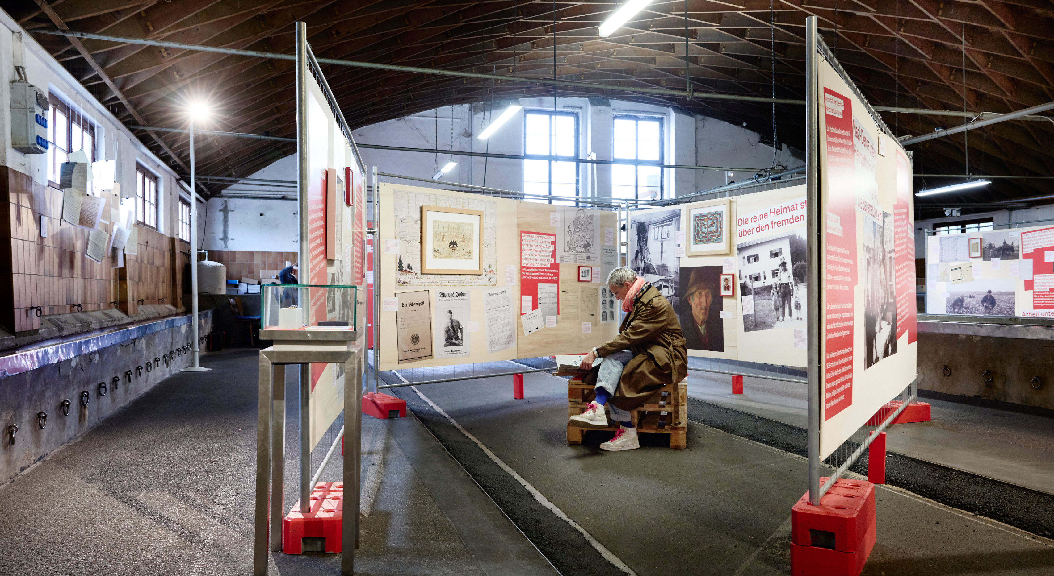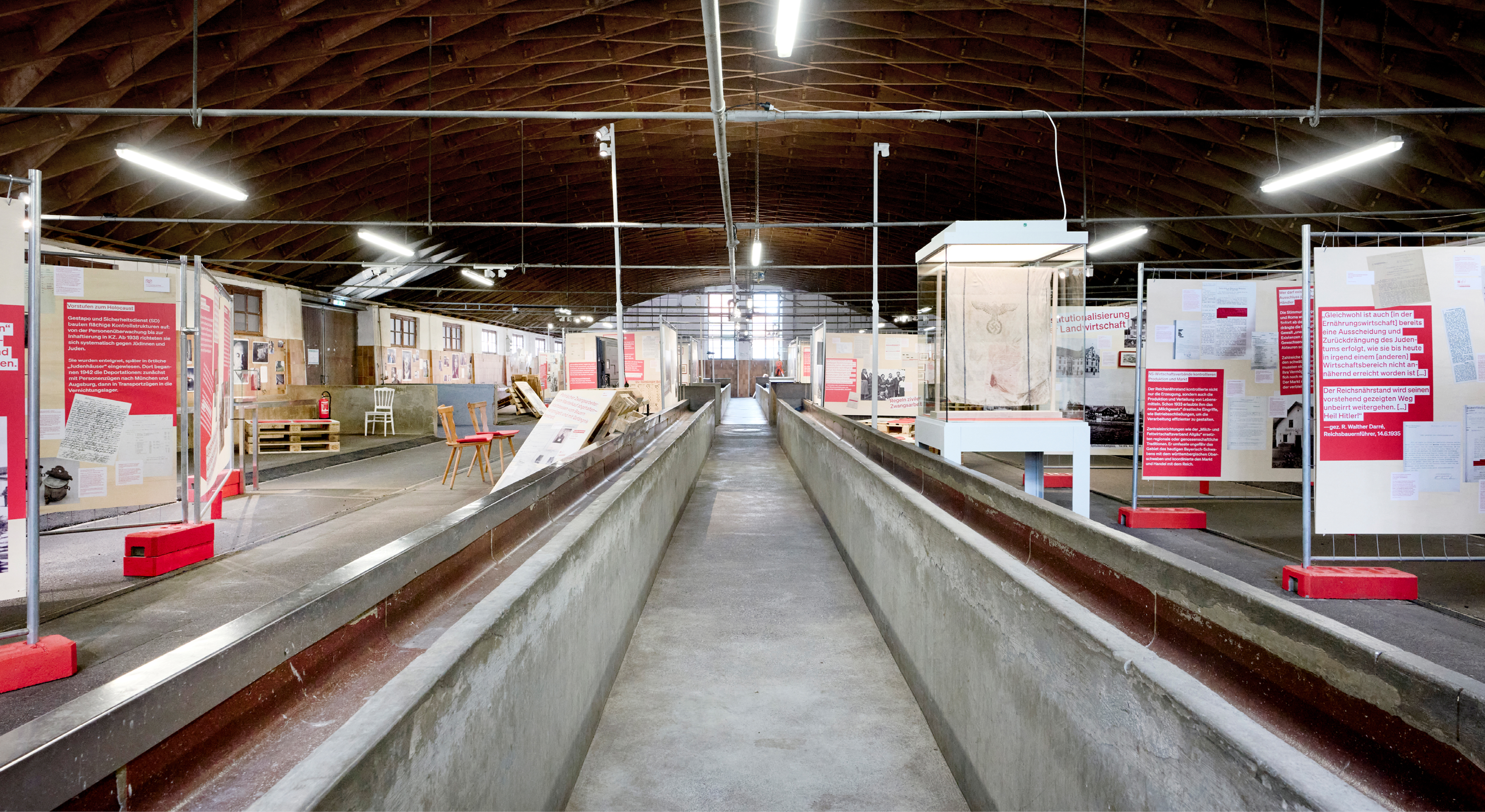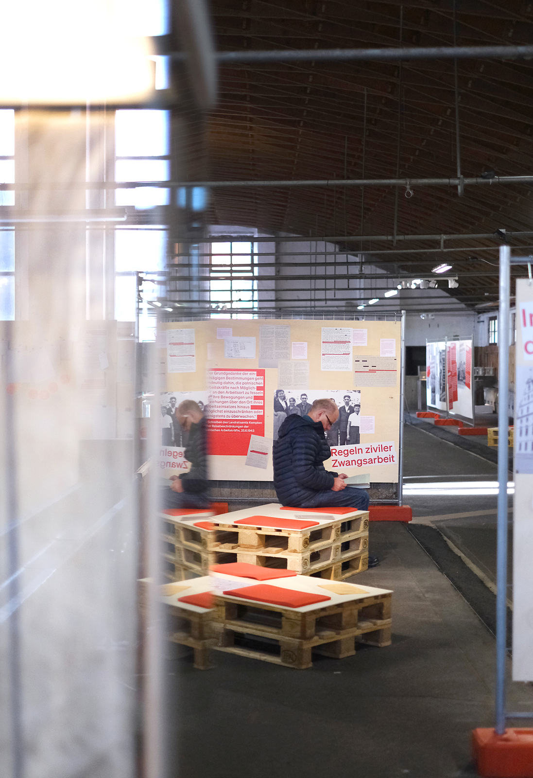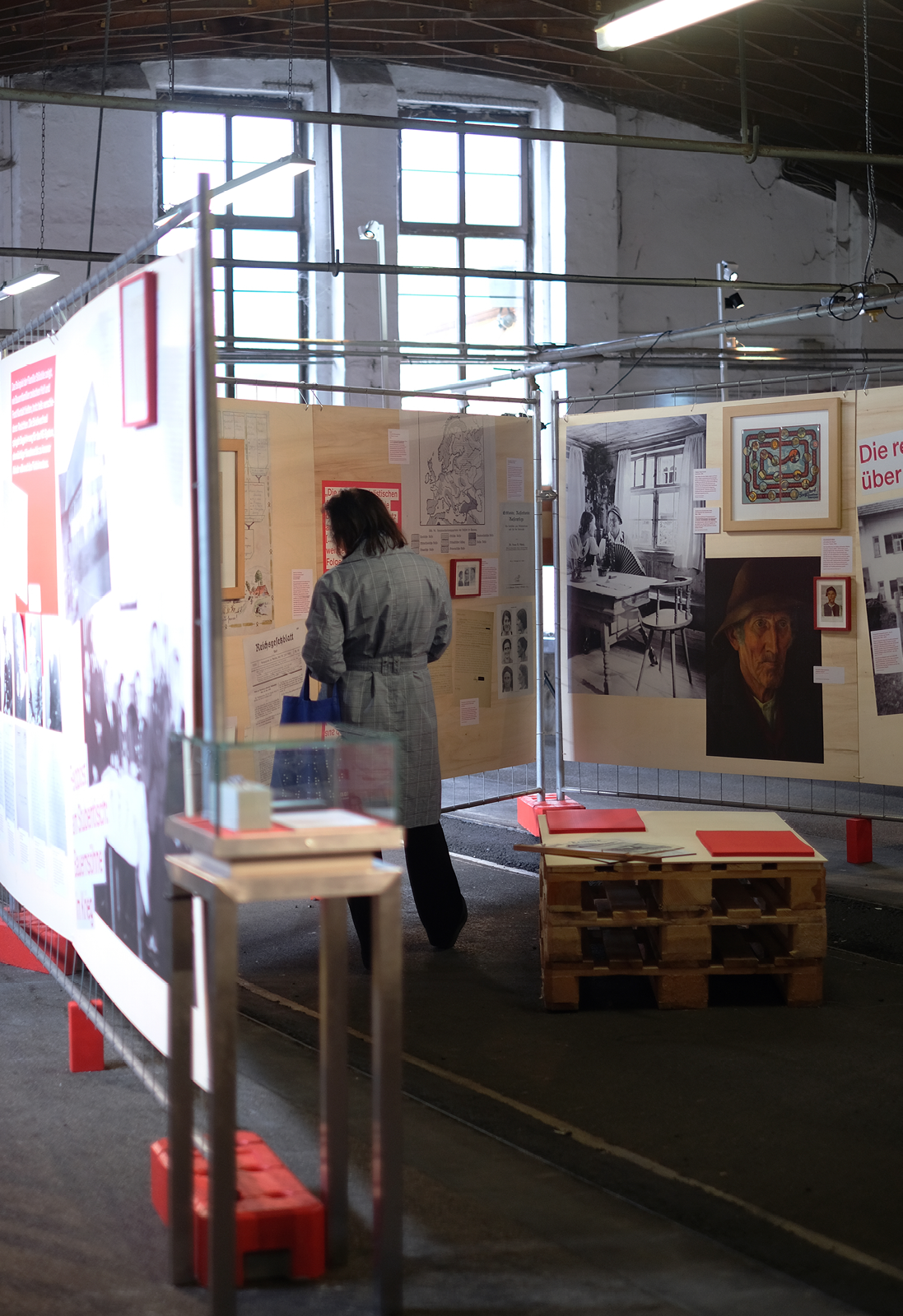 Die rohe Anmutung der Ausstellungsarchitektur — Paletten, Gitter und Bauzaun-System — verweisen subtil auf Gewalt und Kontrollmechanismen des NS-Systems und wirken auf den 800 qm der geschichtsträchtigen Halle 2 der Allgäuhalle besonders: Die „Kälberhalle” war zunächst Viehversteigerungshalle, später Zwangsarbeiterlager und Außenlager des KZ Dachau.