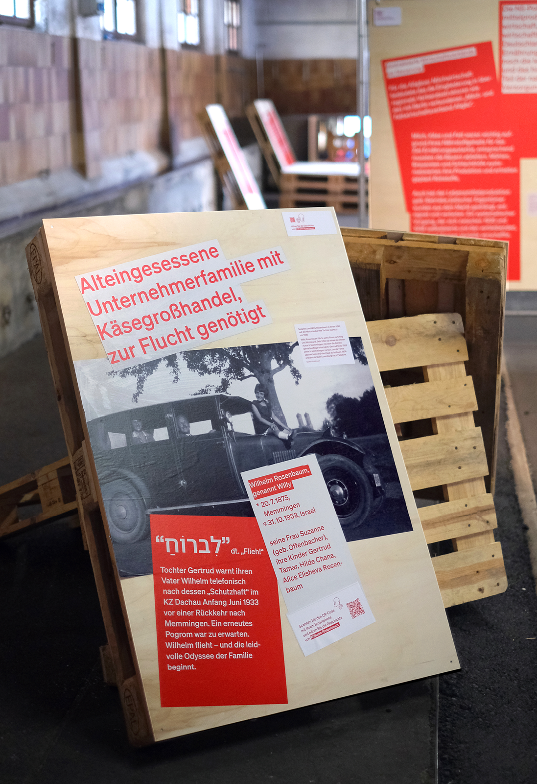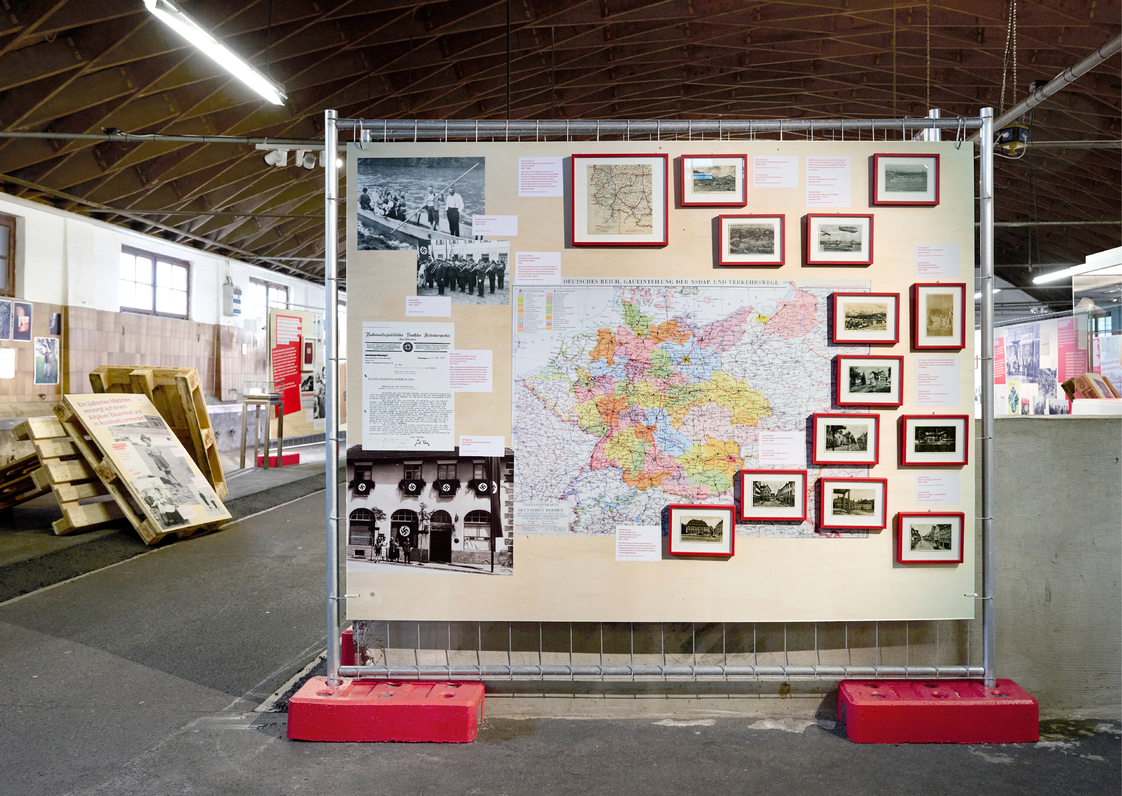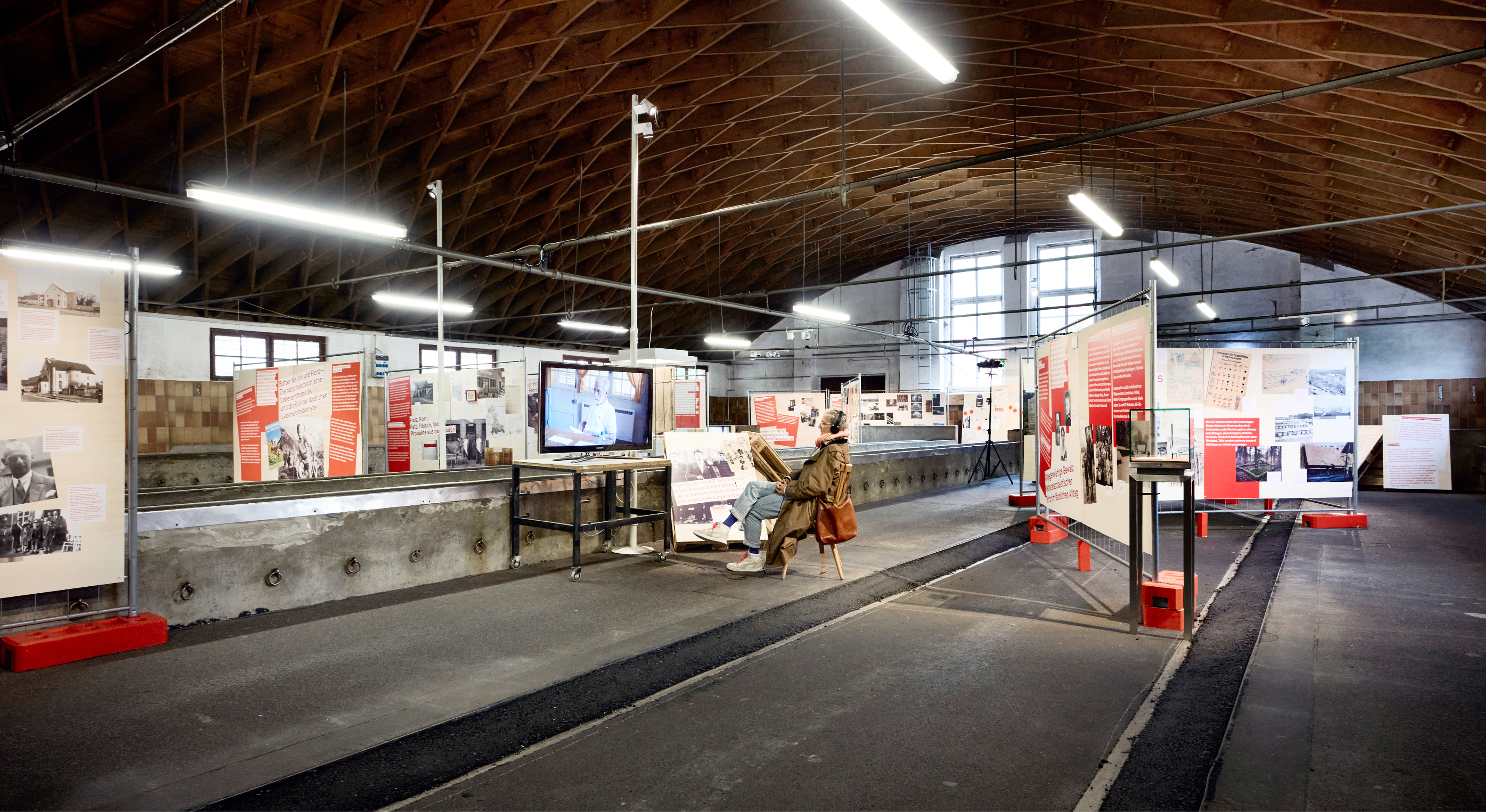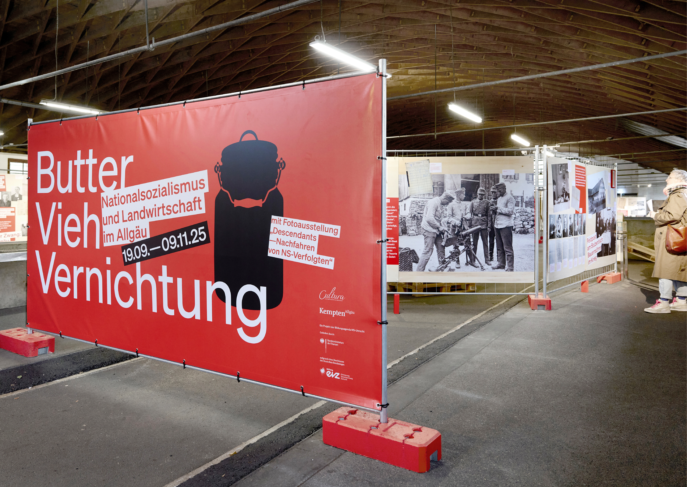 Die rohe Anmutung der Ausstellungsarchitektur — Paletten, Gitter und Bauzaun-System — verweisen subtil auf Gewalt und Kontrollmechanismen des NS-Systems und wirken auf den 800 qm der geschichtsträchtigen Halle 2 der Allgäuhalle besonders: Die „Kälberhalle” war zunächst Viehversteigerungshalle, später Zwangsarbeiterlager und Außenlager des KZ Dachau.