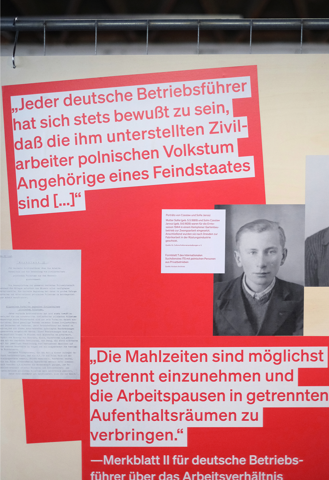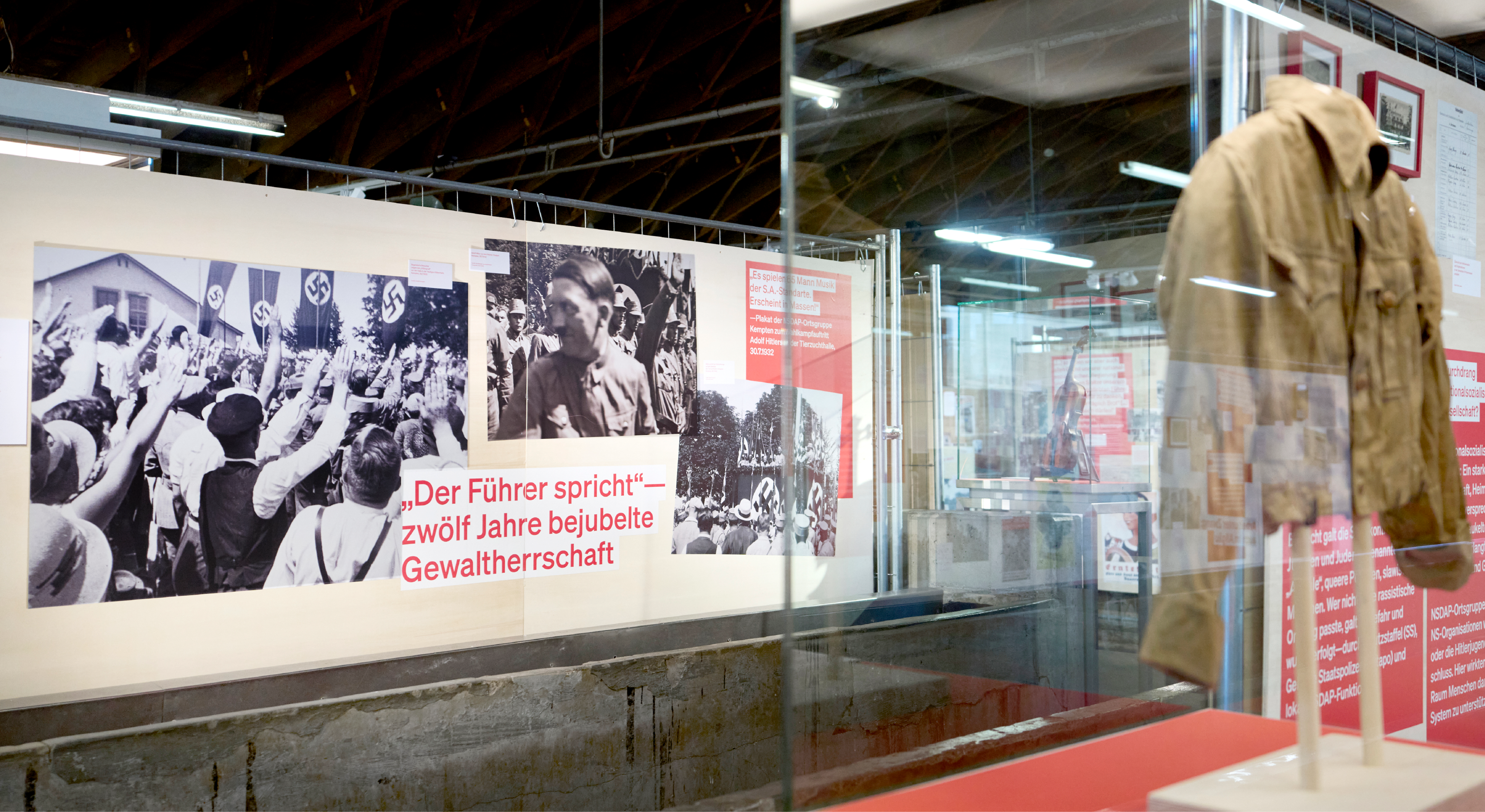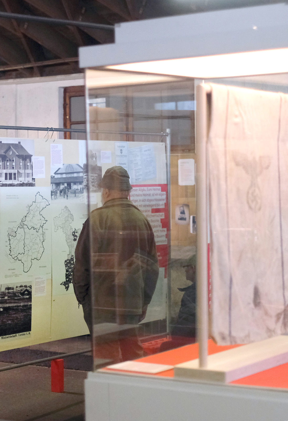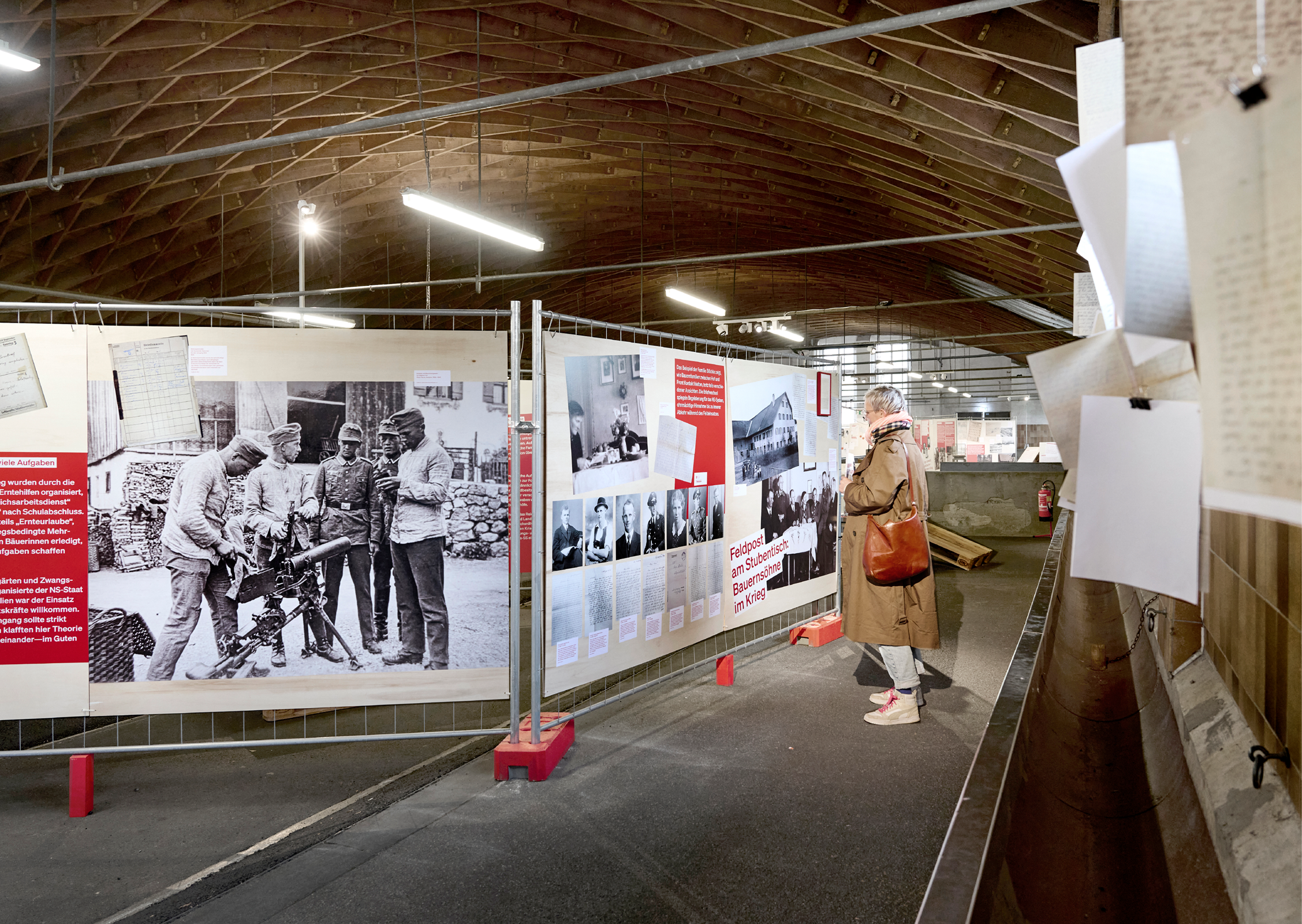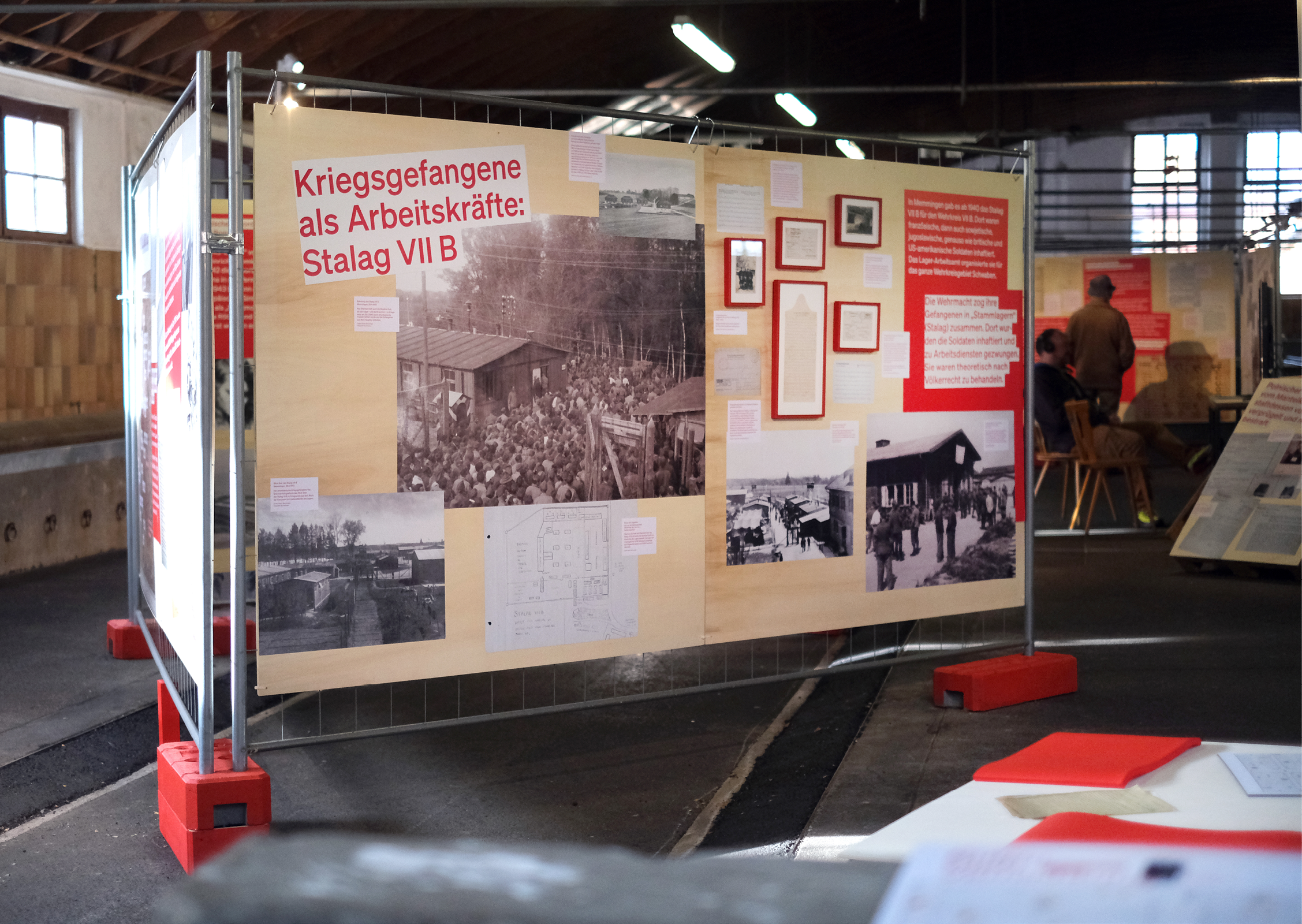 Die rohe Anmutung der Ausstellungsarchitektur — Paletten, Gitter und Bauzaun-System — verweisen subtil auf Gewalt und Kontrollmechanismen des NS-Systems und wirken auf den 800 qm der geschichtsträchtigen Halle 2 der Allgäuhalle besonders: Die „Kälberhalle” war zunächst Viehversteigerungshalle, später Zwangsarbeiterlager und Außenlager des KZ Dachau.