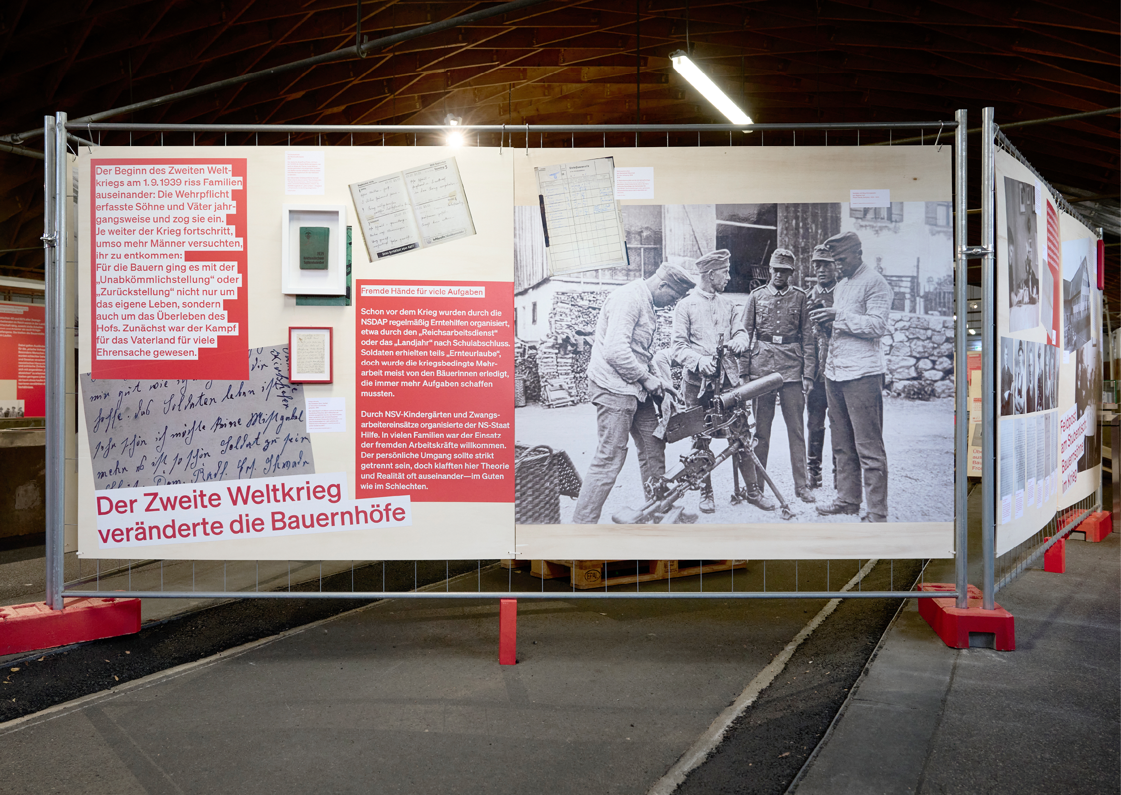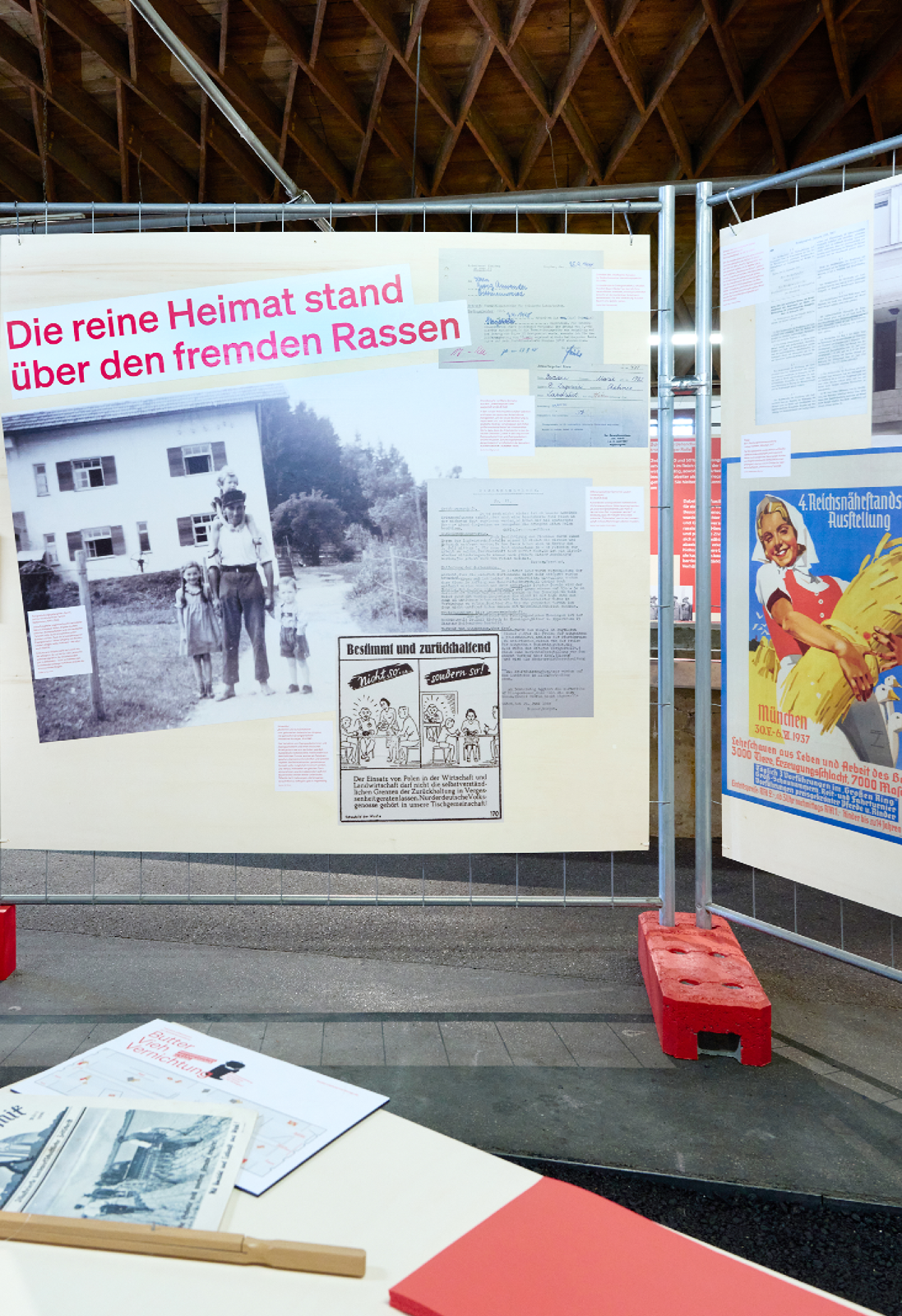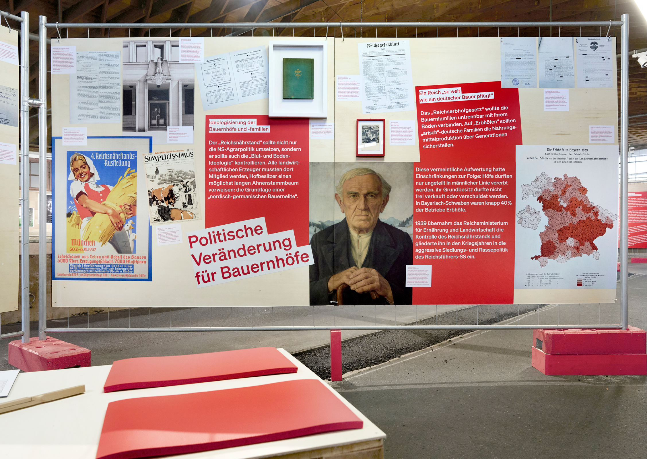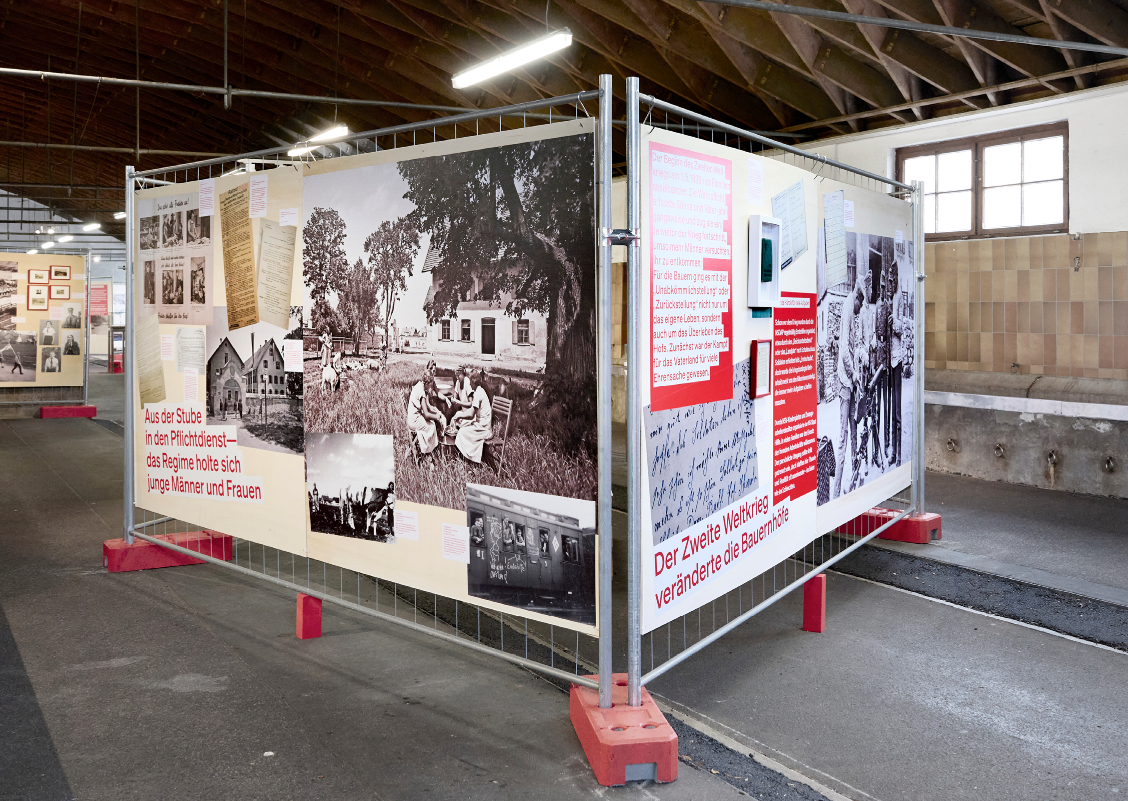 Projektleiterin Veronika Heilmannseder und ihr Team haben unzählige historische Zeugnisse zusammengetragen und in fünf Themen gebündelt, die wir als Grundlage für unser Szenografie-Konzept aufgreifen. Als zentrale Gestaltungselemente wählen wir handelsübliche, mit Holzplatten bestückte Bauzäune und Paletten, die wir zu „Stube“, „Stall“, „Dorfplatz“, „Produktionsort“ und „Gewaltort“ gruppieren. Auf den Wänden stellen wir ganz unterschiedliche Exponate zusammen: Reproduktionen von Plakaten, Anschlägen, Dokumenten und Fotos lassen sich großflächig aufkleistern; Faksimile, originale Dokumente, sowie Objekte werden gerahmt und dazu collagiert.