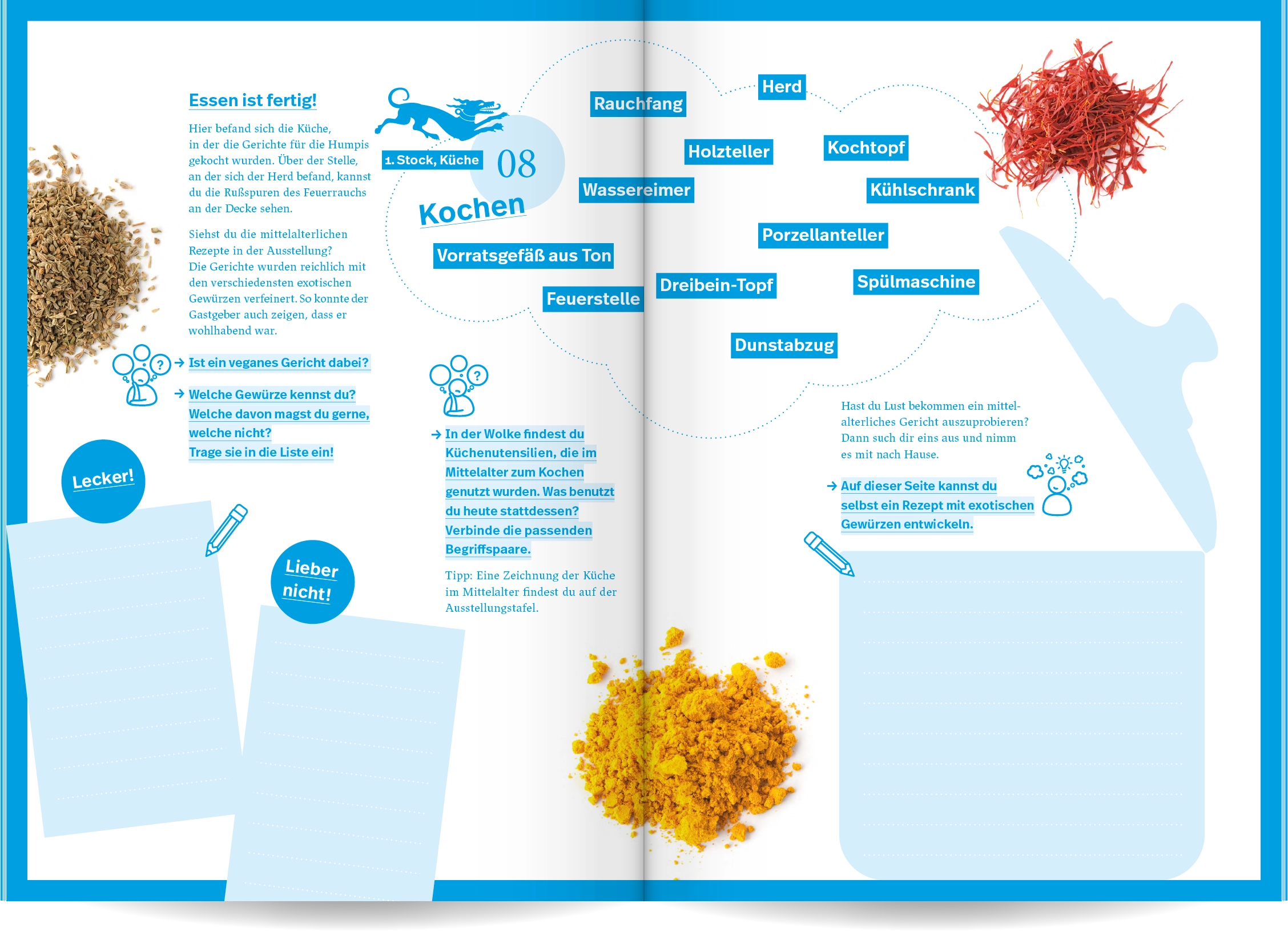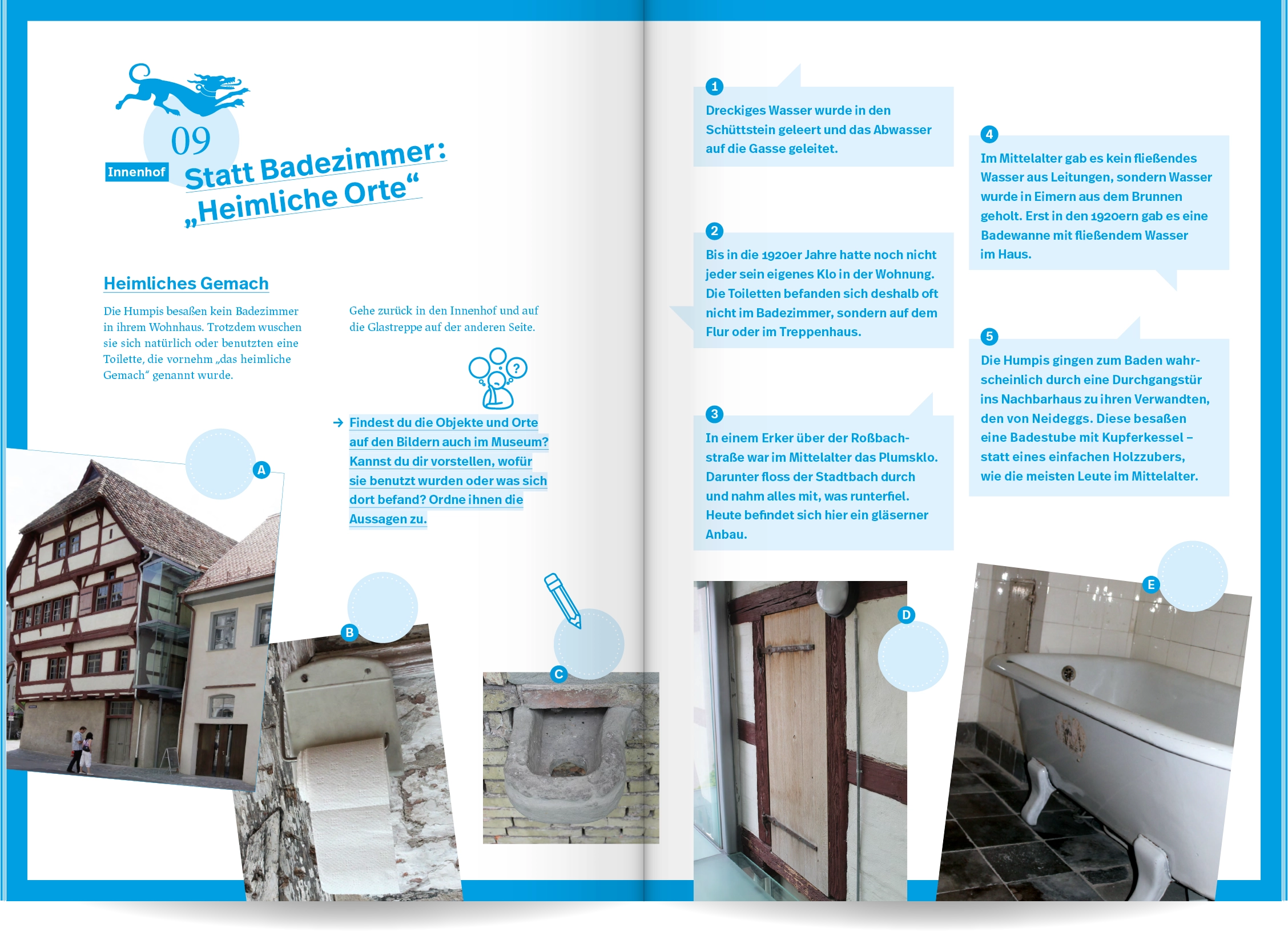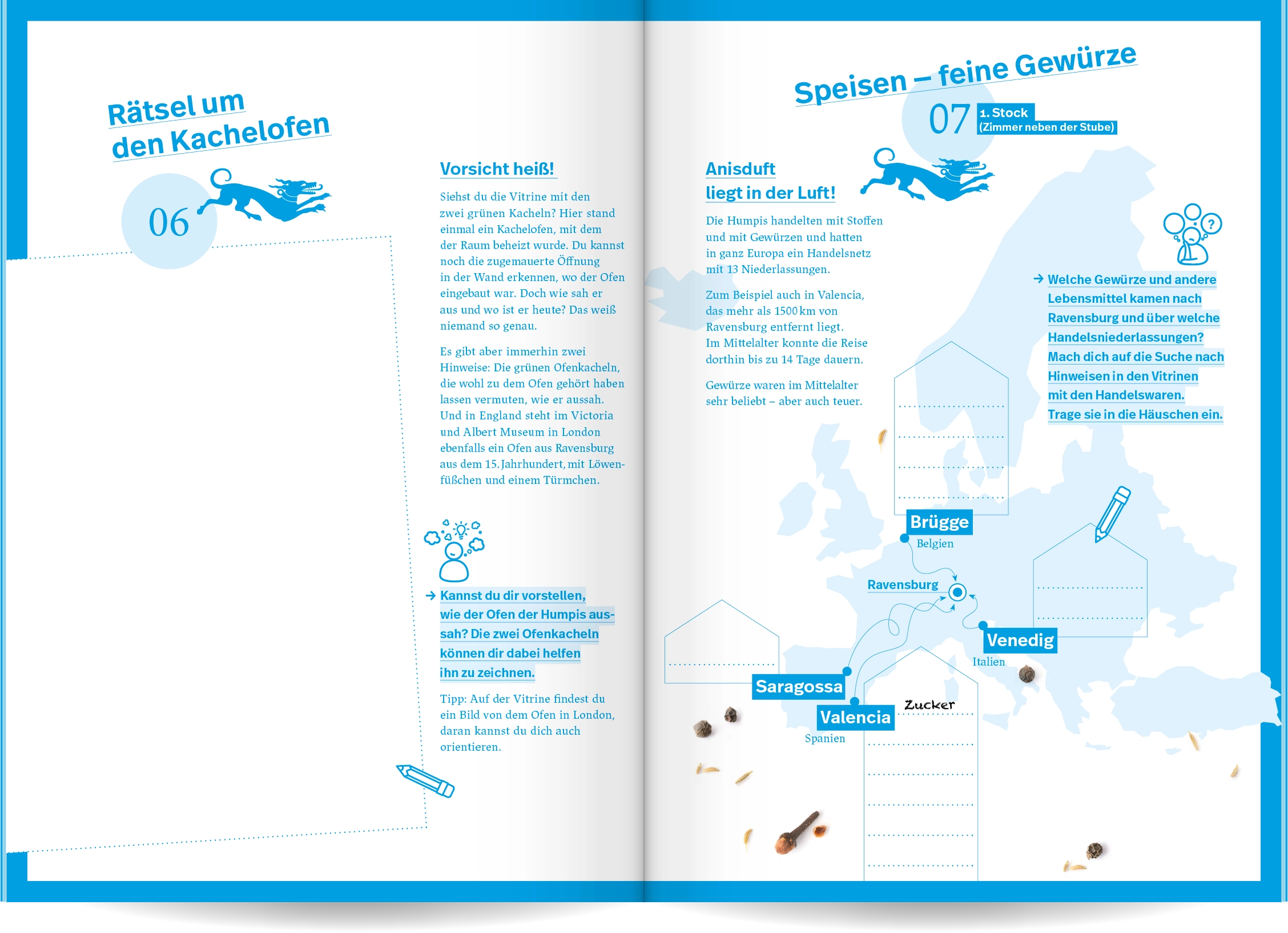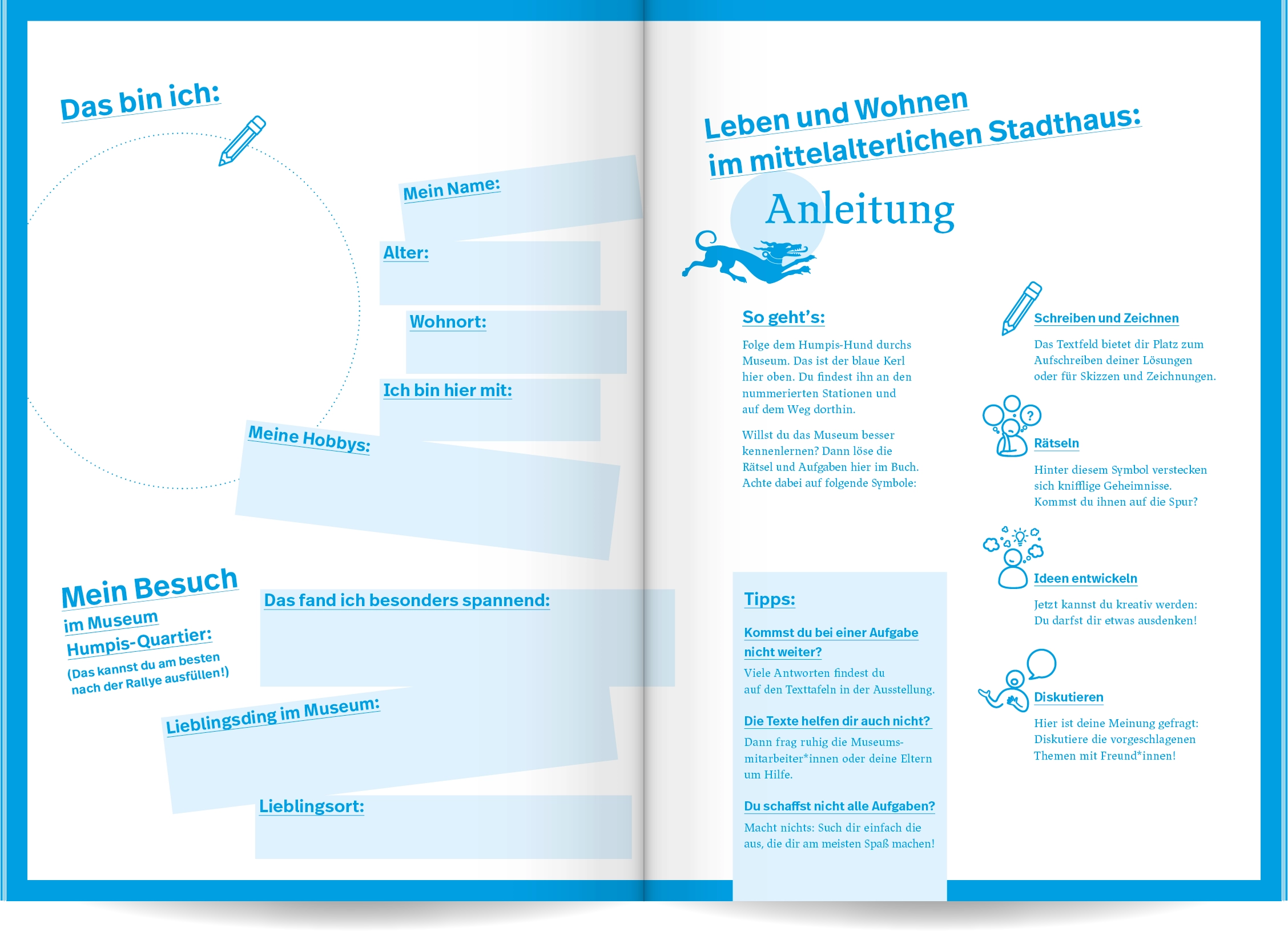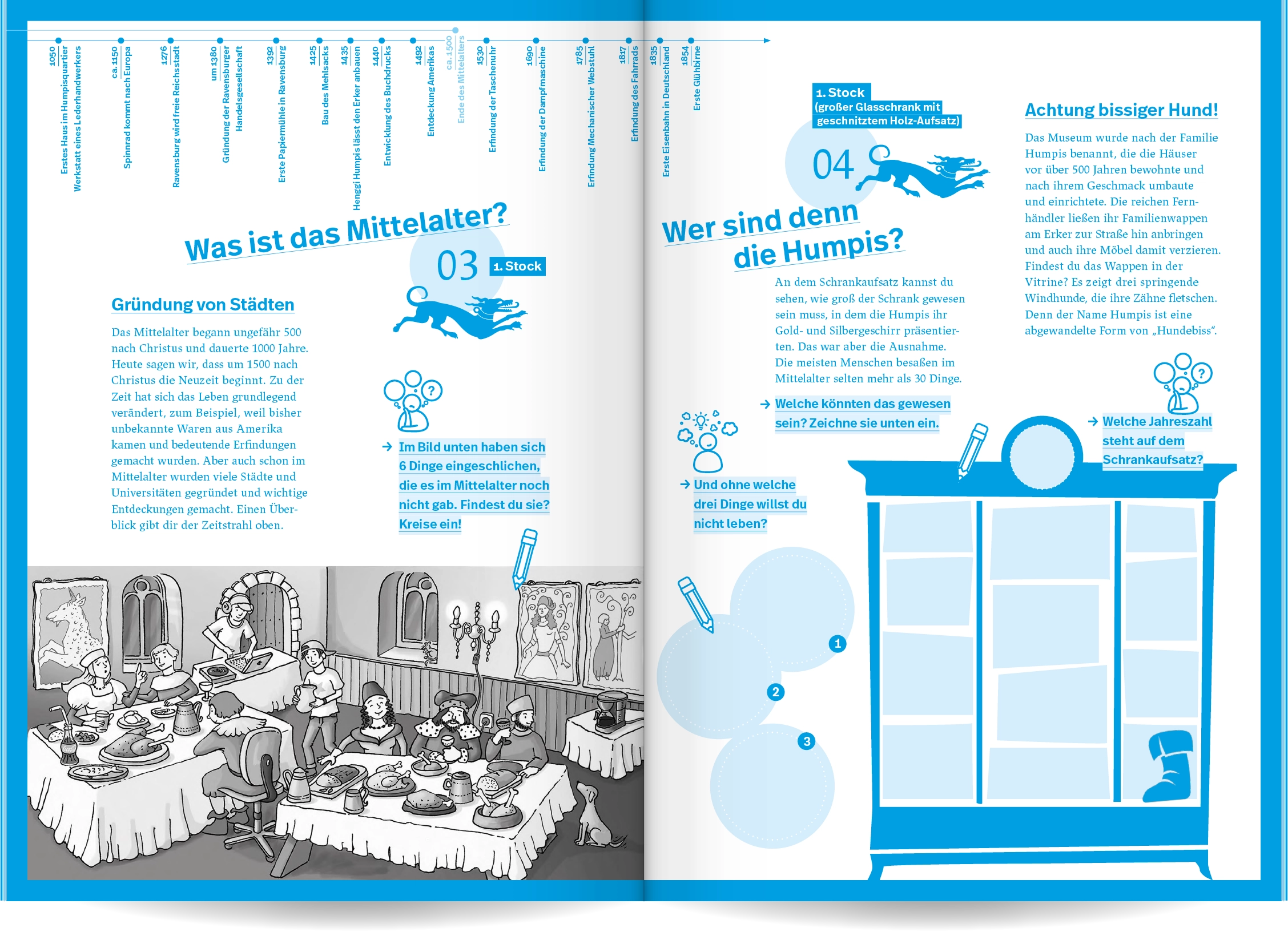 Ein spielerisch gestaltetes Workbook mit Rätseln, Zeichenaufgaben und viel Raum für eigene Ideen macht Kindern Lust, das mittelalterliche Humpis Quartier auf eigene Faust zu erkunden und herauszufinden, wie die Ravensburger:innen früher gewohnt und gelebt haben.