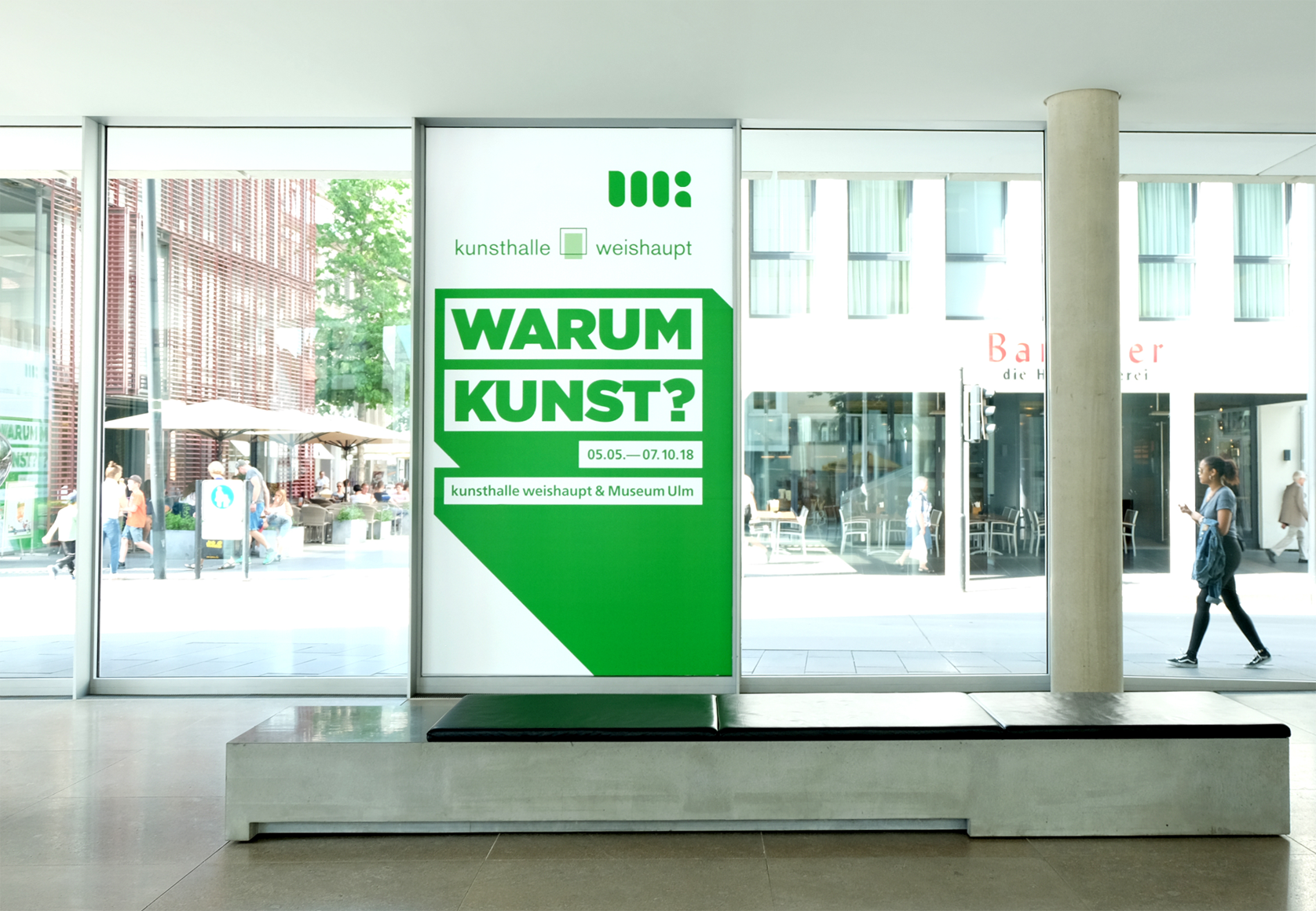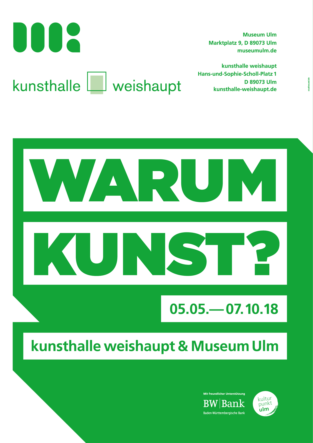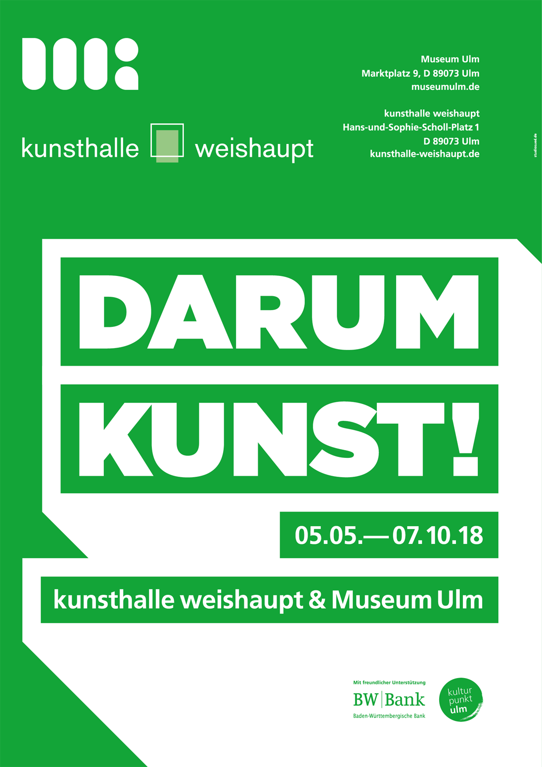 Für das Museum Ulm haben wir ein flexibles Identity-System entwickelt, das für die Institution selbst und die Kommunikation der einzelnen Ausstellungen funktioniert. Das Mehrspartenhaus am Ulmer Marktplatz verfolgt einen aktiven Bildungsauftrag und versteht Kunst als Anstoß, Stolperstein und Erlebnis. Kunst möchte in die Mitte der Gesellschaft getragen werden. Entsprechend offensiv, markant und laut gestalten wir den visuellen Auftritt mit kräftigen, reinen Farben, klaren Formen und Ebenen sowie plakativen Schriften. Ein stark abstrahiertes M wird zum Logo, das für die moderne Haltung des Museums steht; der folgende Doppelpunkt kündigt an und verheißt, meint Offenheit und Diskursbereitschaft.